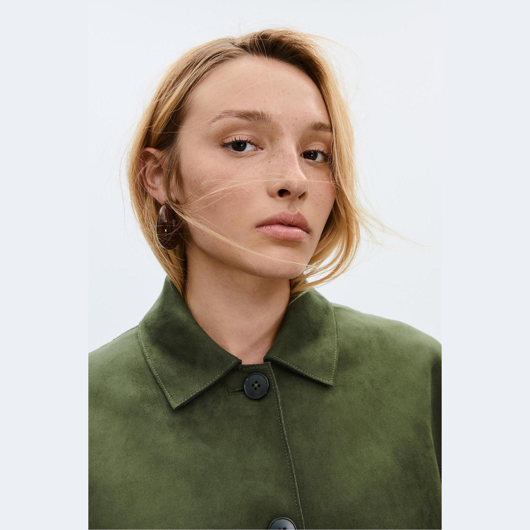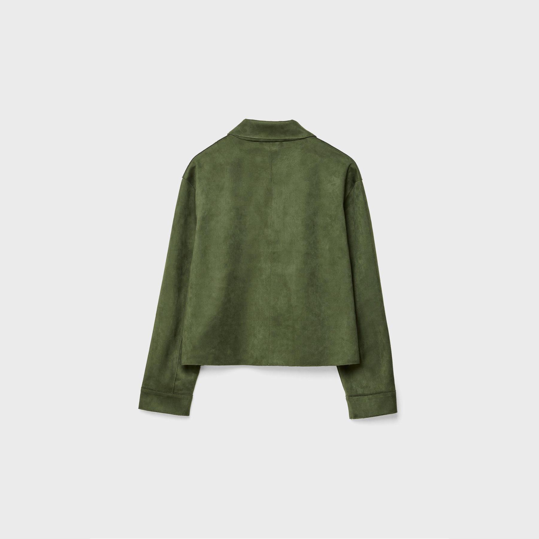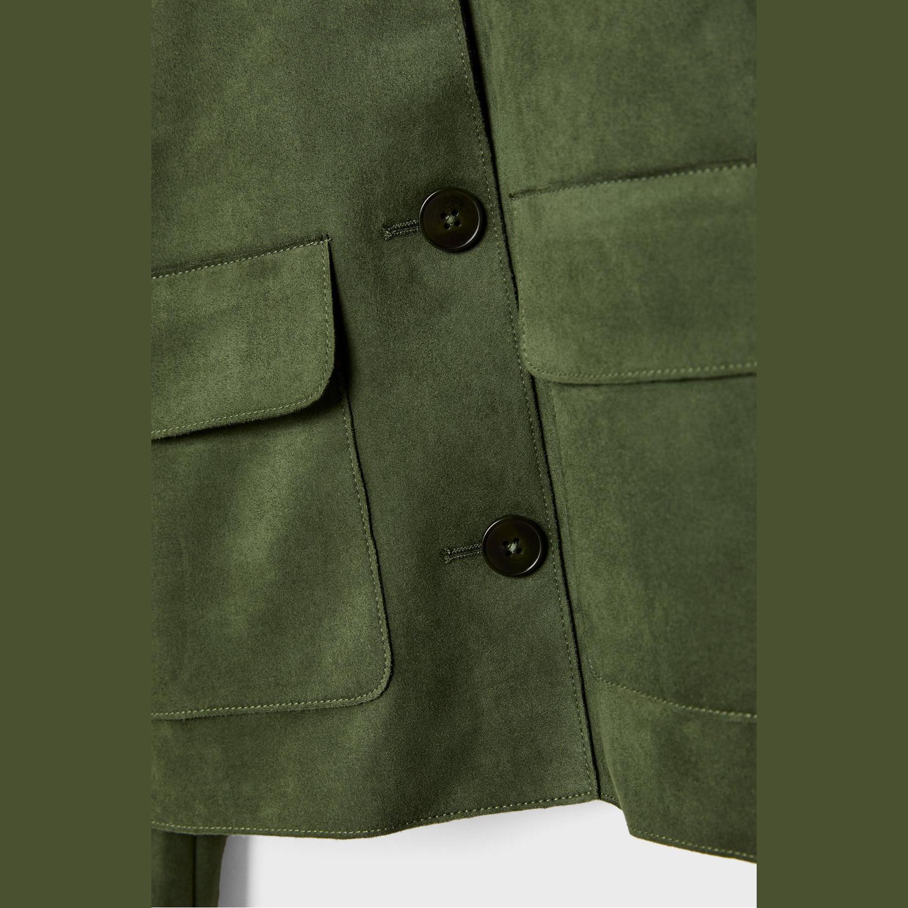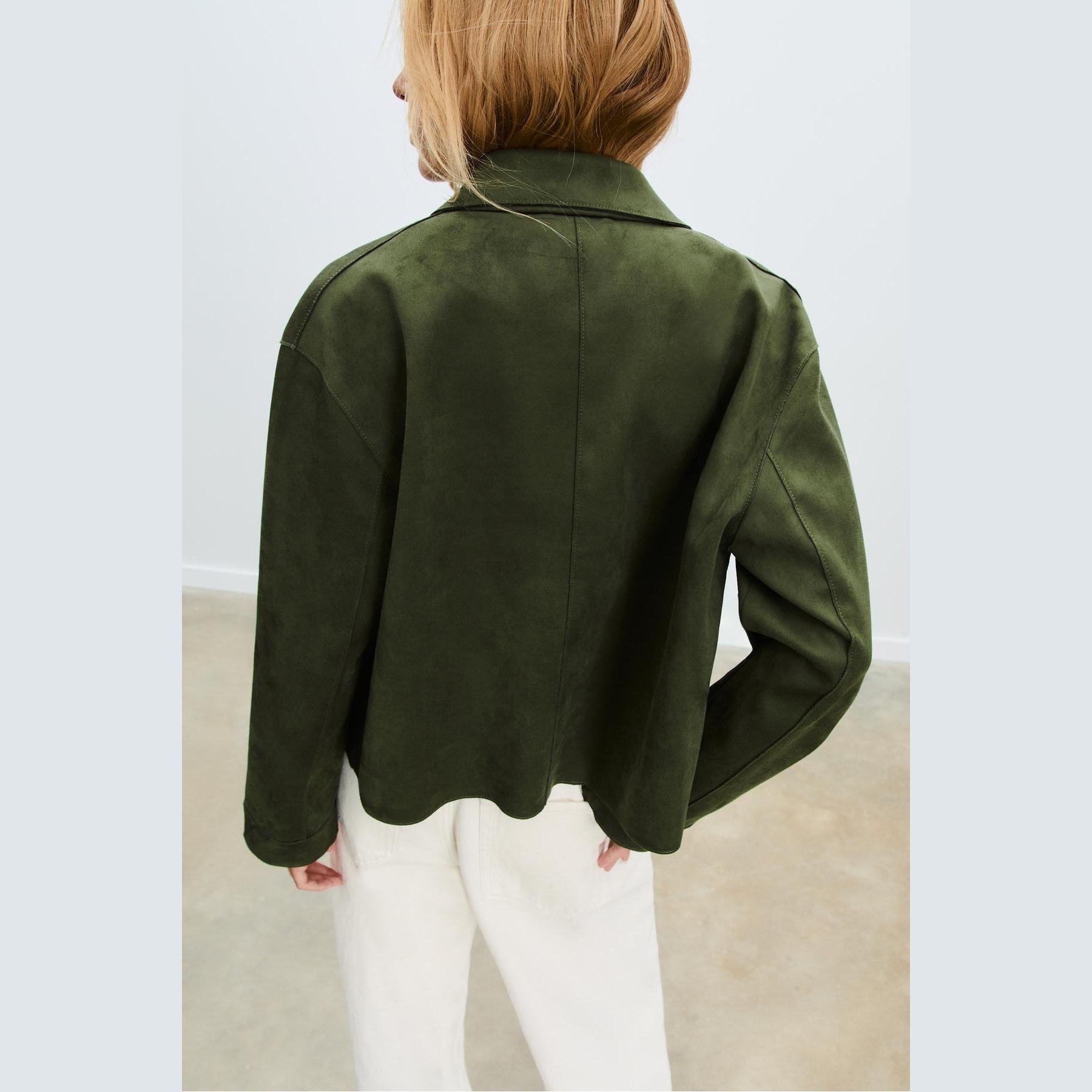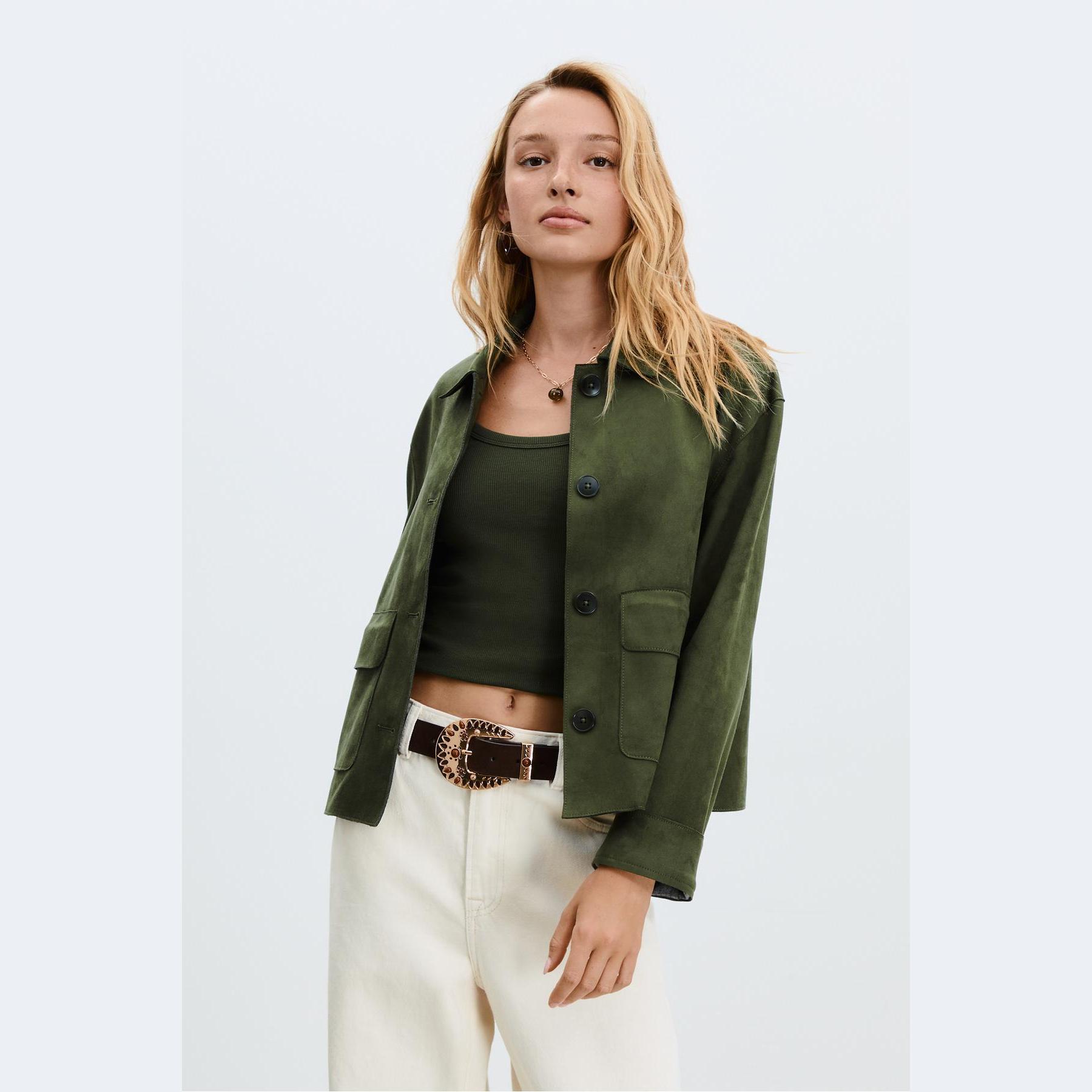 جاكيت أنيق من Stradivarius بلون أخضر داكن، مصنوع من خامة شمواه صناعي بتركيبة 88% بوليستر، 12% إيلاستان، يتميز بقصة Regular Fit، ياقة بليزر كلاسيكية، أكمام طويلة، إغلاق أمامي بأزرار، مزود بجيبين أماميين بغطاء، تصميم سادة بملمس شمواه ناعم، بدون بطانة، مثالي للتنسيق مع بنطال جينز أو تنورة لإطلالة خريفية أو يومية أنيقة.