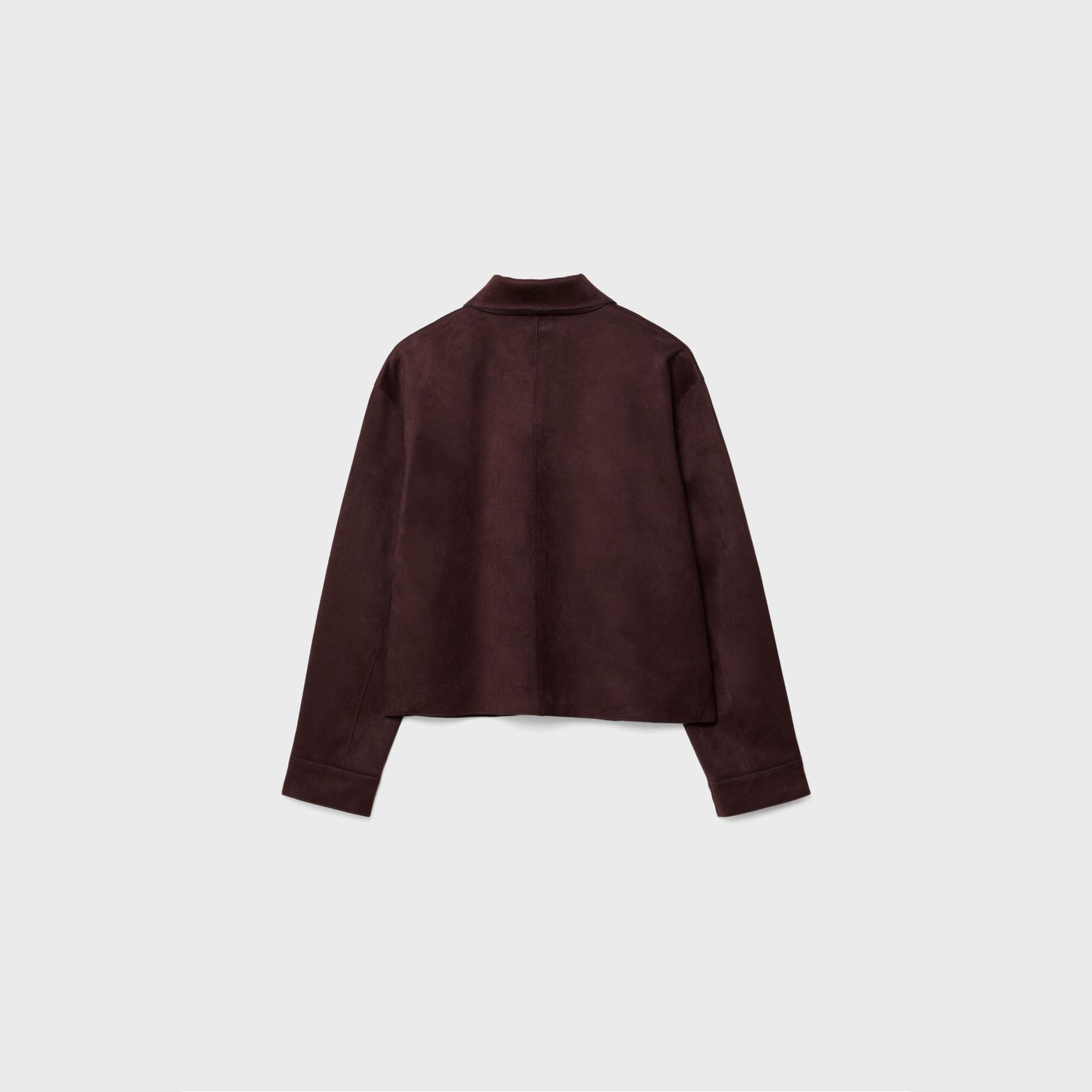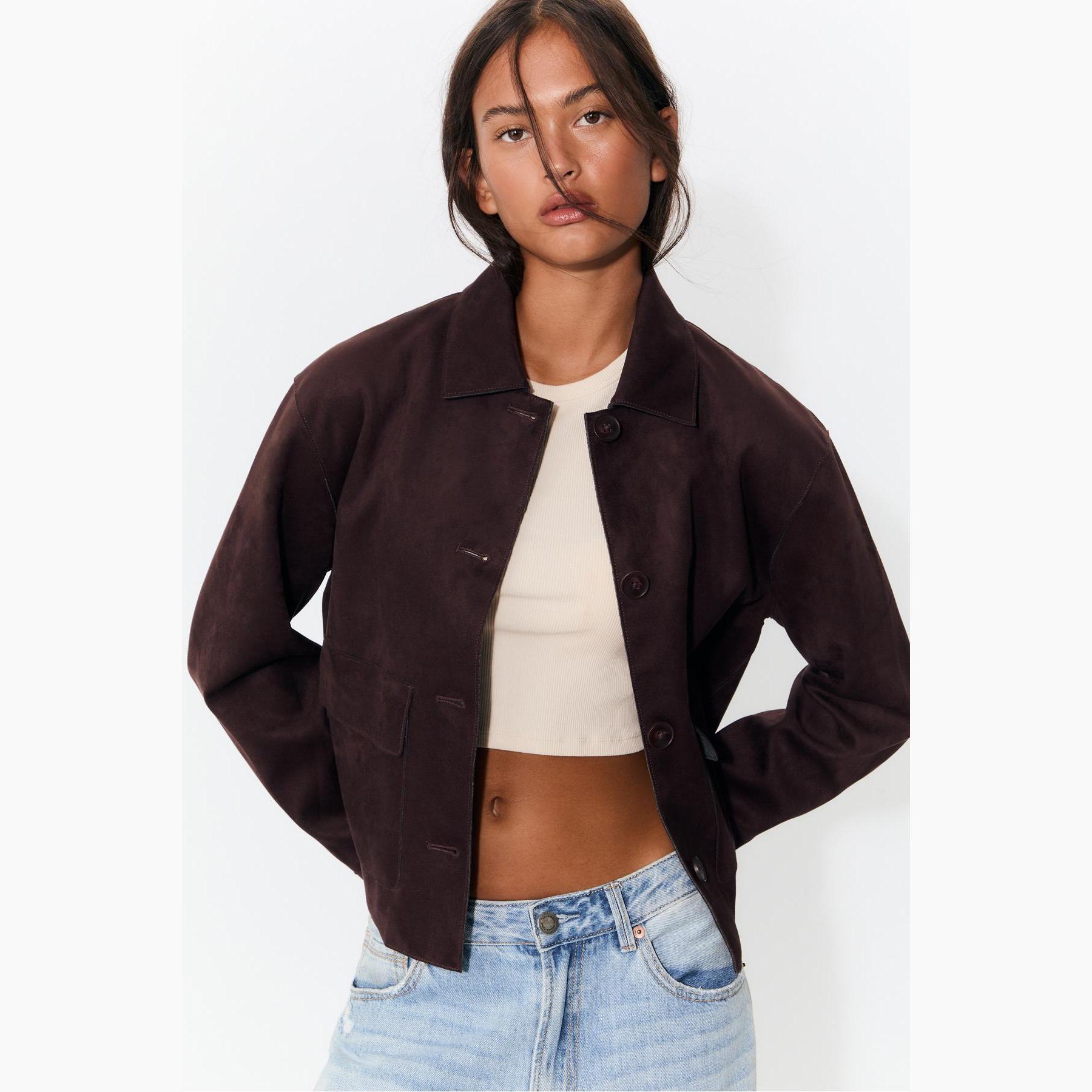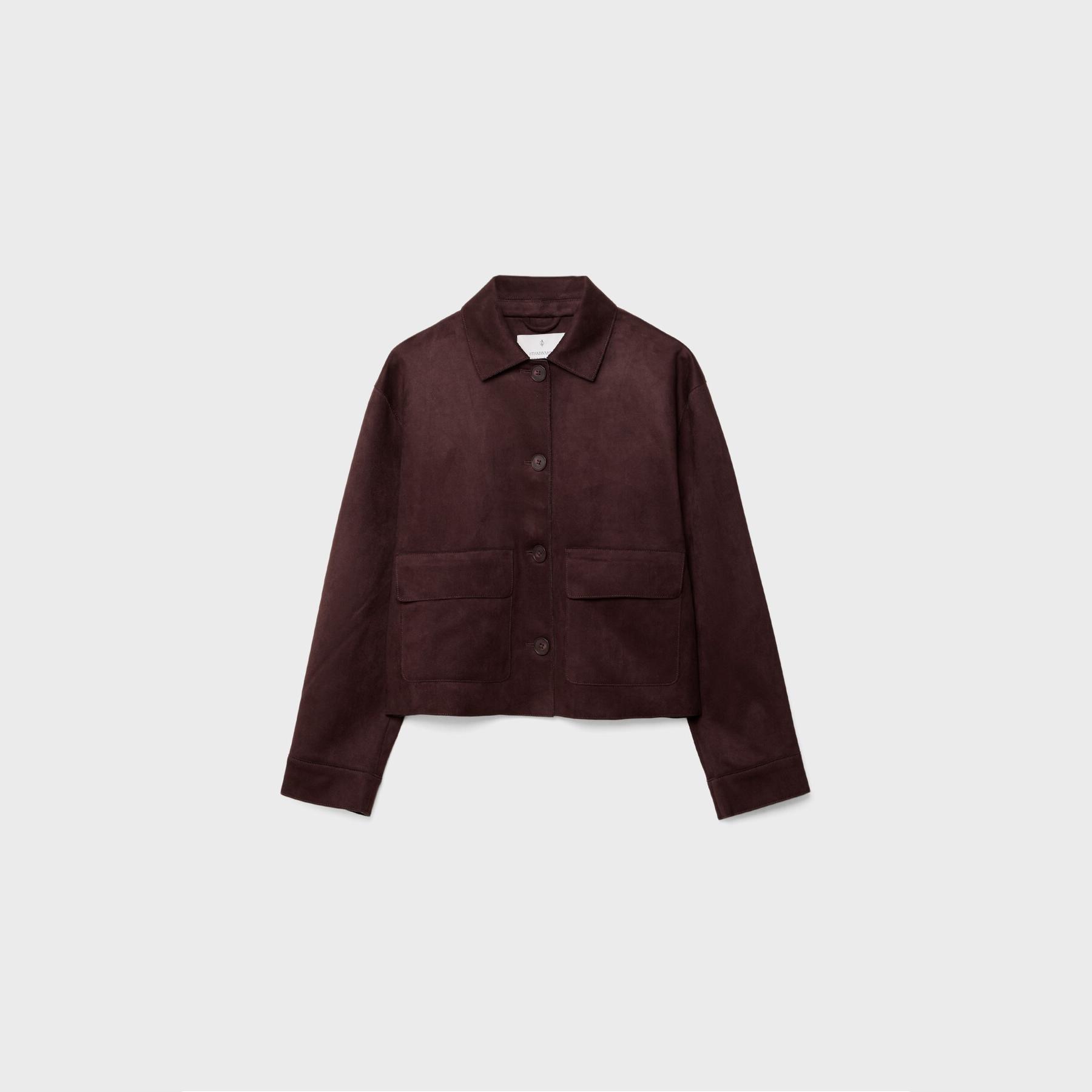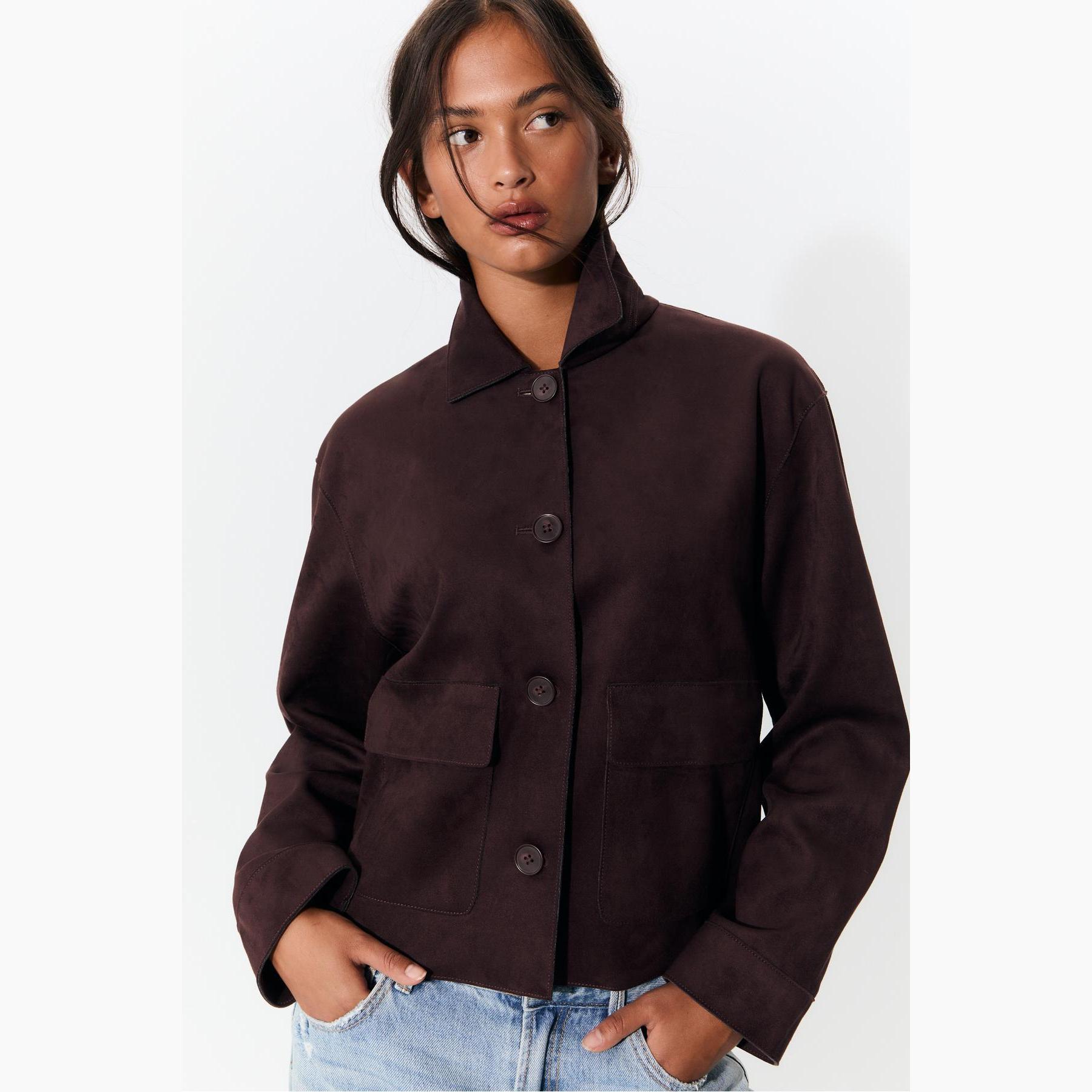جاكيت أنيق من Stradivarius بلون بوردو، مصنوع من خامة شمواه صناعي بتركيبة 88% بوليستر، 12% إيلاستان، يتميز بقصة Regular Fit، ياقة ديكولتيه منسدلة، أكمام طويلة، إغلاق أمامي بأزرار، مزود بجيبين أماميين بغطاء، تصميم سادة بملمس ناعم، بدون بطانة، مثالي للتنسيق مع بنطال جينز أو تنورة لإطلالة خريفية أو يومية أنيقة.