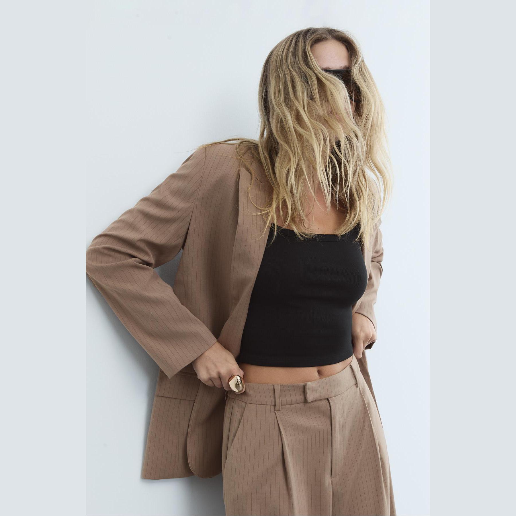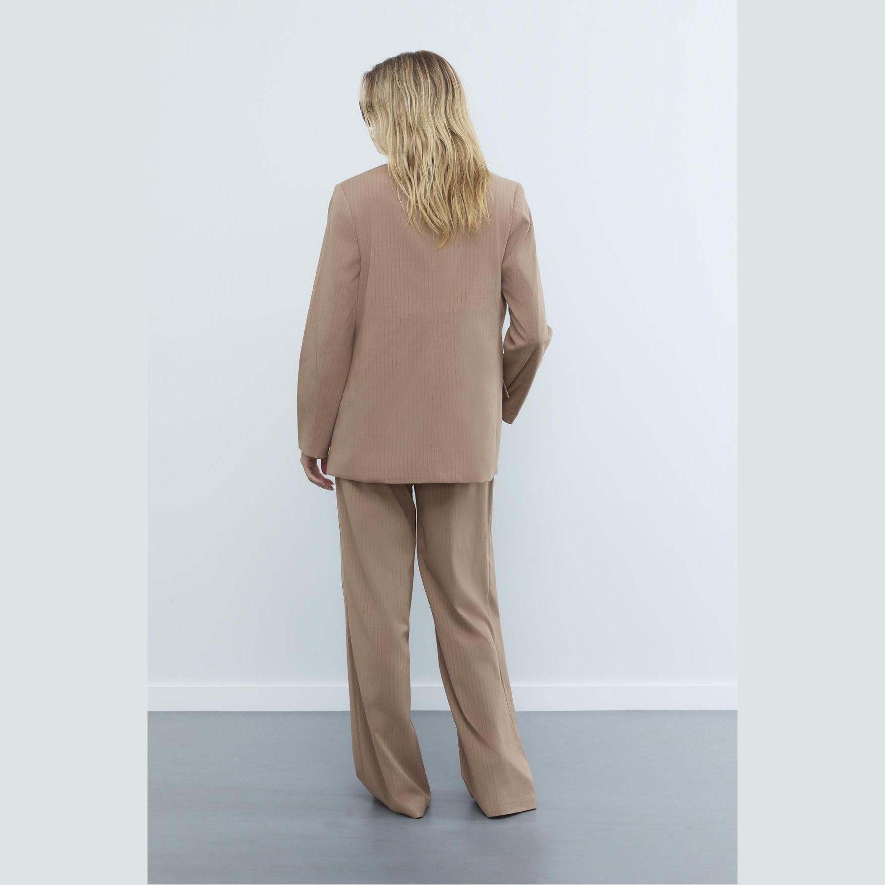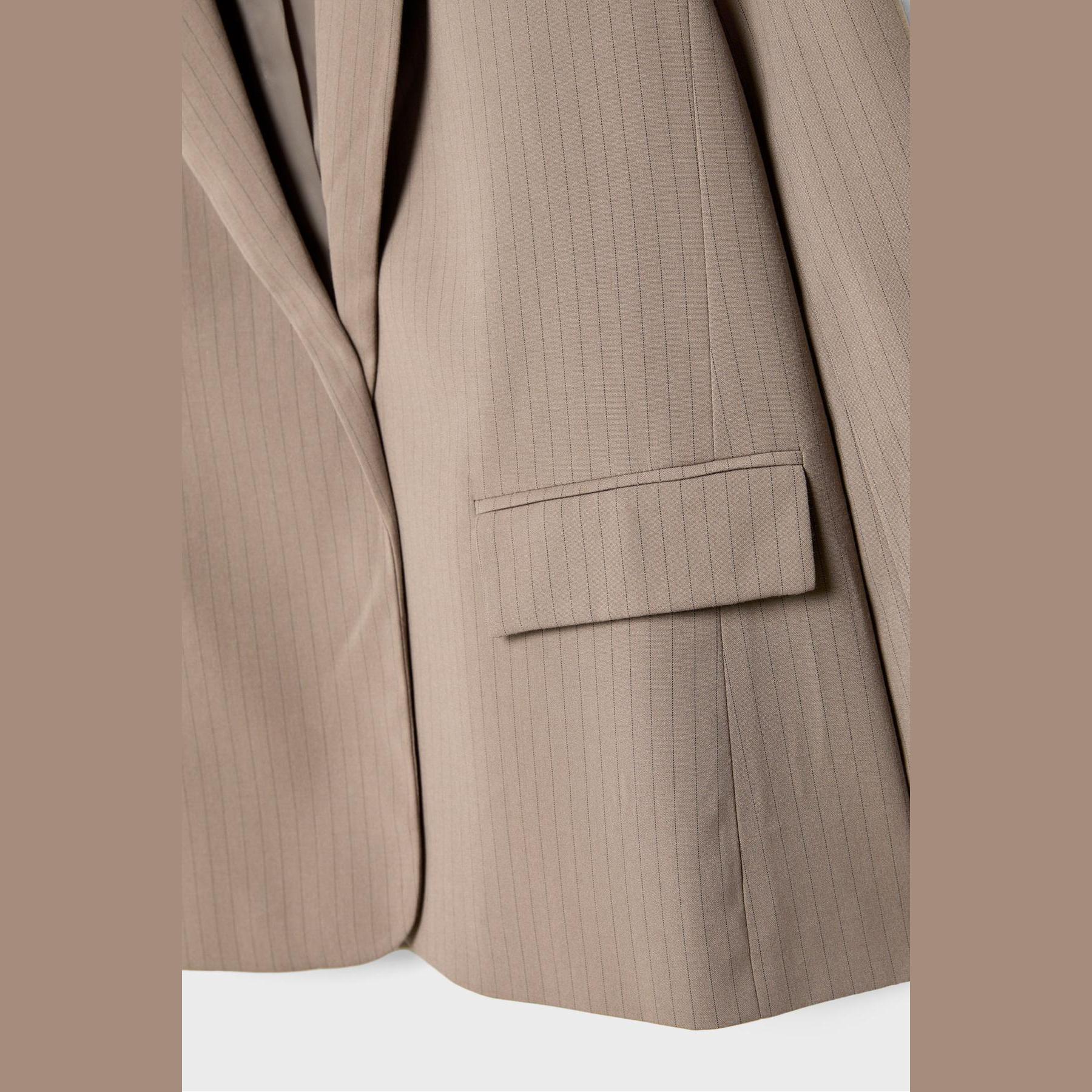 بليزر أنيق من Stradivarius بلون بيج بنقشة خطوط دقيقة، مصنوع من خامة مرنة بتركيبة 69% بوليستر، 29% فيسكوز، 2% إيلاستان، يتميز بقصة مستقيمة Straight Fit، ياقة كلاسيكية مطوية، أكمام طويلة، تصميم مفتوح بدون إغلاق أمامي، مزود بجيوب ديكورية بغطاء، ملمس منسدل ناعم، مبطّن بالكامل، مثالي للتنسيق مع بنطال جينز أو تنورة لإطلالة يومية أو مكتبية أنيقة.
