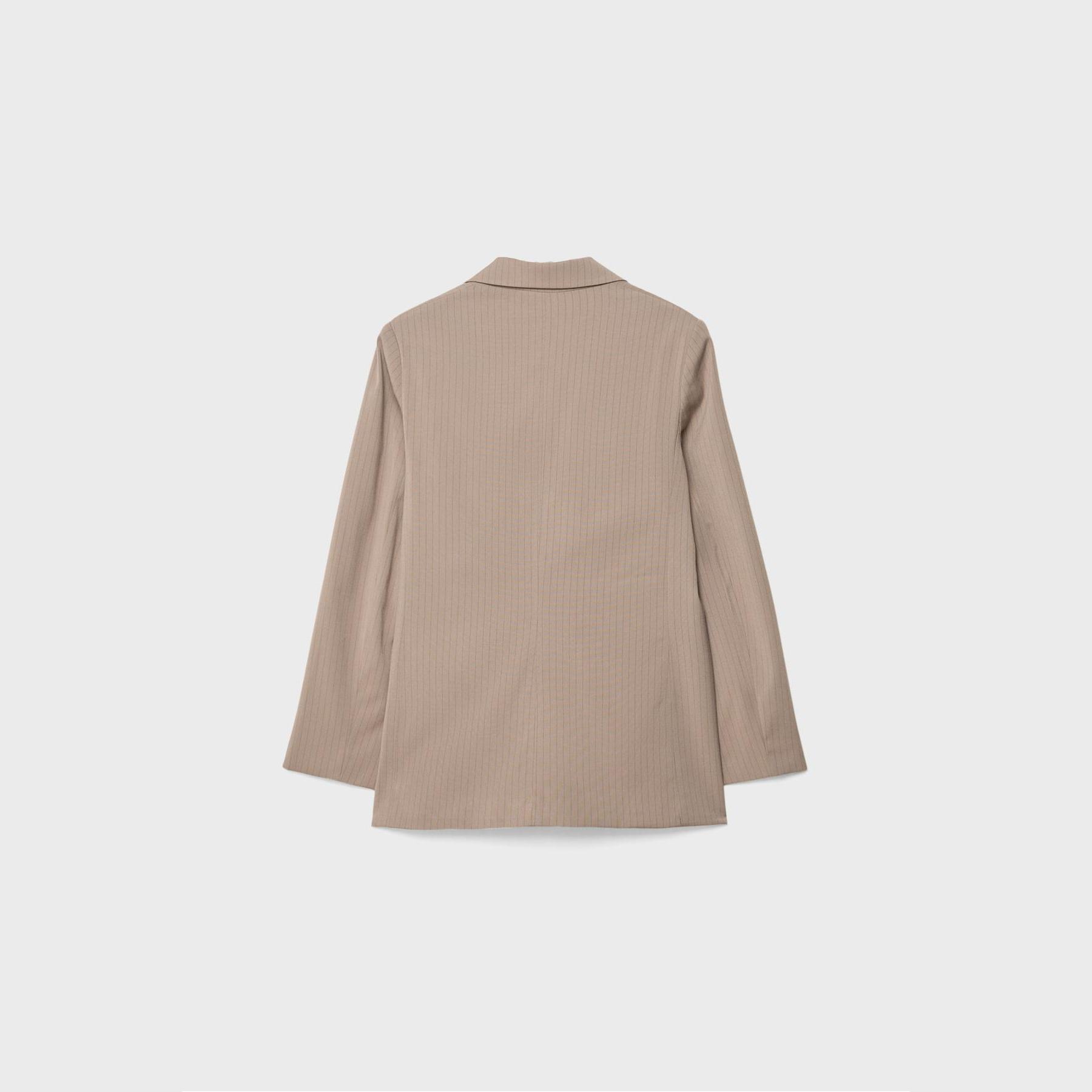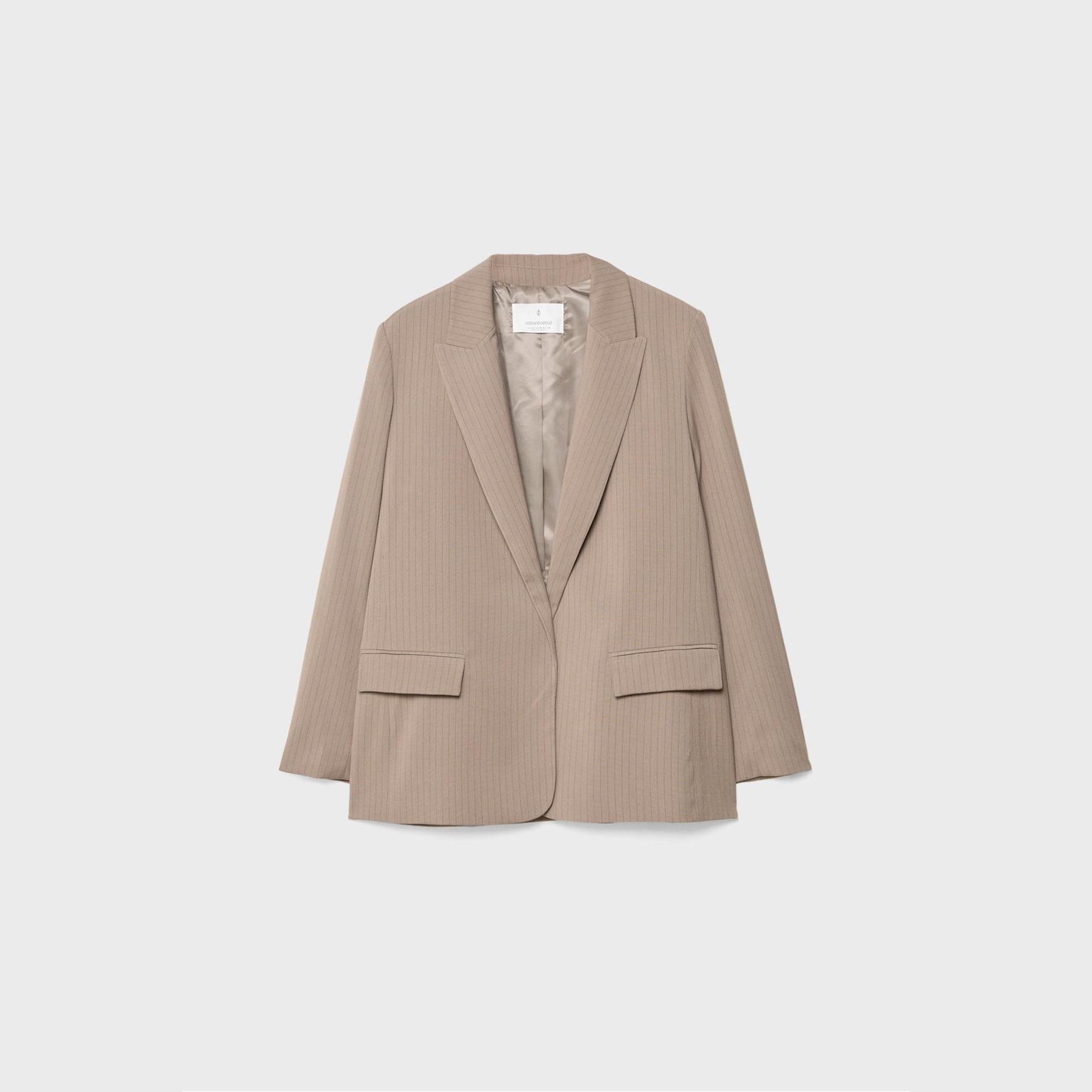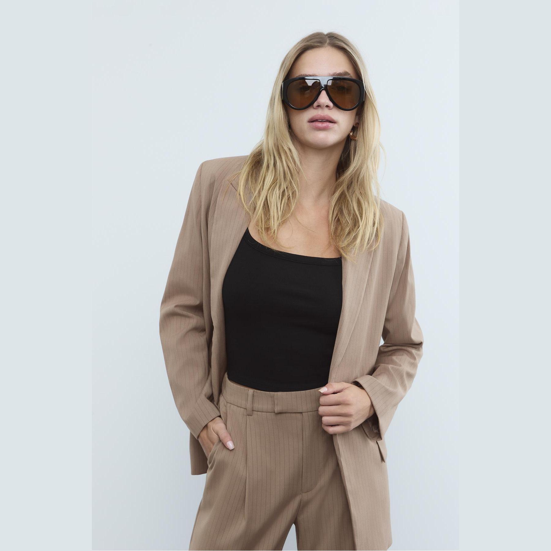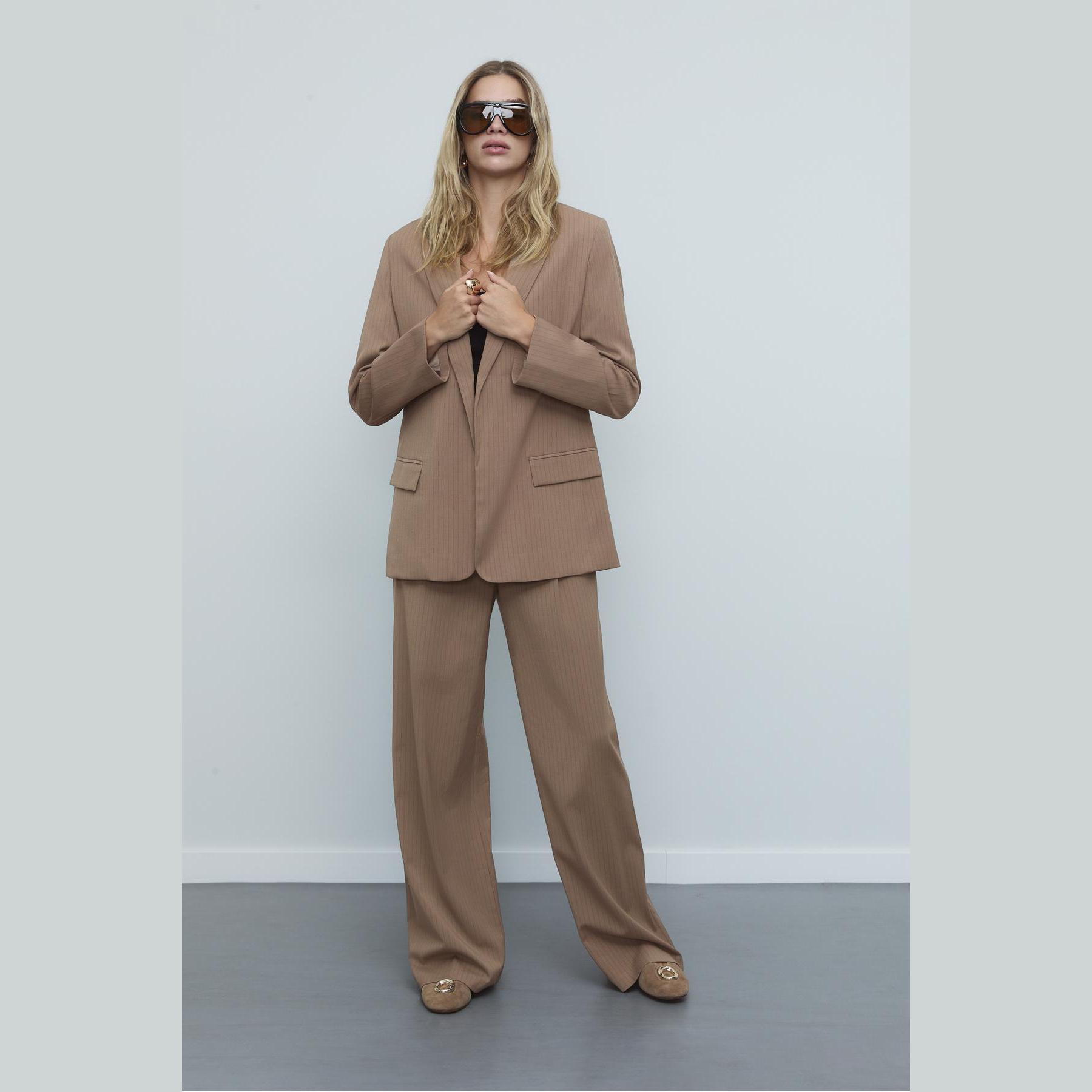 بليزر أنيق من Stradivarius بلون بيج بنقشة خطوط دقيقة، مصنوع من خامة مرنة بتركيبة 69% بوليستر، 29% فيسكوز، 2% إيلاستان، يتميز بقصة مستقيمة Straight Fit، ياقة كلاسيكية مطوية، أكمام طويلة، تصميم مفتوح بدون إغلاق أمامي، مزود بجيوب ديكورية بغطاء، ملمس منسدل ناعم، مبطّن بالكامل، مثالي للتنسيق مع بنطال جينز أو تنورة لإطلالة يومية أو مكتبية أنيقة.