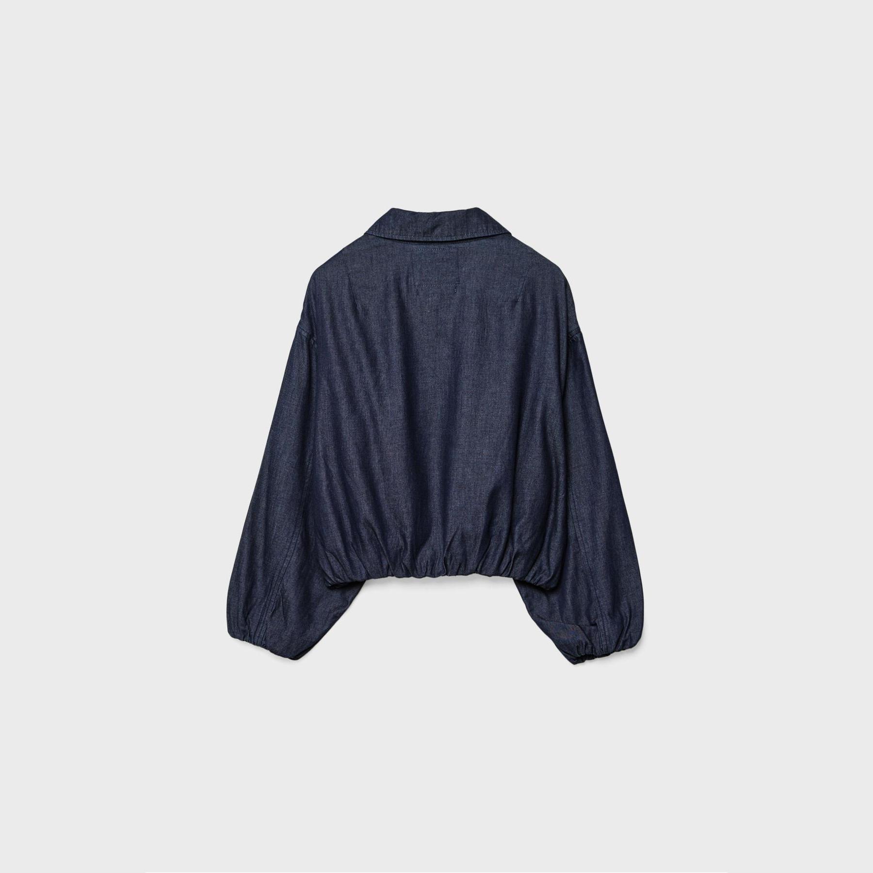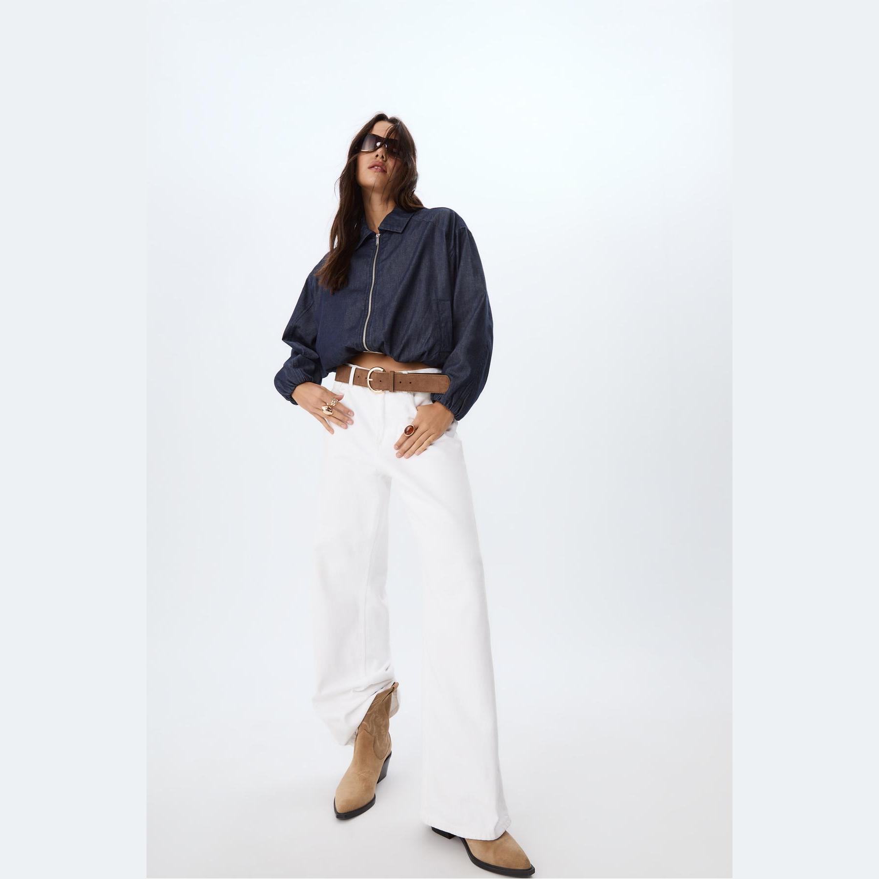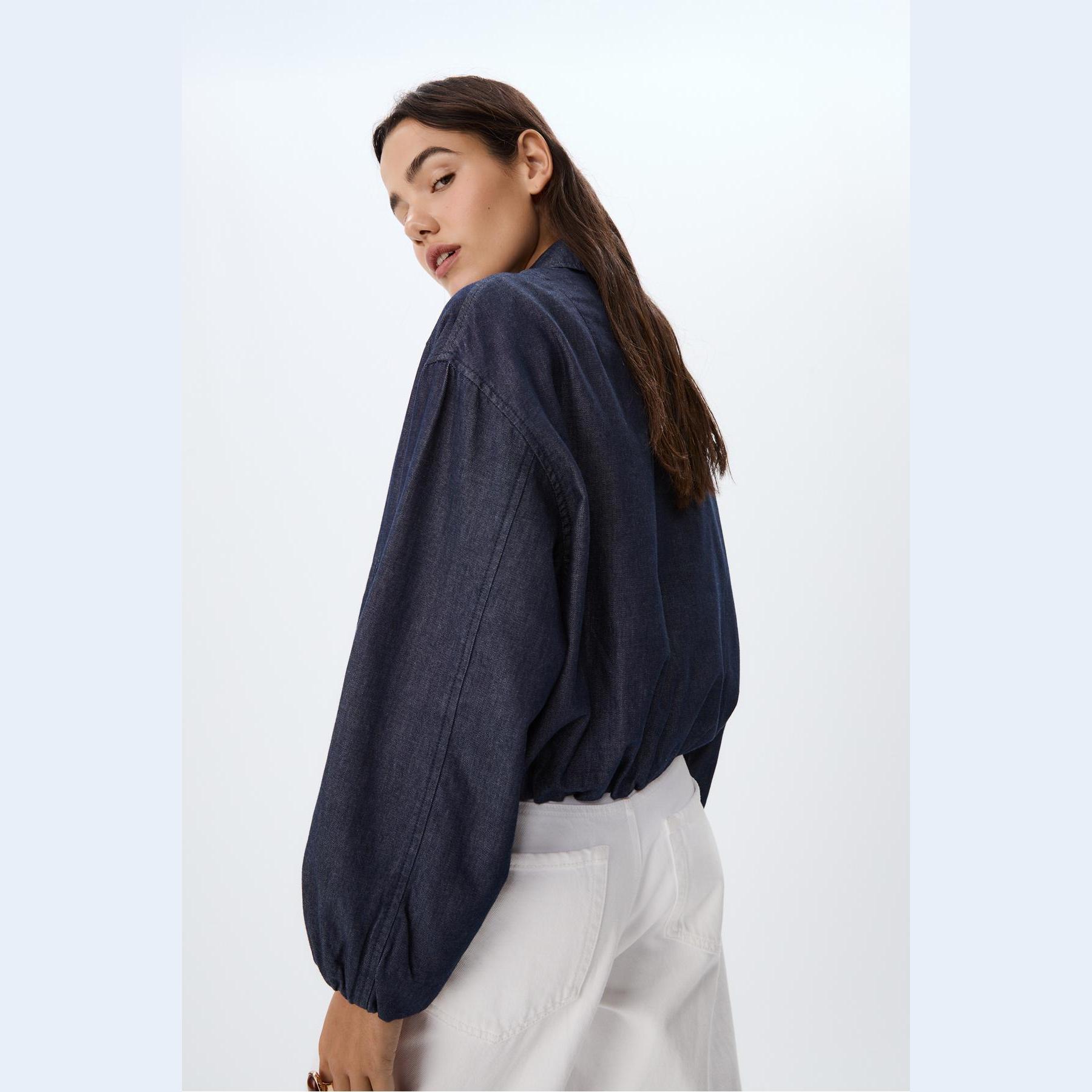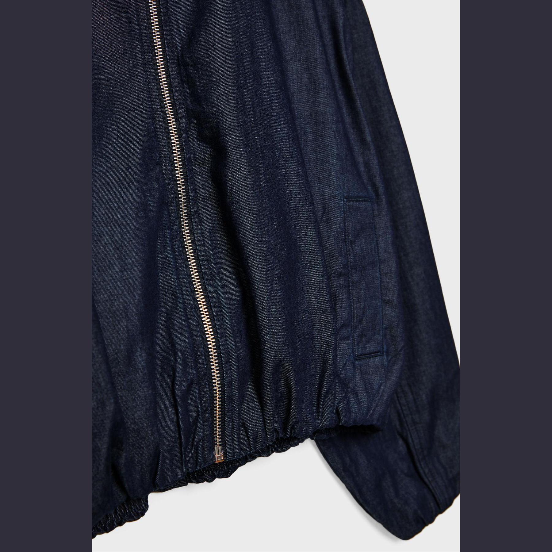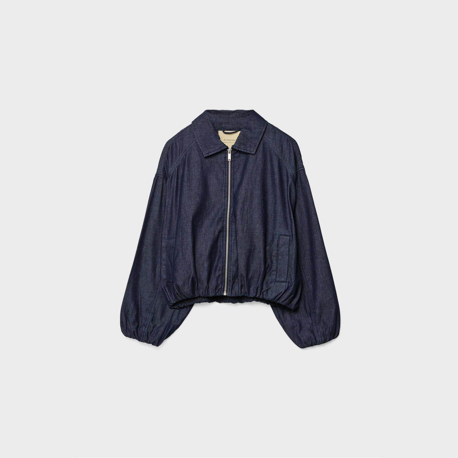 جاكيت بومبر أنيق من Stradivarius بلون كحلي، مصنوع من خامة دنيم 100% قطن، يتميز بقصة Oversize، ياقة مستقيمة، أكمام طويلة بكشكشة خفيفة وأساور مطاطية، إغلاق أمامي بسحاب معدني، مزود بجيوب جانبية بِييه، حافة سفلية مطاطية، تصميم سادة بملمس دنيم متين، بدون بطانة، مثالي للتنسيق مع بنطال جينز أو تنورة قصيرة لإطلالة يومية حضرية.