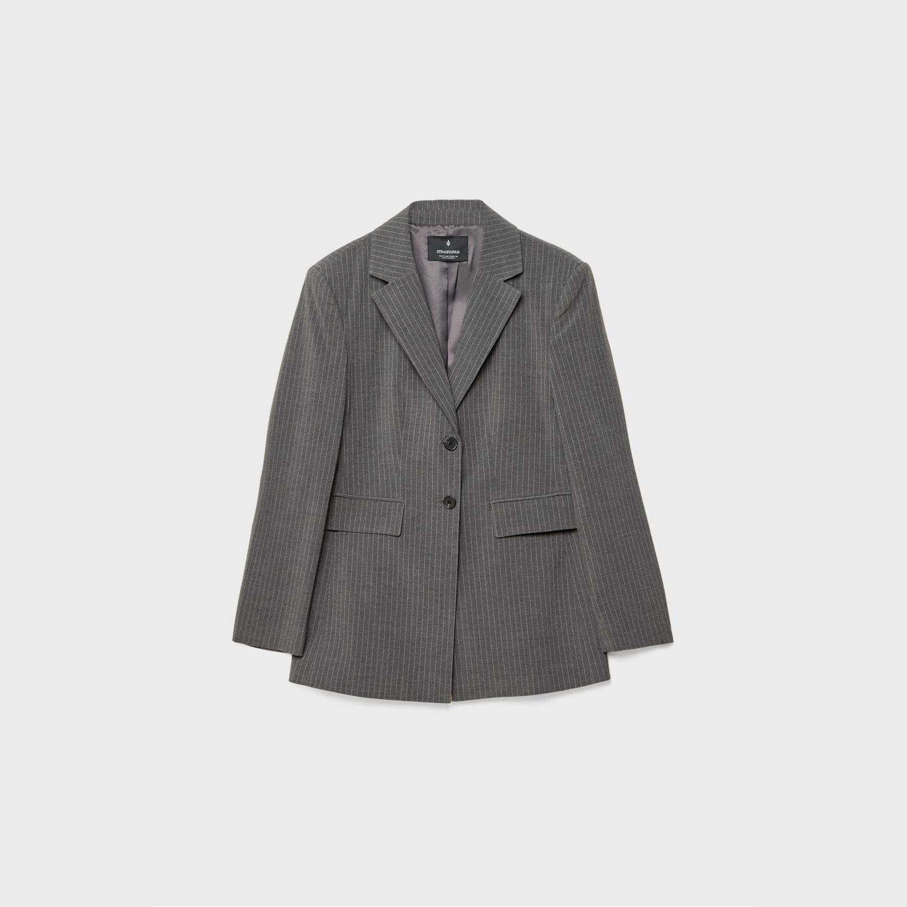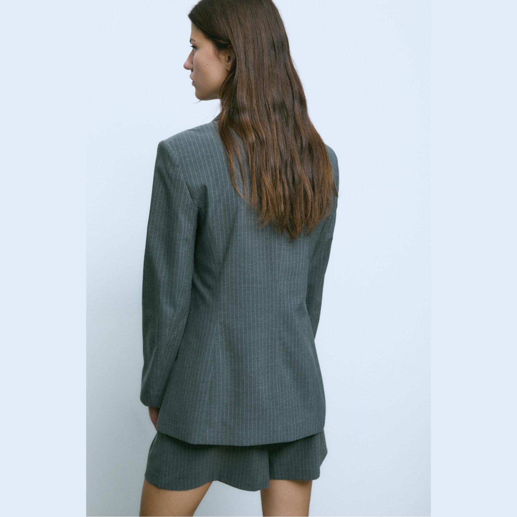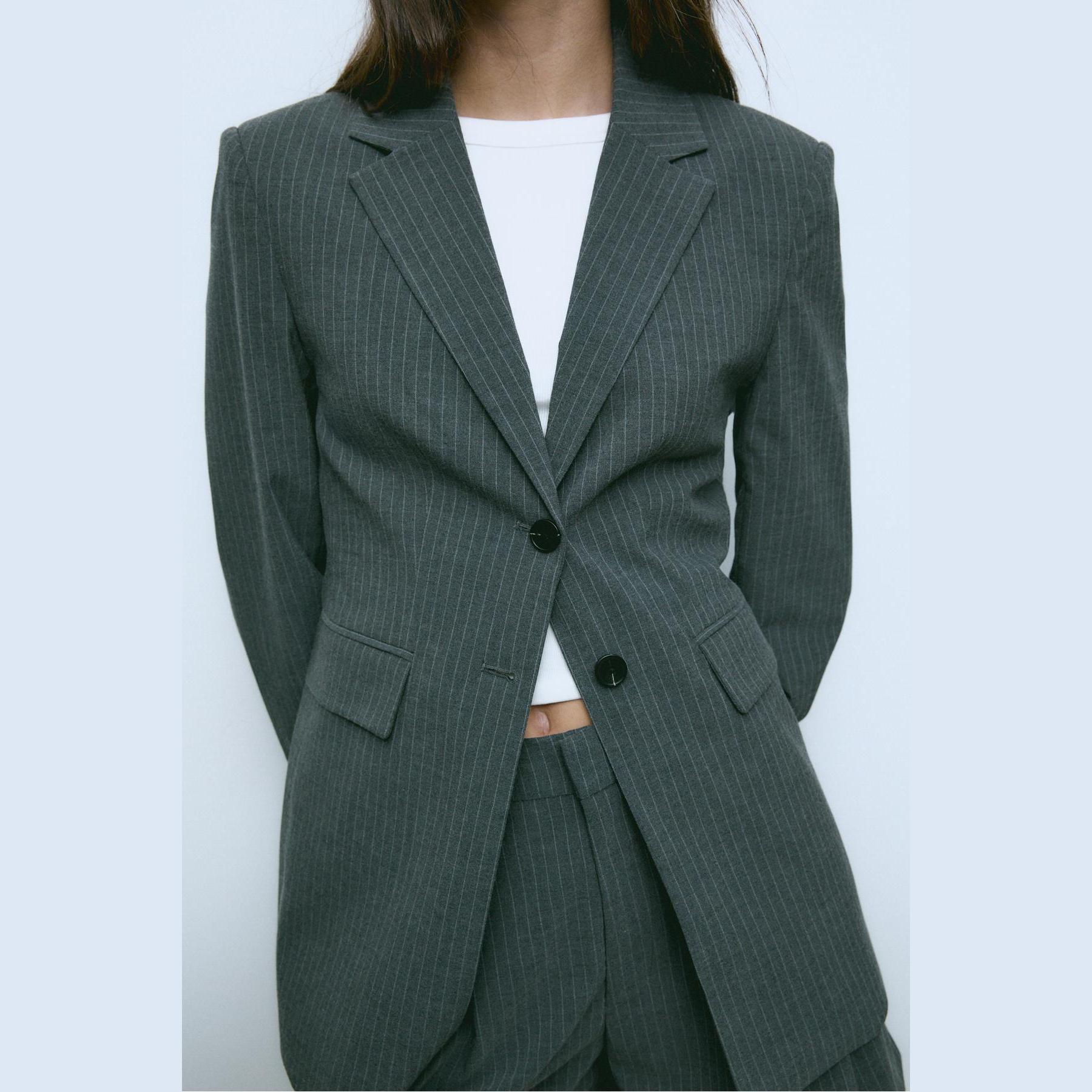 بليزر أنيق من Stradivarius بلون رمادي بنقشة خطوط، مصنوع من خامة مرنة بتركيبة 64% بوليستر، 34% فيسكوز، 2% إيلاستان، يتميز بقصة مستقيمة Straight Fit، ياقة كلاسيكية مطوية، أكمام طويلة، إغلاق أمامي بأزرار، مزود بجيوب أمامية بغطاء، تصميم مصقول بملمس ناعم، بدون بطانة، مثالي للتنسيق مع بنطال رسمي أو تنورة لإطلالة مكتبية أو يومية أنيقة.