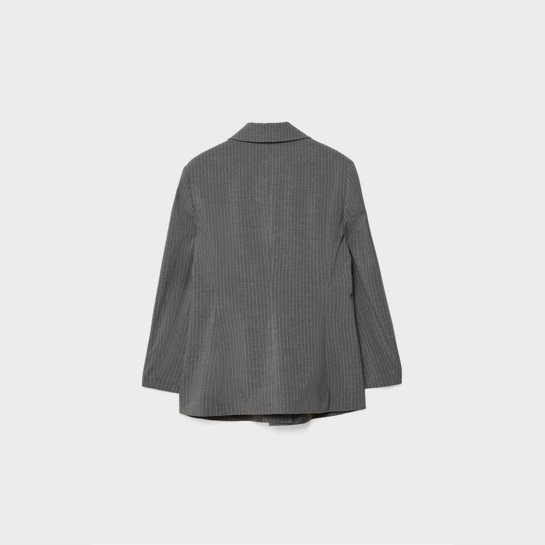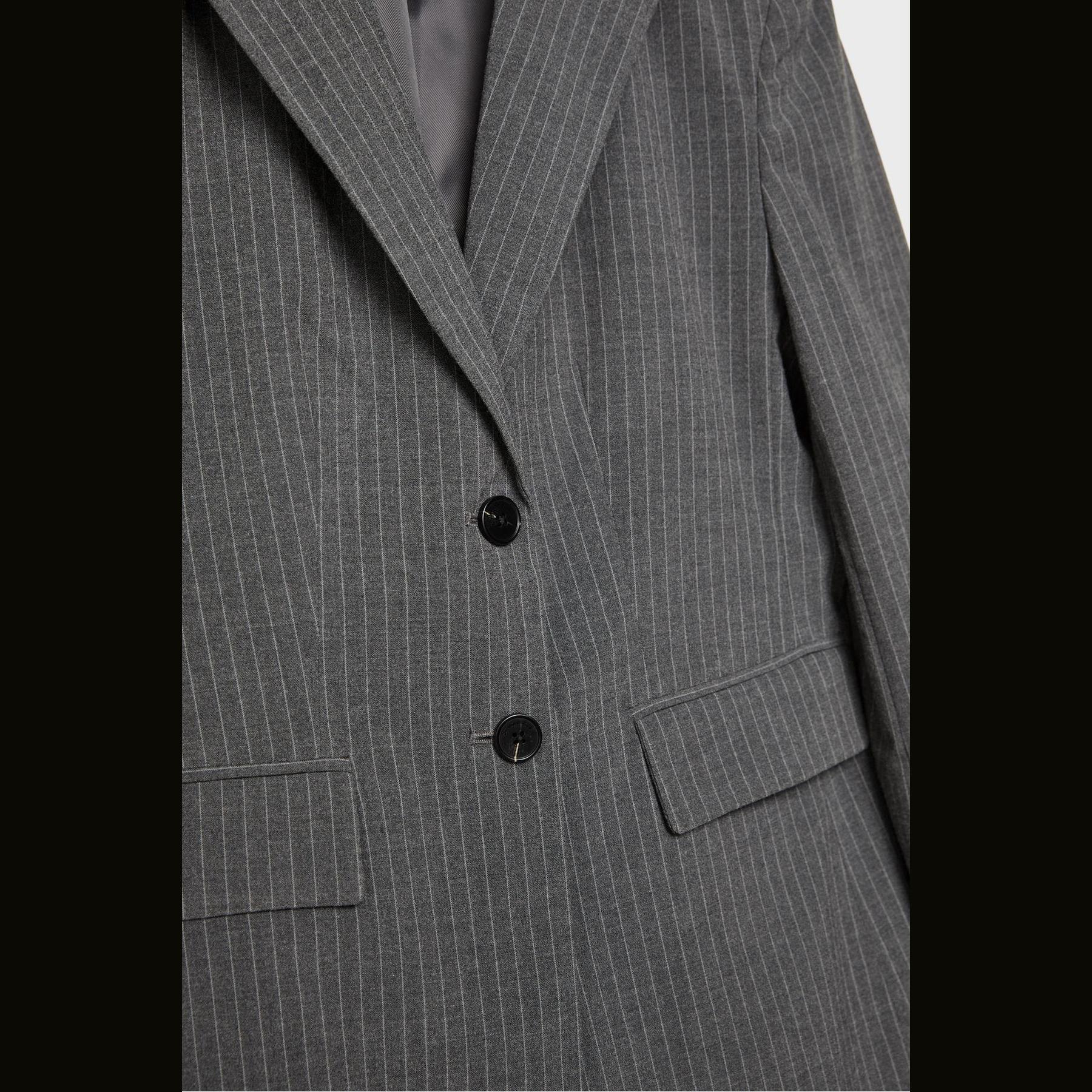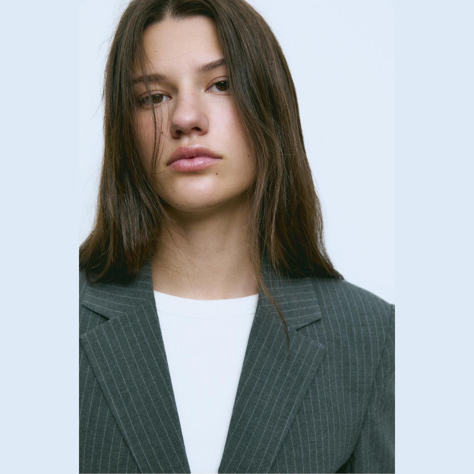 بليزر أنيق من Stradivarius بلون رمادي بنقشة خطوط، مصنوع من خامة مرنة بتركيبة 64% بوليستر، 34% فيسكوز، 2% إيلاستان، يتميز بقصة مستقيمة Straight Fit، ياقة كلاسيكية مطوية، أكمام طويلة، إغلاق أمامي بأزرار، مزود بجيوب أمامية بغطاء، تصميم مصقول بملمس ناعم، بدون بطانة، مثالي للتنسيق مع بنطال رسمي أو تنورة لإطلالة مكتبية أو يومية أنيقة.