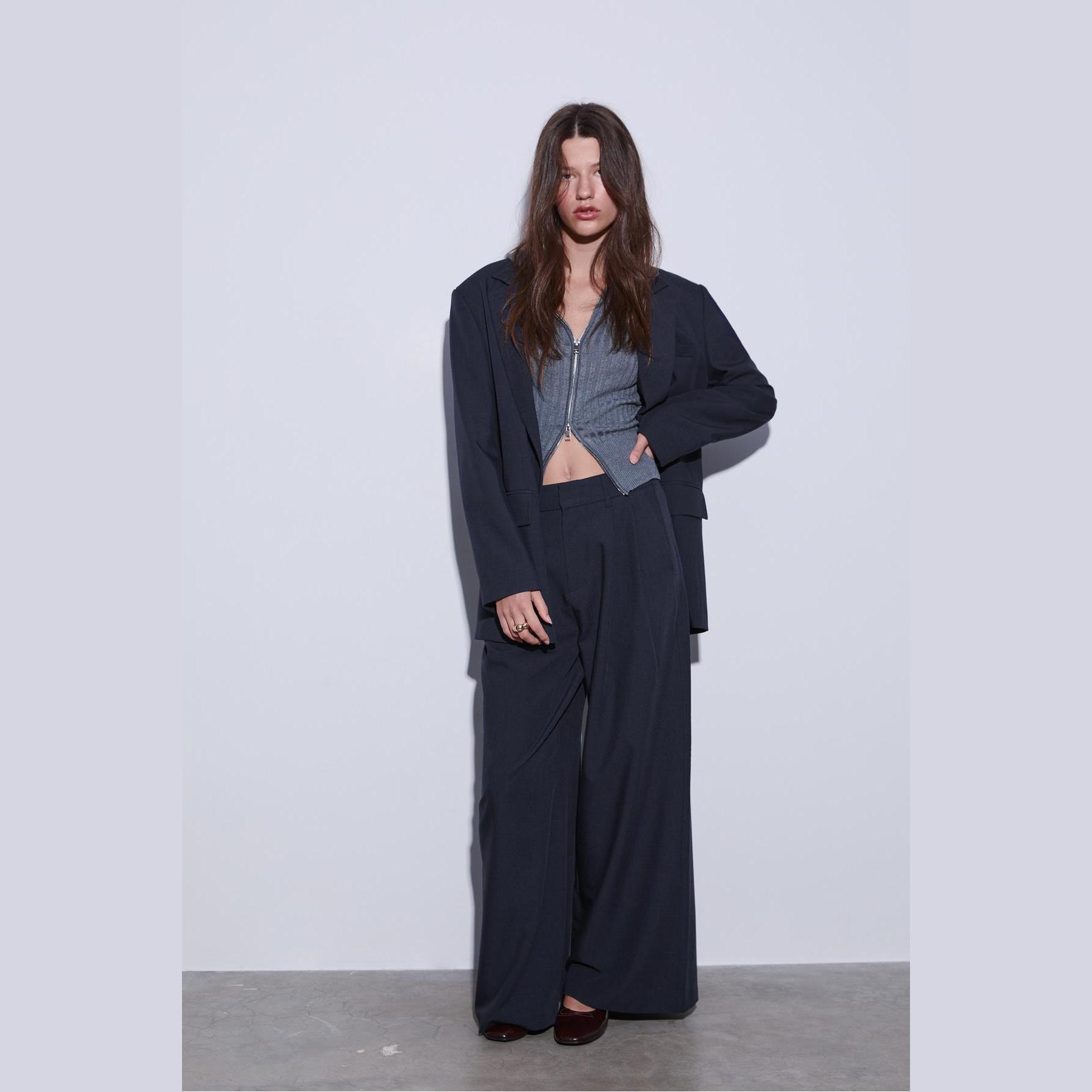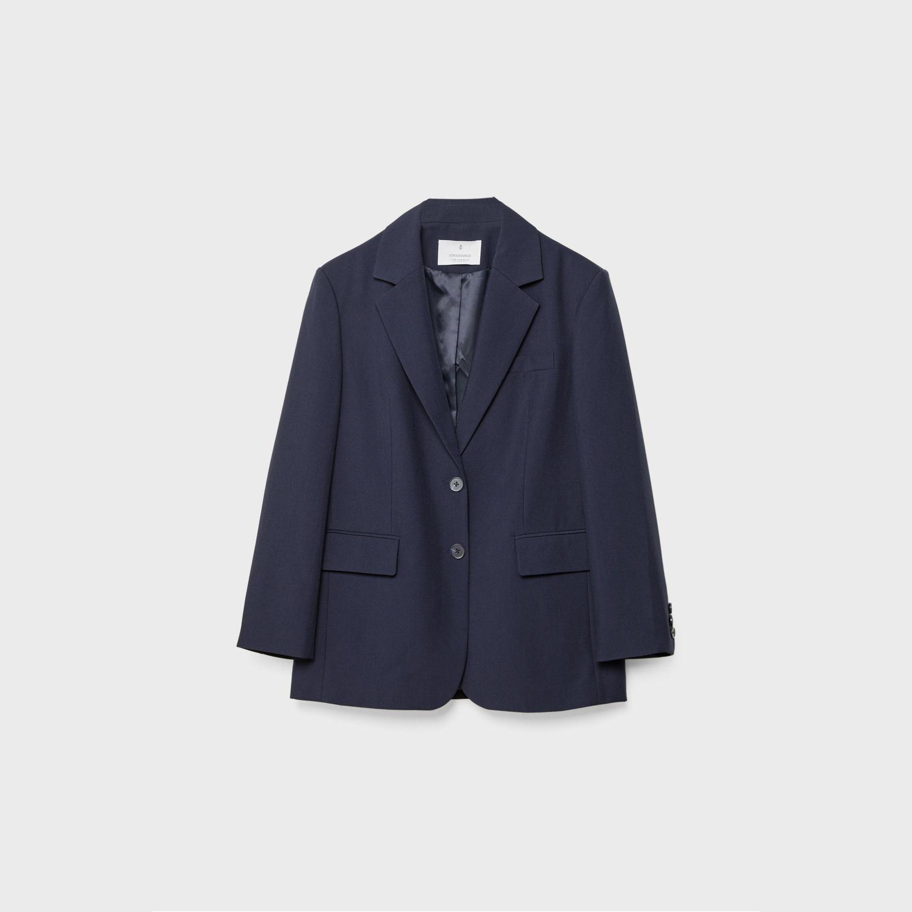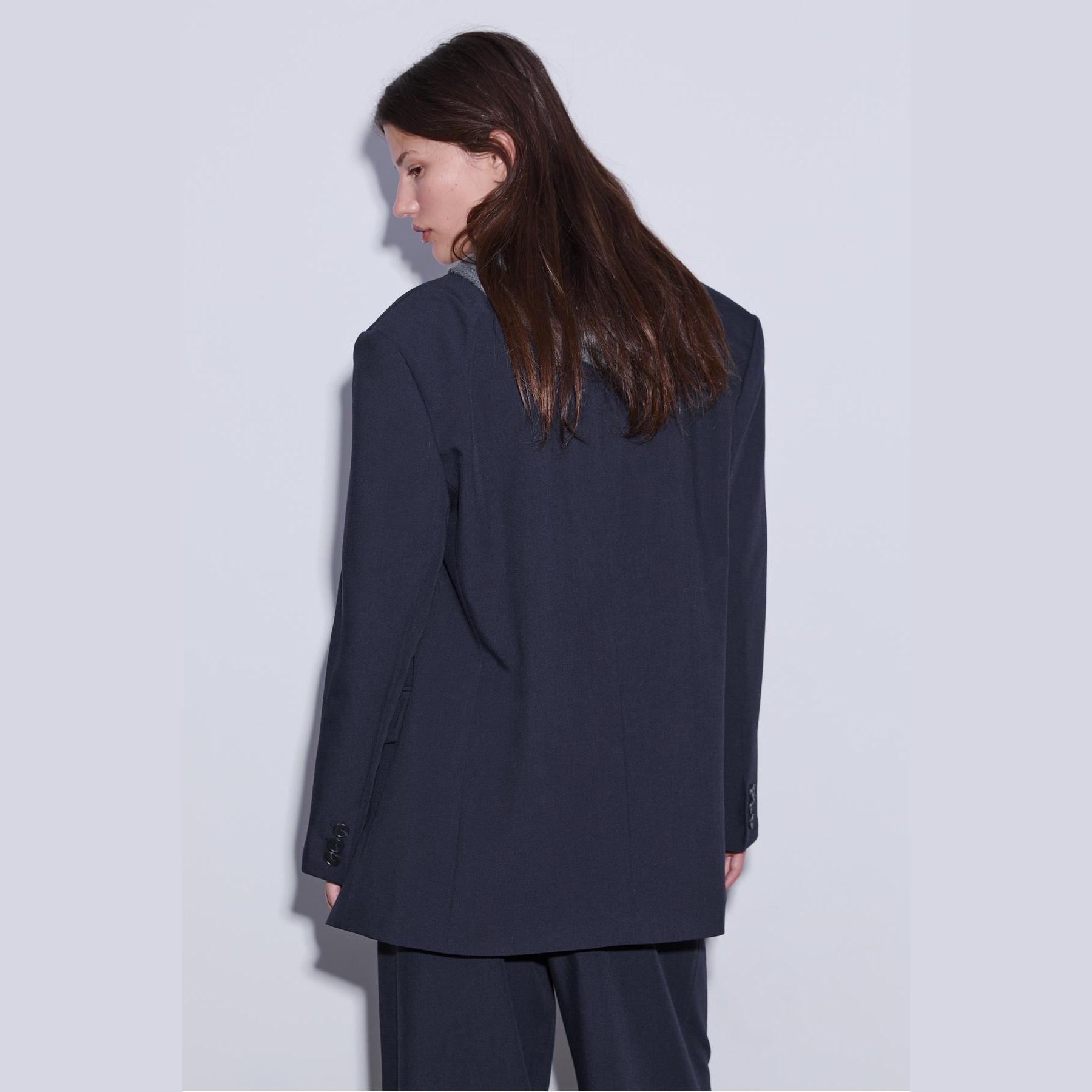 بليزر أنيق من Stradivarius بلون كحلي، مصنوع من خامة مرنة بتركيبة 78% بوليستر، 16% فيسكوز، 6% إيلاستان، يتميز بقصة Oversize، ياقة كلاسيكية مطوية، أكمام طويلة، إغلاق أمامي بأزرار، مزود بجيوب أمامية بغطاء، تصميم سادة بملمس ناعم، بدون بطانة، مثالي للتنسيق مع بنطال رسمي أو تنورة لإطلالة مكتبية أو يومية أنيقة.