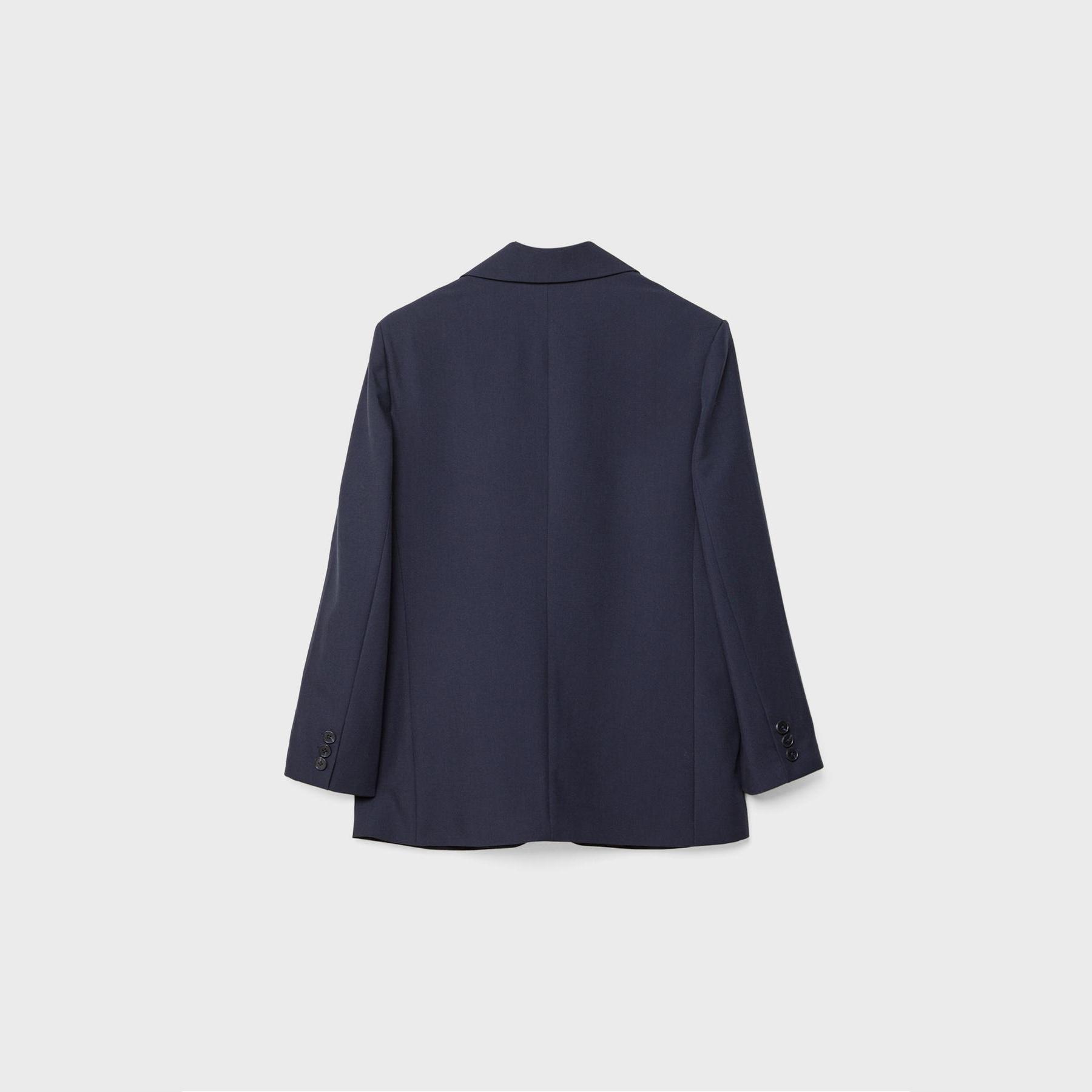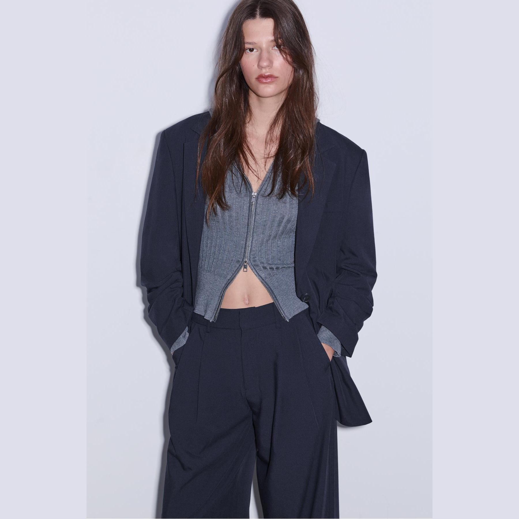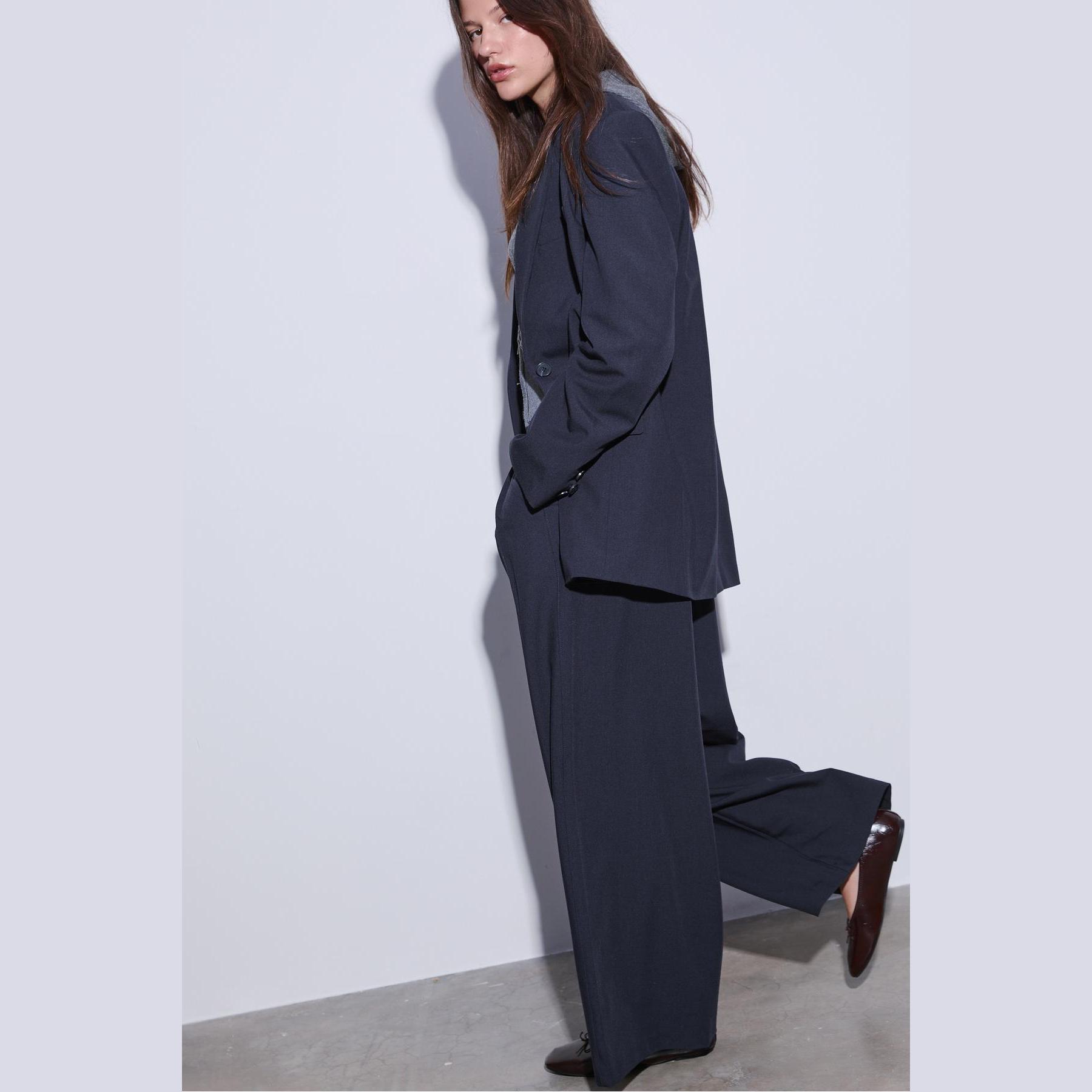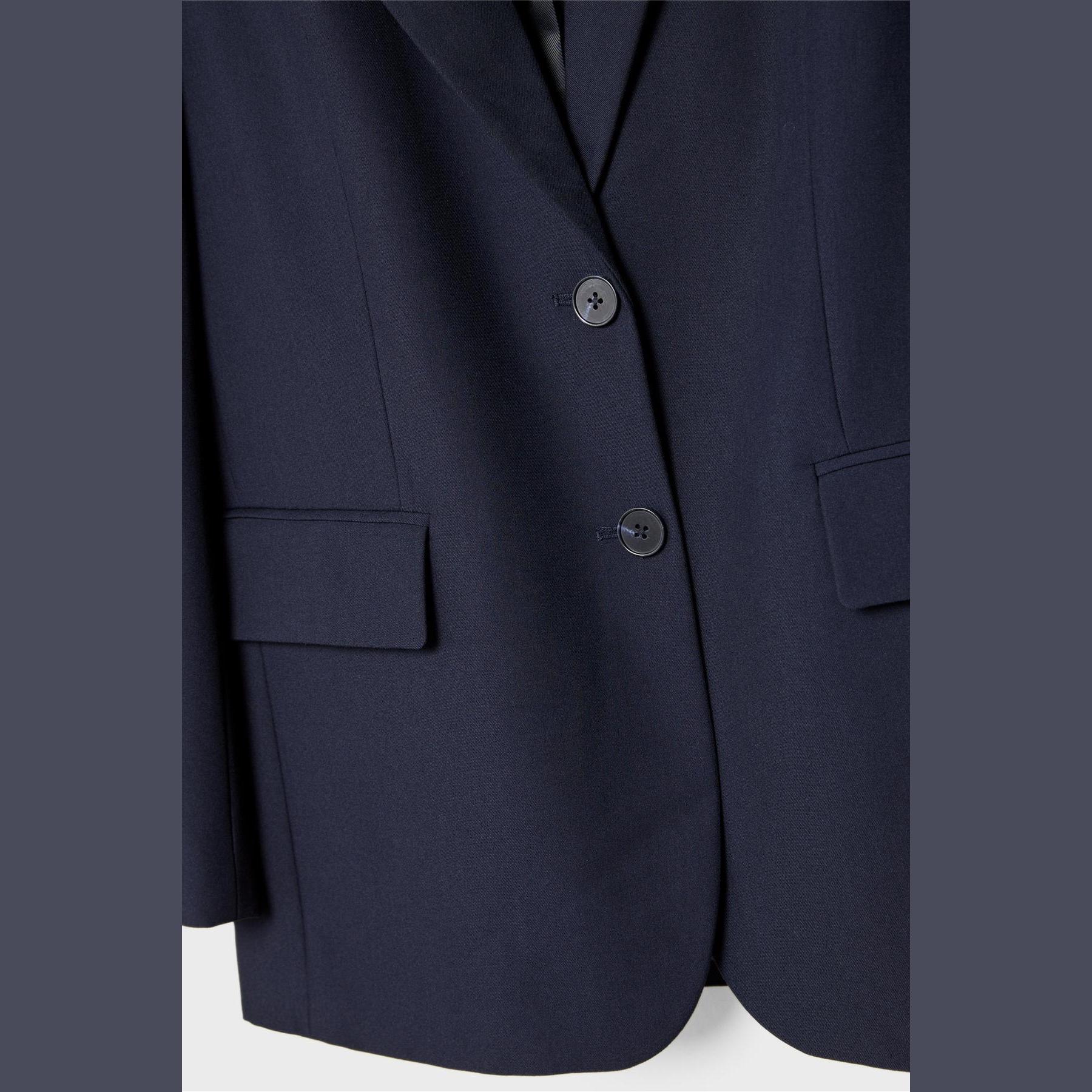 بليزر أنيق من Stradivarius بلون كحلي، مصنوع من خامة مرنة بتركيبة 78% بوليستر، 16% فيسكوز، 6% إيلاستان، يتميز بقصة Oversize، ياقة كلاسيكية مطوية، أكمام طويلة، إغلاق أمامي بأزرار، مزود بجيوب أمامية بغطاء، تصميم سادة بملمس ناعم، بدون بطانة، مثالي للتنسيق مع بنطال رسمي أو تنورة لإطلالة مكتبية أو يومية أنيقة.