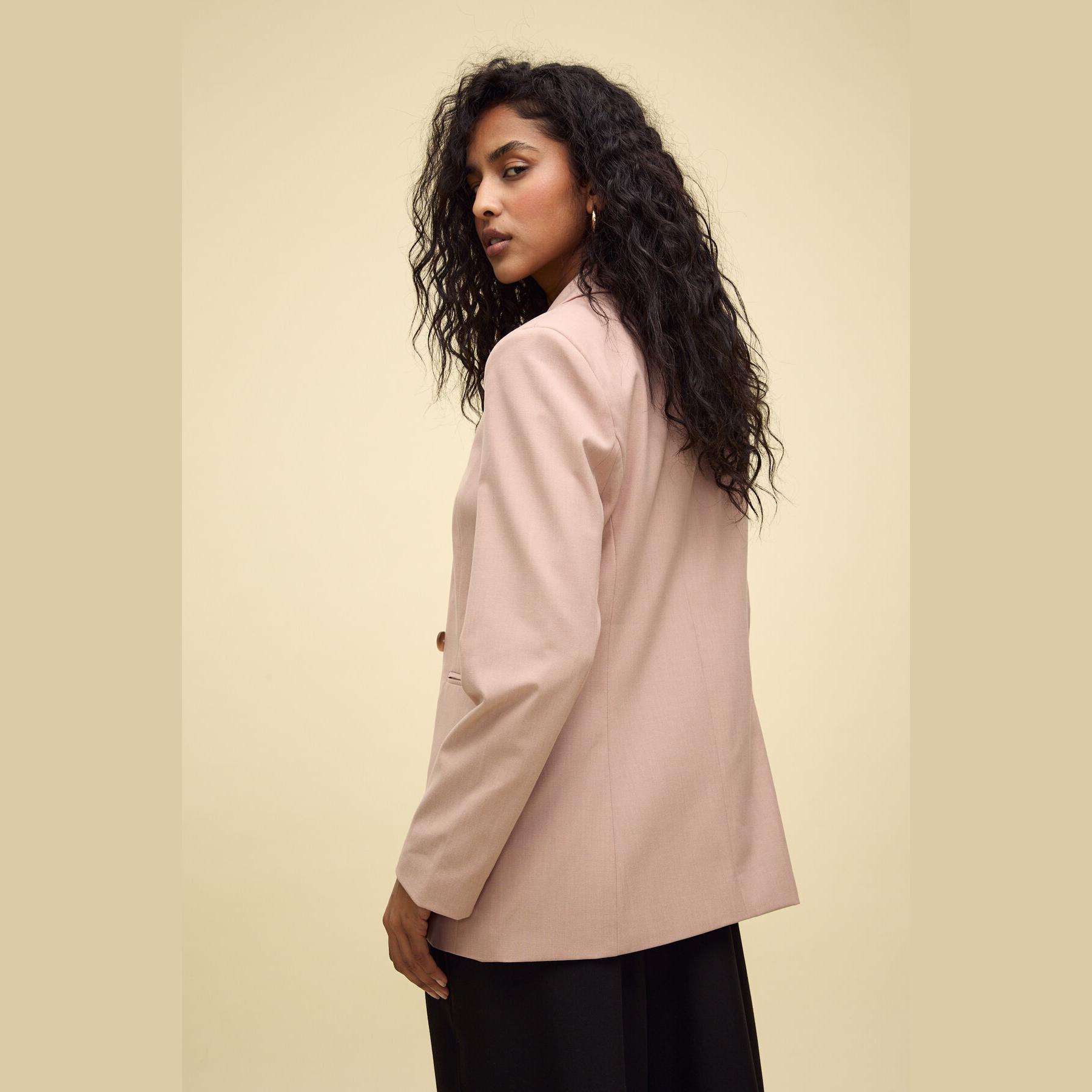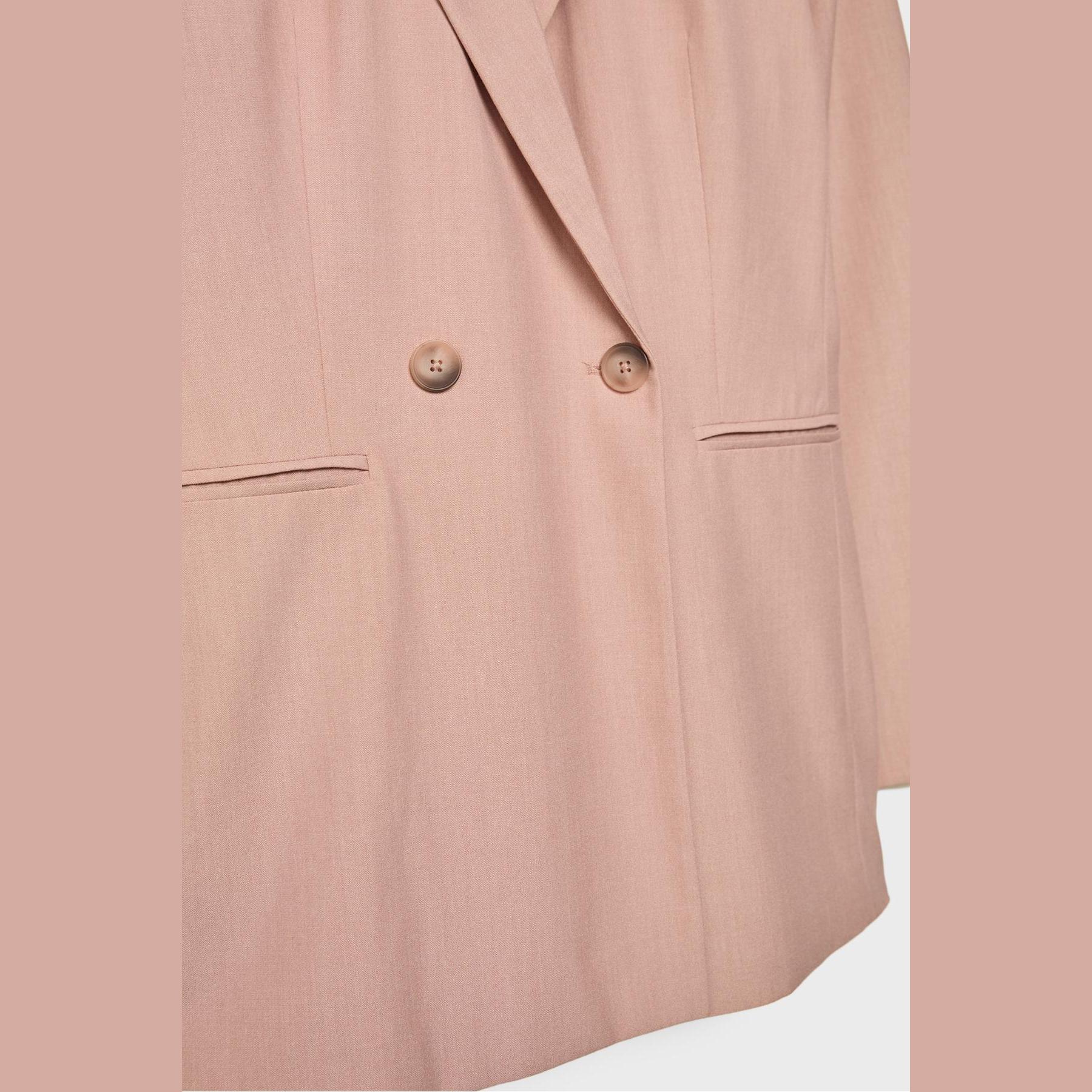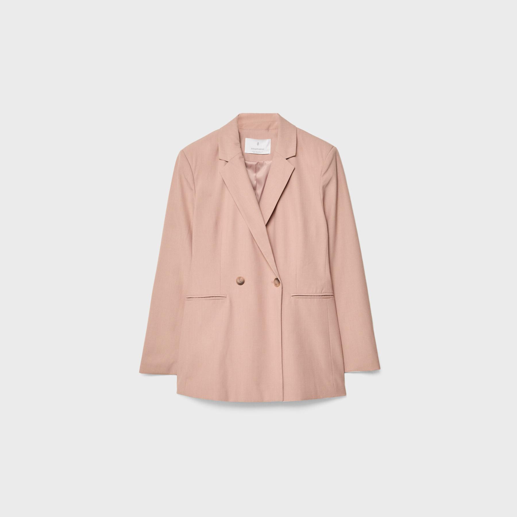 بليزر أنيق من Stradivarius بلون وردي، مصنوع من خامة مرنة بتركيبة 63% بوليستر، 33% فيسكوز، 4% إيلاستان، يتميز بقصة Slim Fit، ياقة كلاسيكية مطوية، أكمام طويلة، إغلاق أمامي مزدوج (كروڤاز) بأزرار، مزود بجيوب أمامية مزدوجة بتفصيل بِييه، تصميم سادة بملمس ناعم، مبطّن بالكامل، مثالي للتنسيق مع بنطال رسمي أو تنورة لإطلالة مكتبية أنيقة.