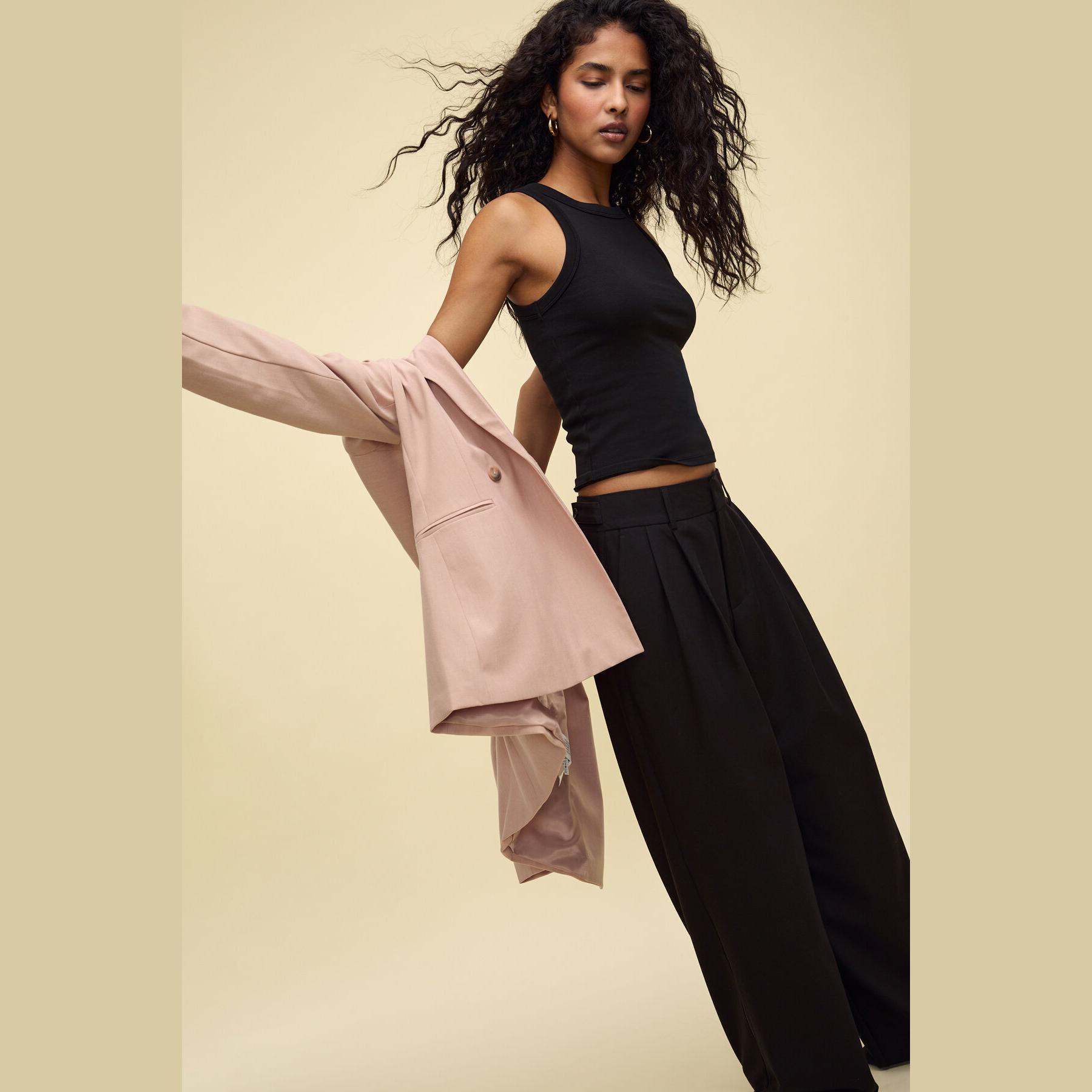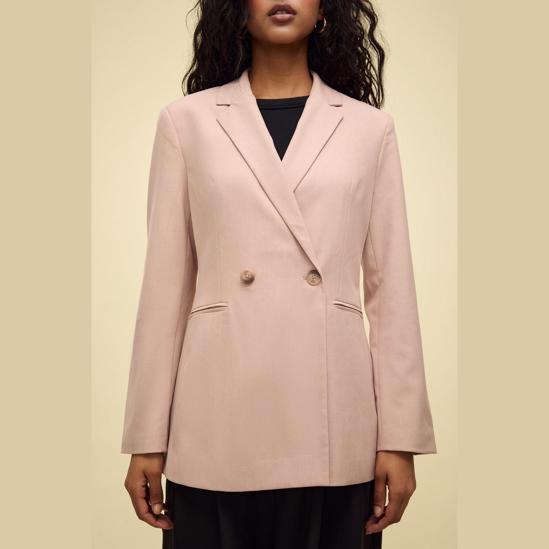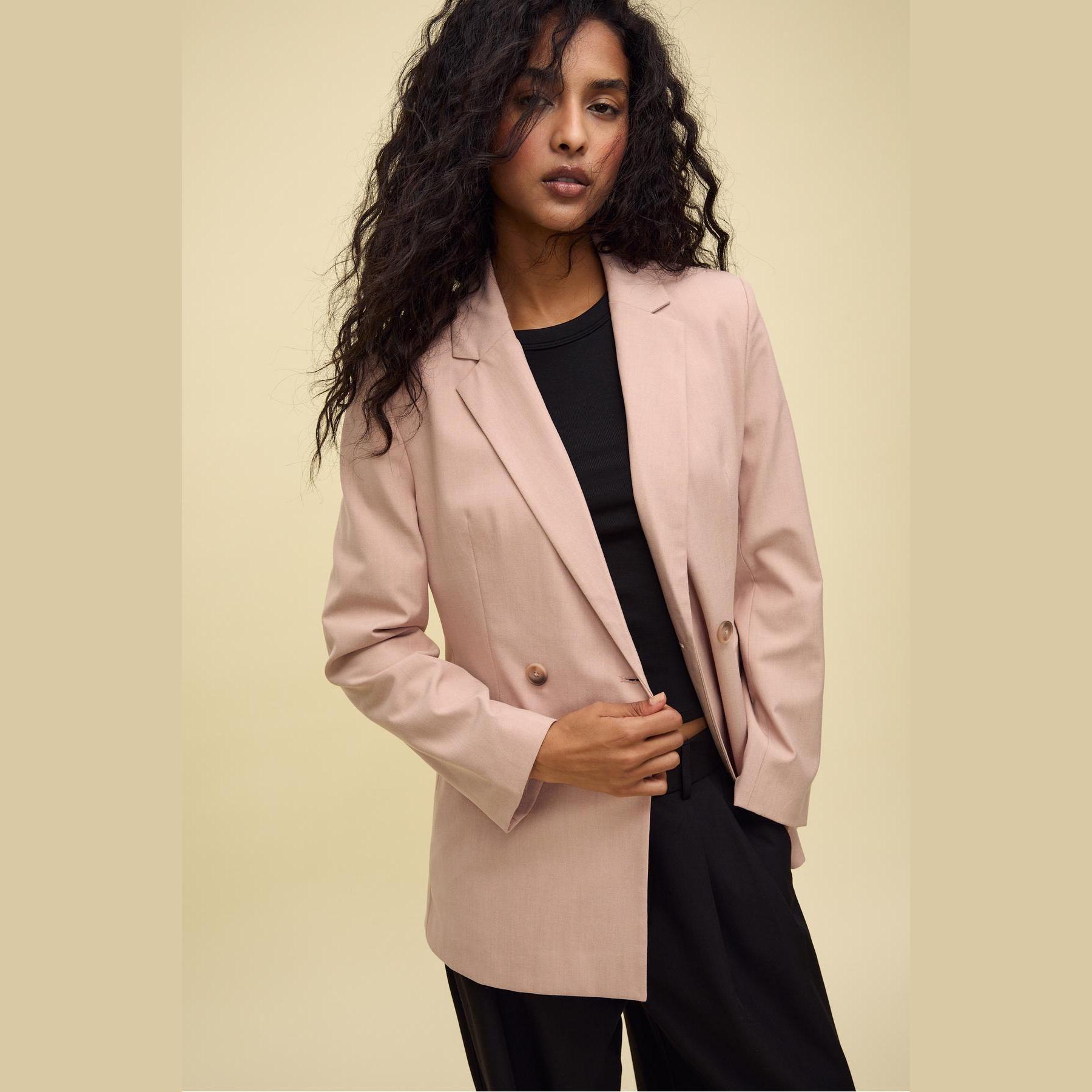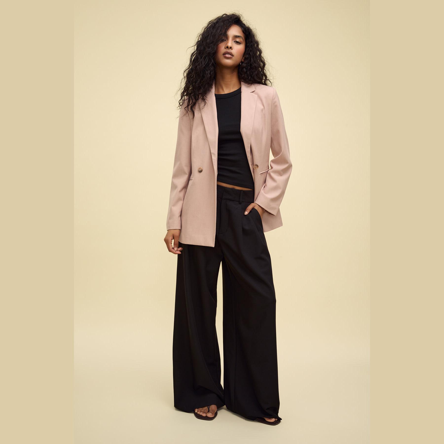 بليزر أنيق من Stradivarius بلون وردي، مصنوع من خامة مرنة بتركيبة 63% بوليستر، 33% فيسكوز، 4% إيلاستان، يتميز بقصة Slim Fit، ياقة كلاسيكية مطوية، أكمام طويلة، إغلاق أمامي مزدوج (كروڤاز) بأزرار، مزود بجيوب أمامية مزدوجة بتفصيل بِييه، تصميم سادة بملمس ناعم، مبطّن بالكامل، مثالي للتنسيق مع بنطال رسمي أو تنورة لإطلالة مكتبية أنيقة.