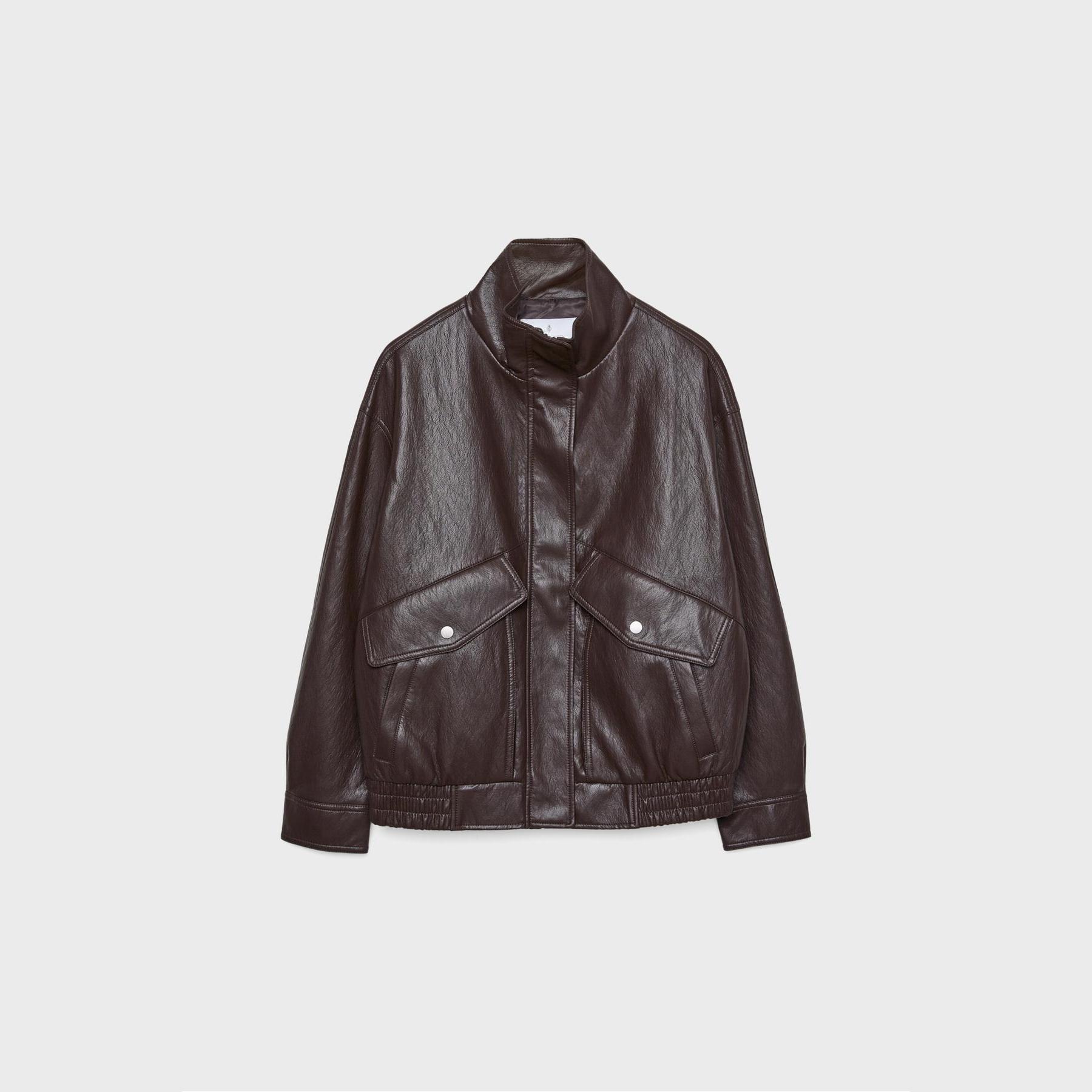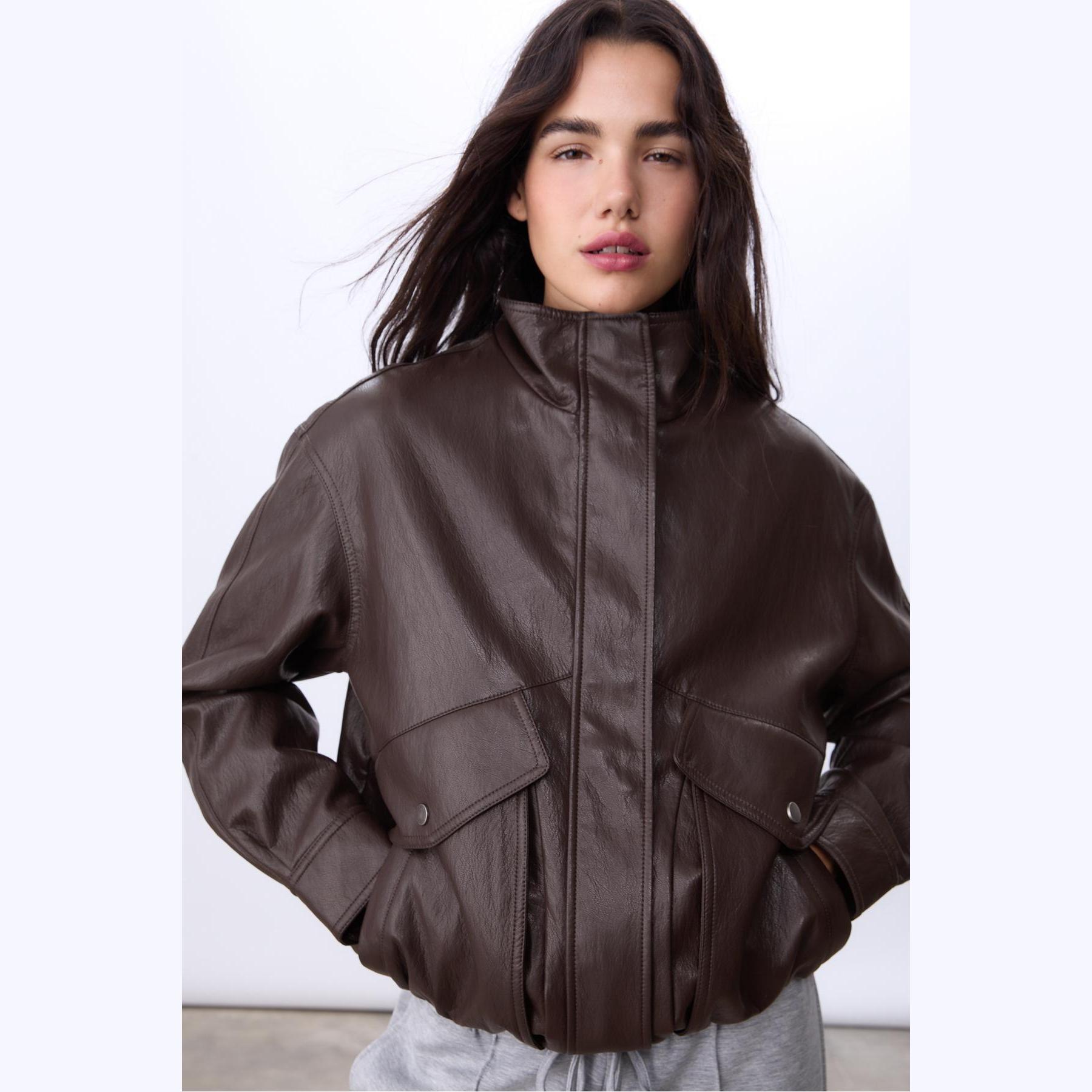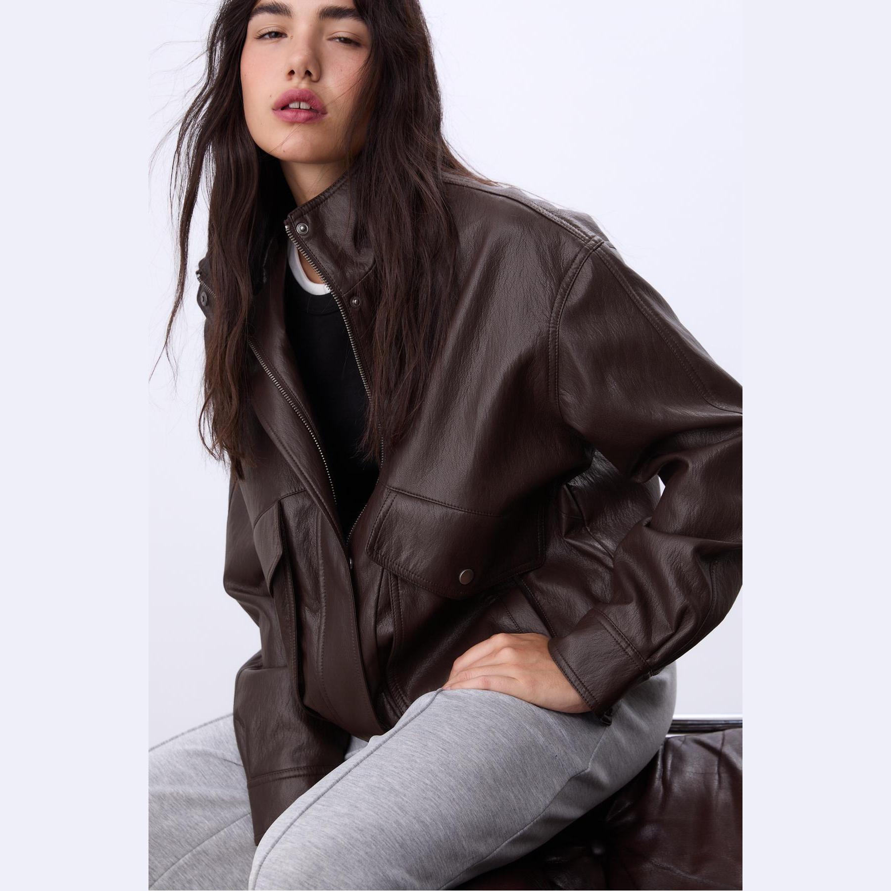 جاكيت بستايل Oversize من Stradivarius بلون بني، مصنوع من خامة جلد صناعي بتركيبة متعددة: 65% بولي يوريثان، 24% فيسكوز، 6% بوليستر، 3% قطن، 2% خيط معدني. يتميز بياقة عالية مستقيمة، أكمام طويلة مع أساور بأزرار، إغلاق أمامي بسحاب معدني مخفي داخل بات مع كبسات، مزود بجيوب أمامية مزدوجة بغطاء وأزرار، بالإضافة إلى جيوب جانبية بِييه، حافة سفلية مطاطية، تصميم سادة بملمس جلدي ناعم، بدون بطانة، مثالي للتنسيق مع قطع كاجوال لإطلالة حضرية جريئة.