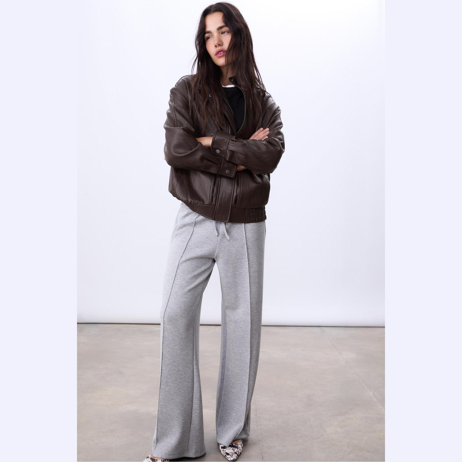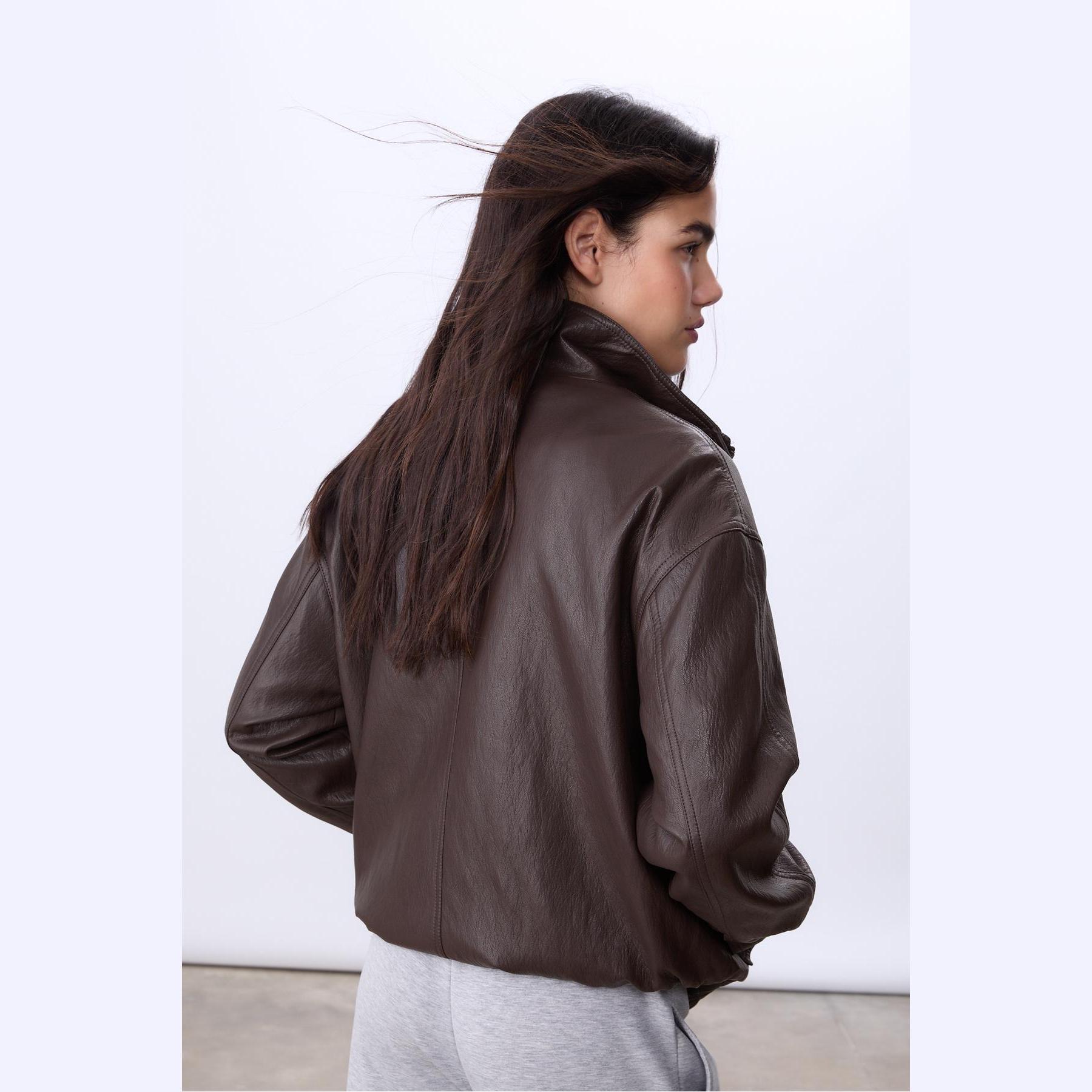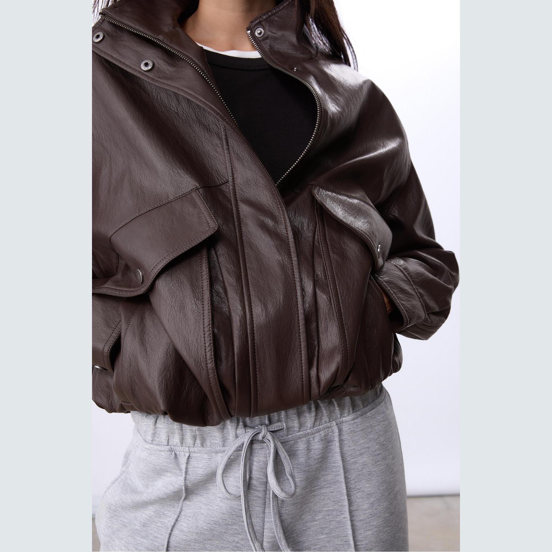 جاكيت بستايل Oversize من Stradivarius بلون بني، مصنوع من خامة جلد صناعي بتركيبة متعددة: 65% بولي يوريثان، 24% فيسكوز، 6% بوليستر، 3% قطن، 2% خيط معدني. يتميز بياقة عالية مستقيمة، أكمام طويلة مع أساور بأزرار، إغلاق أمامي بسحاب معدني مخفي داخل بات مع كبسات، مزود بجيوب أمامية مزدوجة بغطاء وأزرار، بالإضافة إلى جيوب جانبية بِييه، حافة سفلية مطاطية، تصميم سادة بملمس جلدي ناعم، بدون بطانة، مثالي للتنسيق مع قطع كاجوال لإطلالة حضرية جريئة.