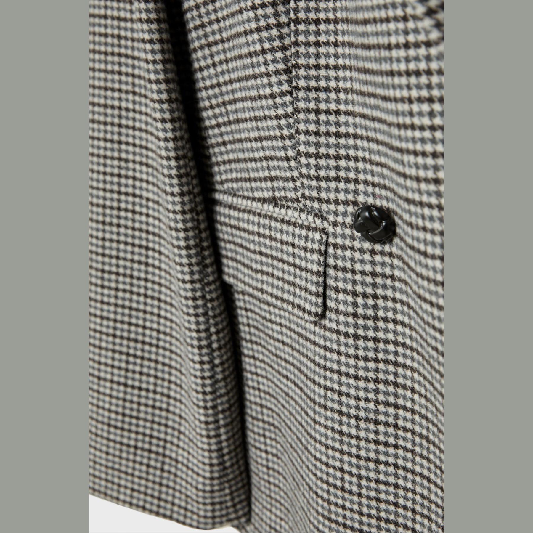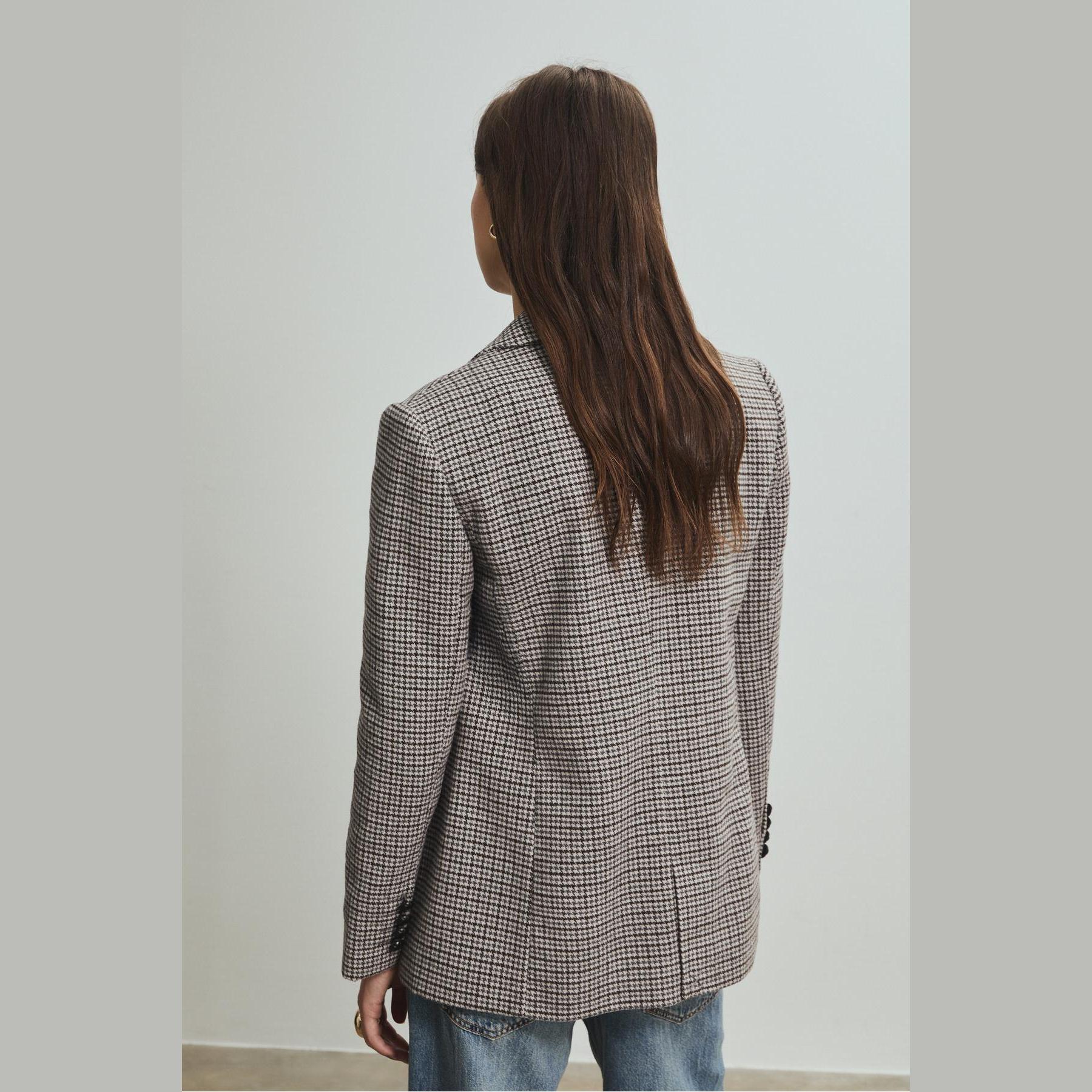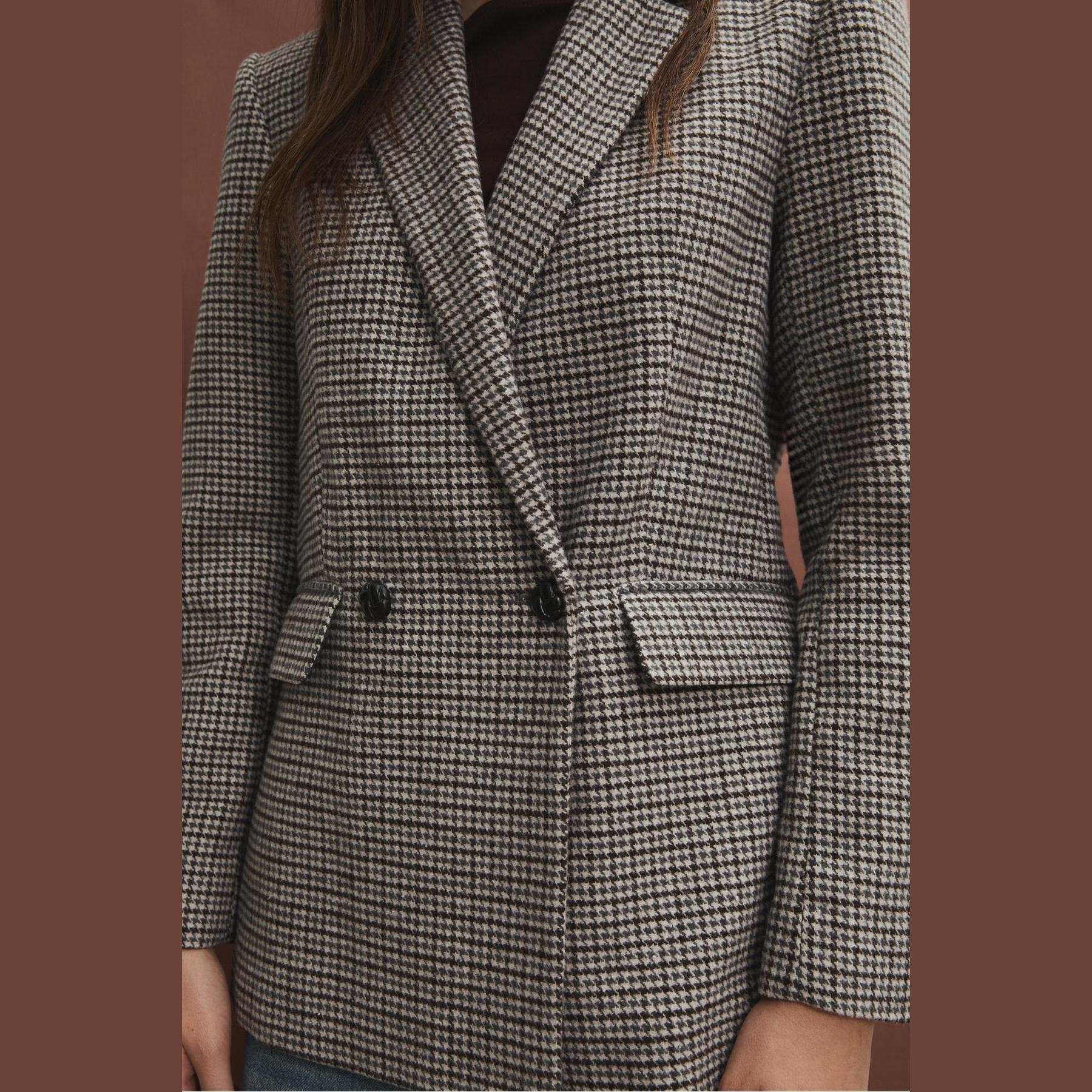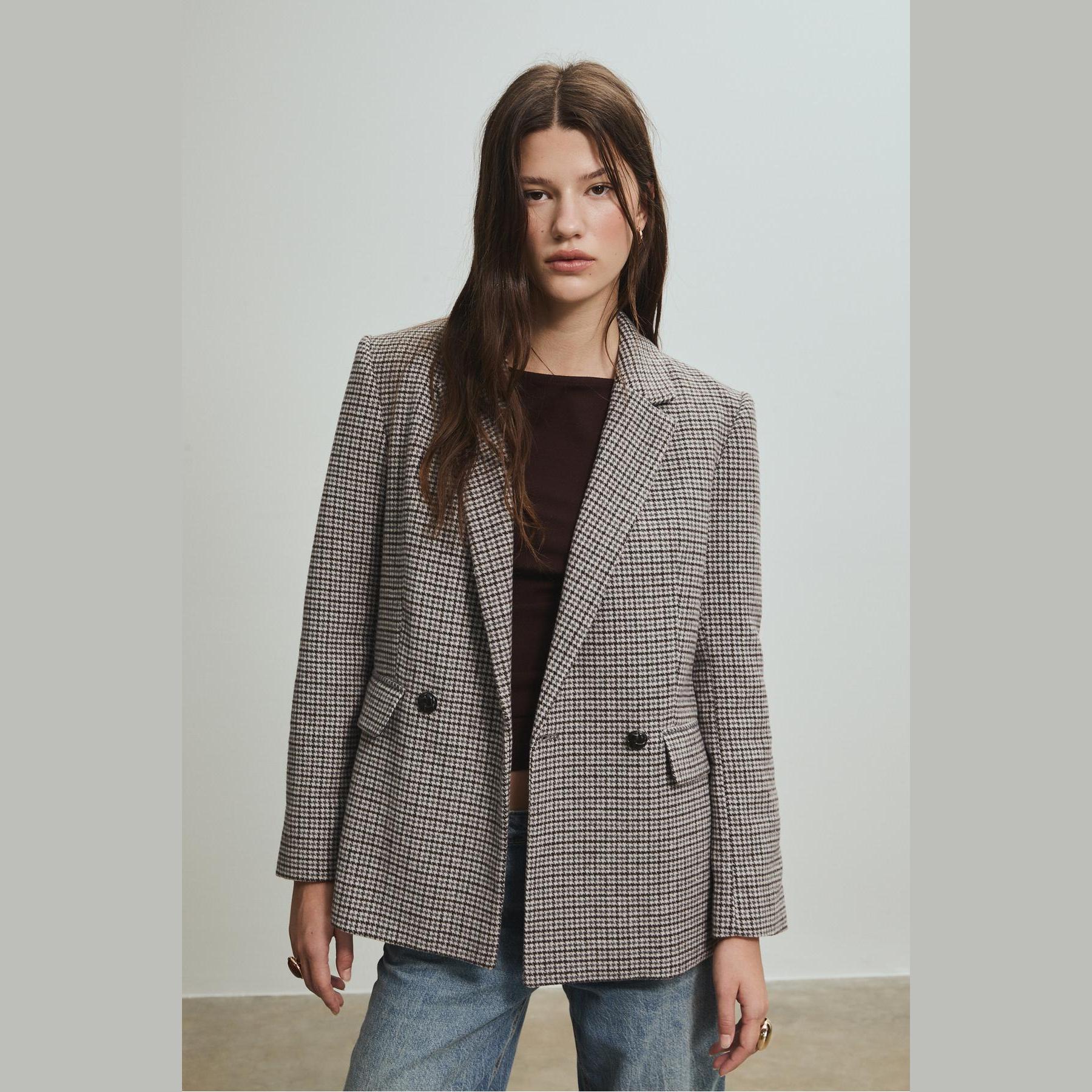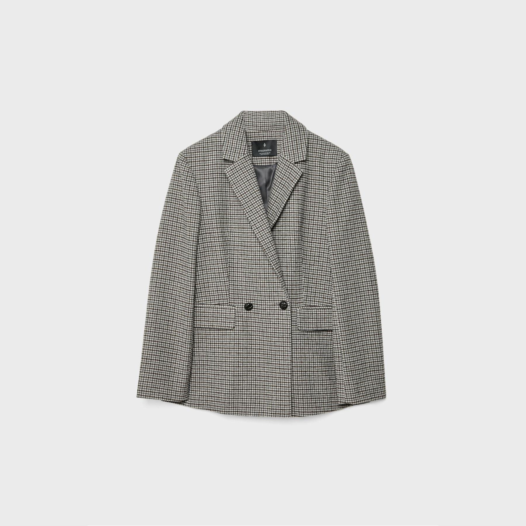 بليزر أنيق من Stradivarius بلون رمادي فاتح بنقشة مربعات، مصنوع من خامة مركبة بتركيبة 87% بوليستر، 12% صوف، 1% أكريليك، يتميز بقصة Regular Fit، ياقة كلاسيكية مطوية، أكمام طويلة، إغلاق أمامي بأزرار بارزة، مزود بجيوب أمامية ديكورية بغطاء، تصميم مصقول بملمس ناعم، مبطّن بالكامل، مثالي للتنسيق مع بنطال رسمي أو تنورة لإطلالة مكتبية أو يومية أنيقة.