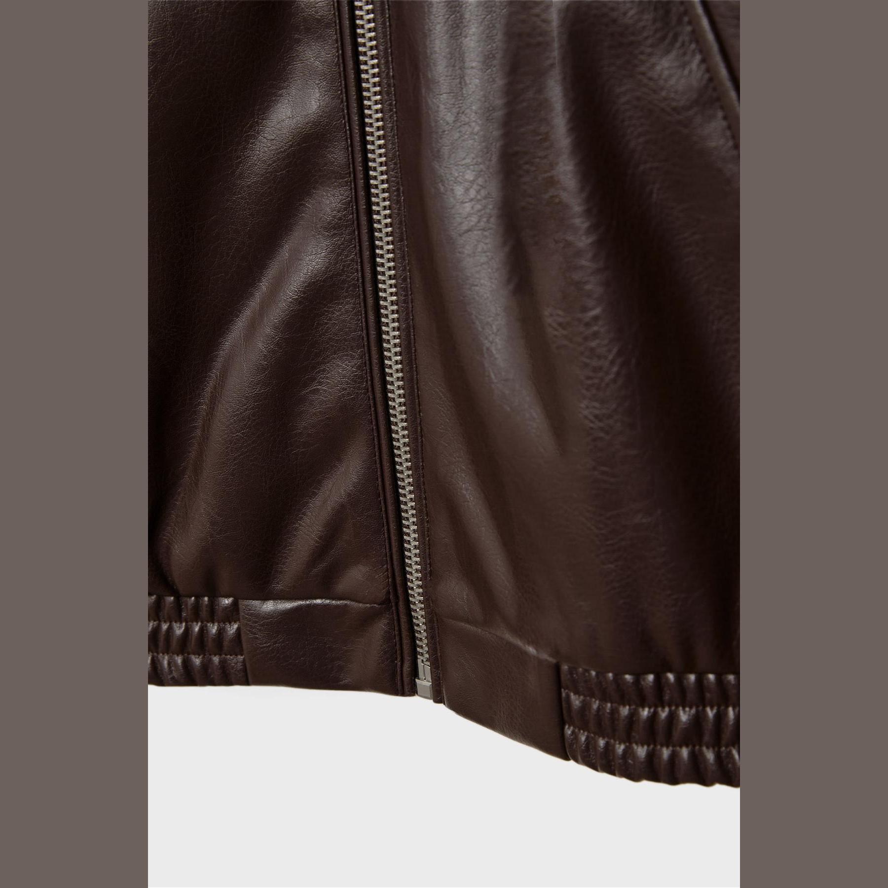 جاكيت بستايل Oversize من Stradivarius بلون بني، مصنوع من خامة جلد صناعي بتركيبة 63% بوليستر، 37% بولي يوريثان، يتميز بياقة بليزر مطوية، أكمام طويلة مع أساور بأزرار، إغلاق أمامي بسحاب معدني، مزود بجيوب جانبية بِييه، حافة سفلية مطاطية، تصميم سادة بملمس جلدي ناعم، بدون بطانة، مثالي للتنسيق مع قطع كاجوال لإطلالة حضرية جريئة.