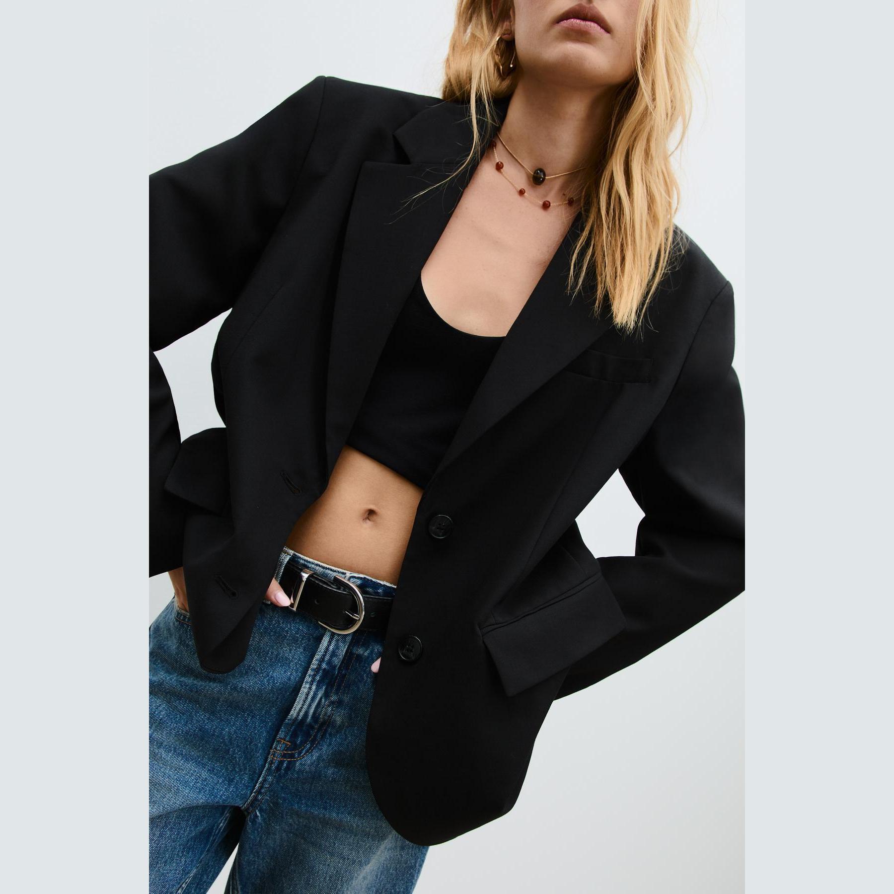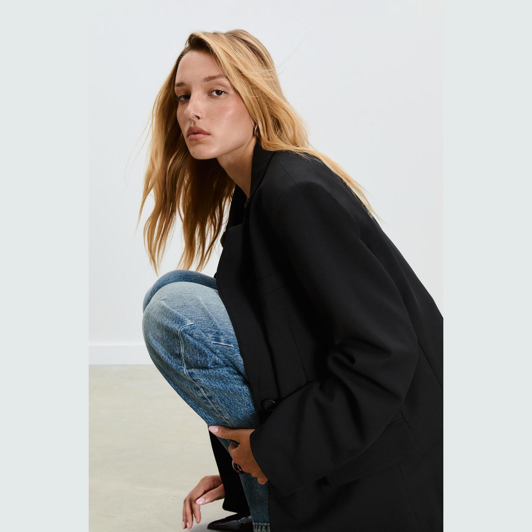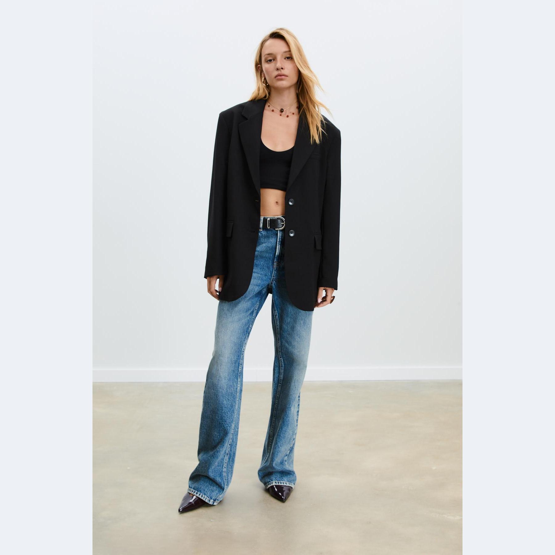 بليزر أنيق من Stradivarius بلون أسود، مصنوع من خامة مرنة بتركيبة 63% بوليستر، 30% فيسكوز، 7% إيلاستان، يتميز بقصة Oversize، ياقة بليزر مطوية، أكمام طويلة، إغلاق أمامي بأزرار، مزود بجيوب أمامية بغطاء + جيب ديكوري على الصدر بتفصيل بِييه، تصميم سادة بملمس ناعم، بدون بطانة، مثالي للتنسيق مع بنطال جينز أو تنورة قصيرة لإطلالة يومية أو مكتبية أنيقة.