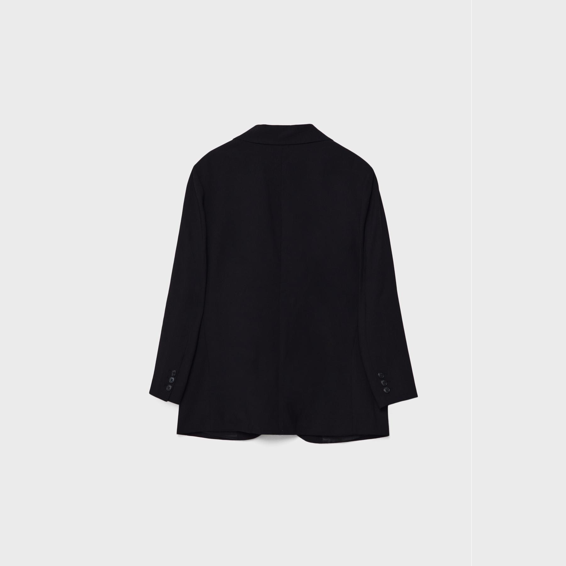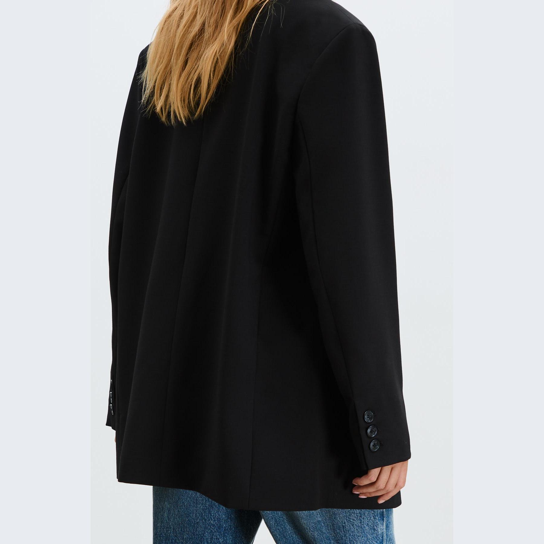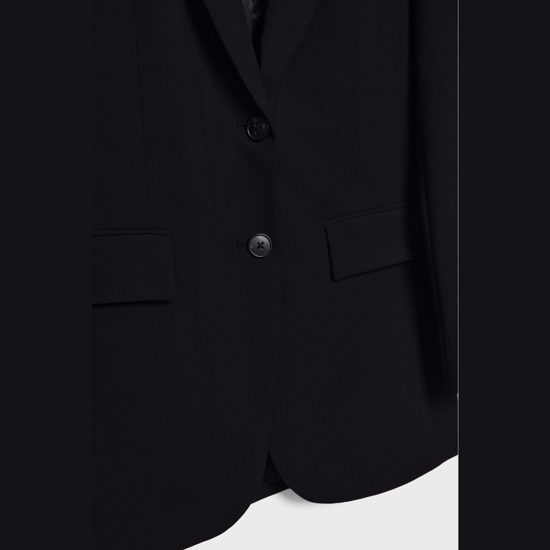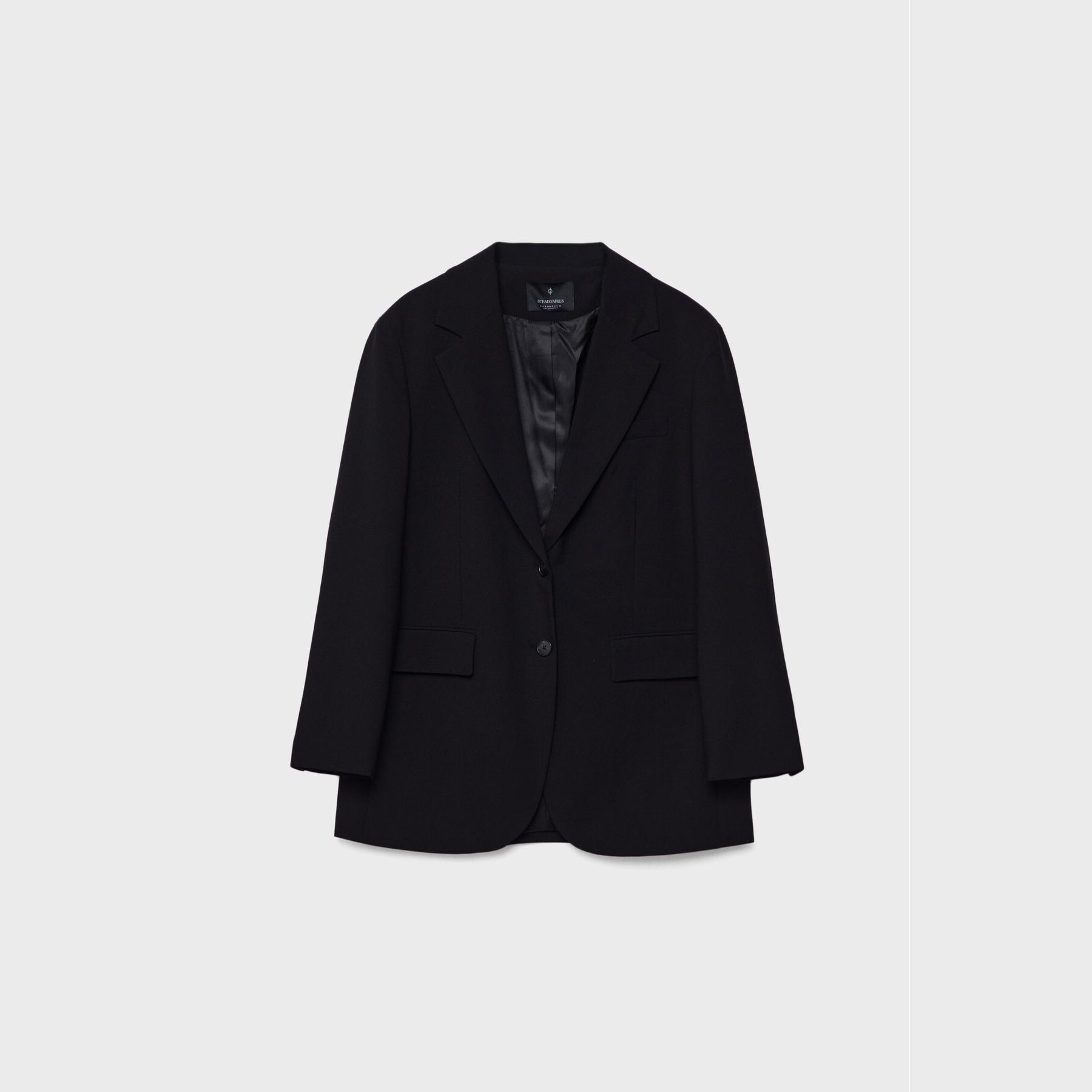 بليزر أنيق من Stradivarius بلون أسود، مصنوع من خامة مرنة بتركيبة 63% بوليستر، 30% فيسكوز، 7% إيلاستان، يتميز بقصة Oversize، ياقة بليزر مطوية، أكمام طويلة، إغلاق أمامي بأزرار، مزود بجيوب أمامية بغطاء + جيب ديكوري على الصدر بتفصيل بِييه، تصميم سادة بملمس ناعم، بدون بطانة، مثالي للتنسيق مع بنطال جينز أو تنورة قصيرة لإطلالة يومية أو مكتبية أنيقة.