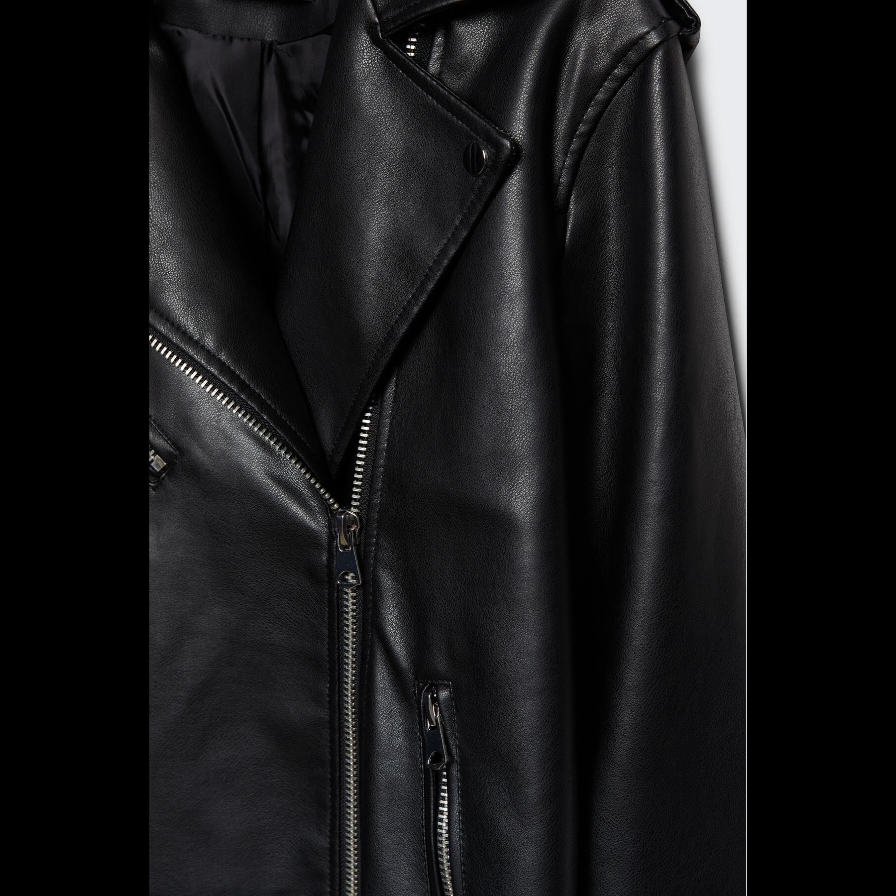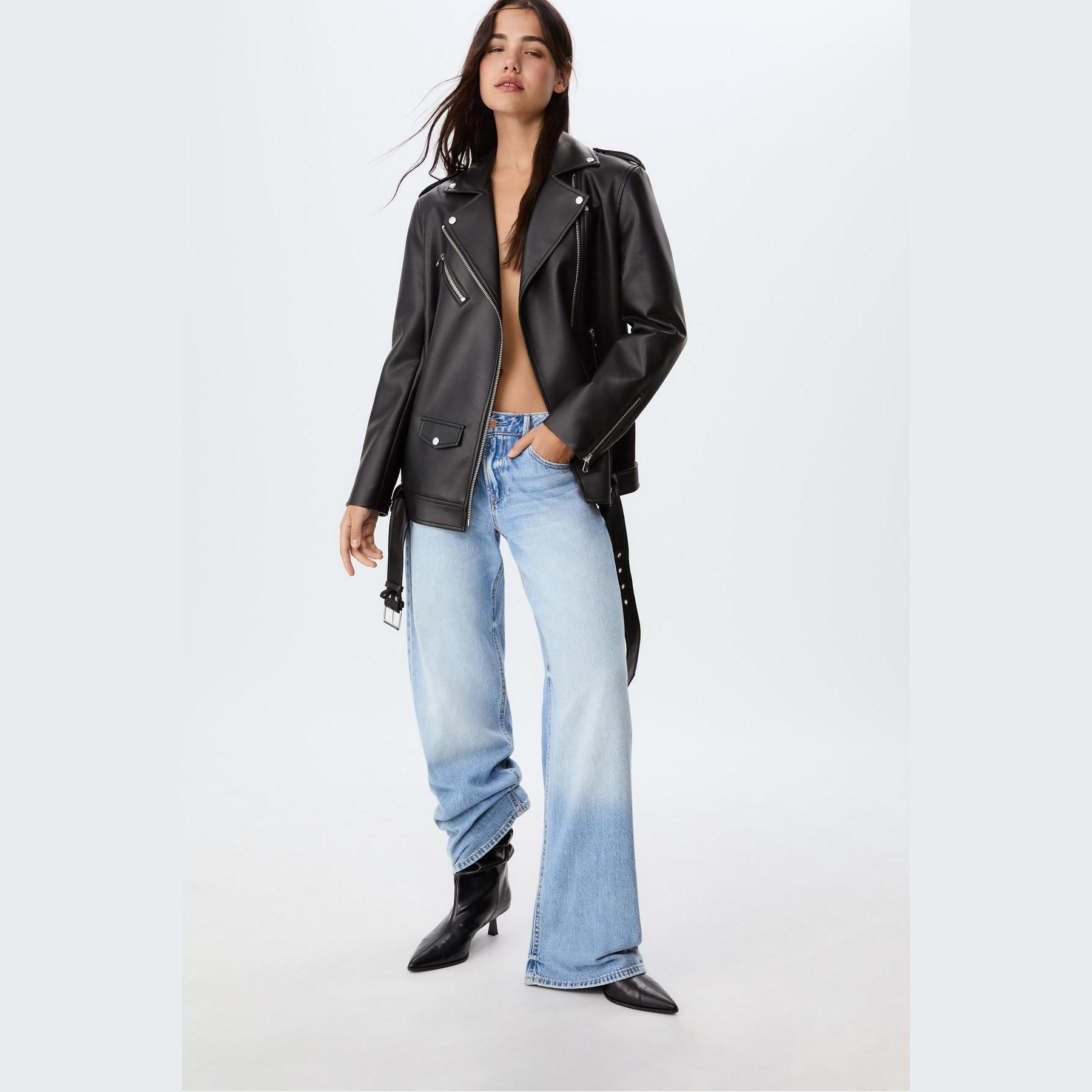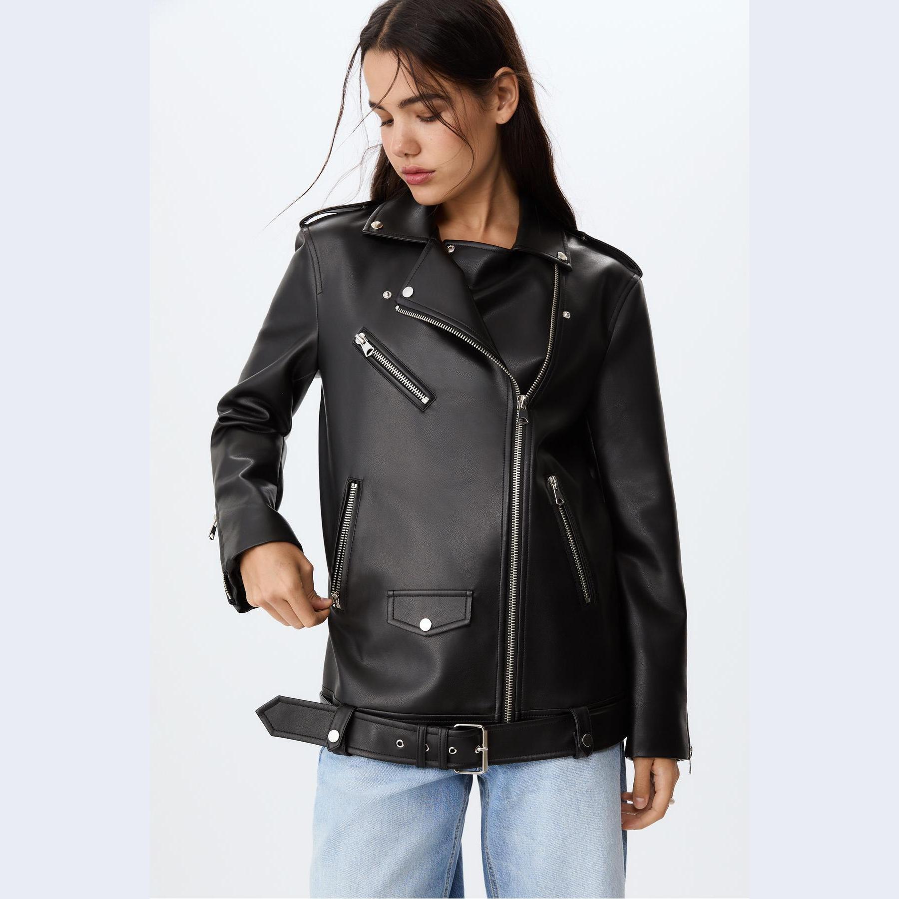 جاكيت بايكر أنيق من Stradivarius بلون أسود، مصنوع من خامة جلد صناعي بتركيبة 50% بولي يوريثان، 46% بوليستر، 3% قطن، 1% فيسكوز، يتميز بقصة Oversize، ياقة بليزر مطوية، أكمام طويلة، إغلاق أمامي بسحاب معدني، مزود بجيوب أمامية مزدوجة بغطاء، تصميم مزود بحزام قابل للتعديل، أزرار معدنية، تفاصيل على الكتف، مبطّن بالكامل، مثالي للتنسيق مع قطع كاجوال أو إطلالات ليلية.