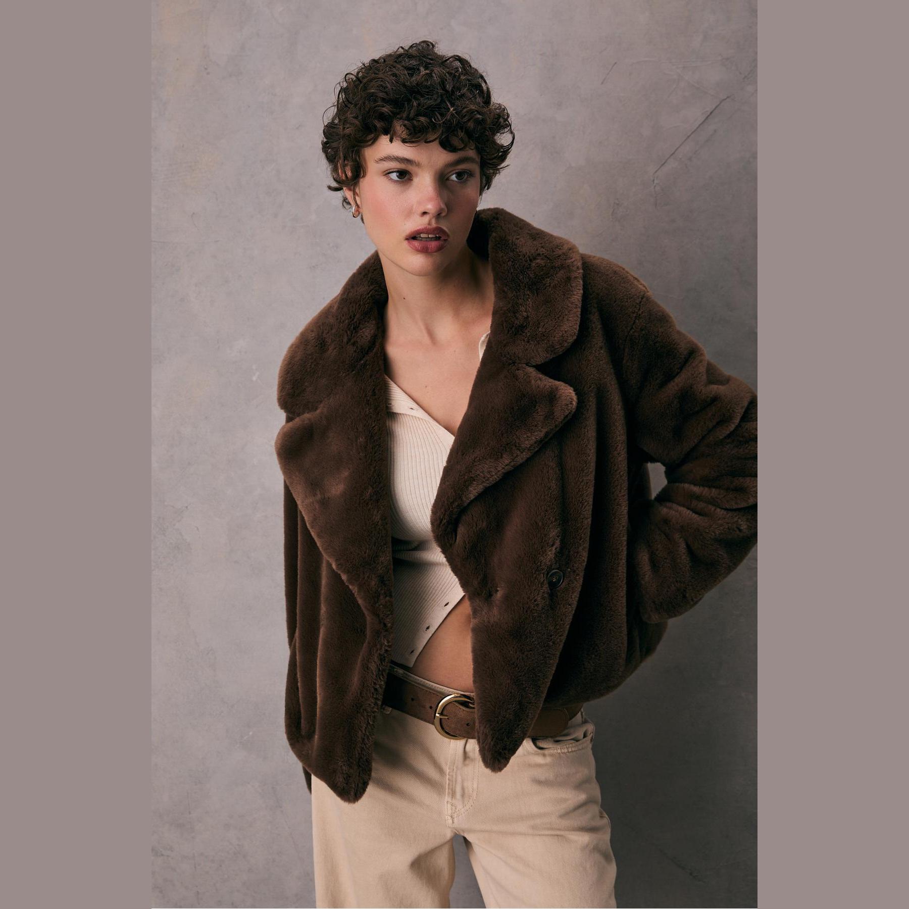 جاكيت شتوي أنيق من Stradivarius بلون بني، مصنوع من خامة ناعمة بتركيبة 100% بوليستر، يتميز بقصة Regular Fit، ياقة قميص مطوية، أكمام طويلة، إغلاق أمامي بأزرار مزدوجة (كروڤاز)، مزود بجيوب أمامية بِييه، تصميم سادة بملمس فرو صناعي ناعم، بدون بطانة، مثالي للتنسيق مع قطع كاجوال أو رسمية لإطلالة شتوية دافئة.