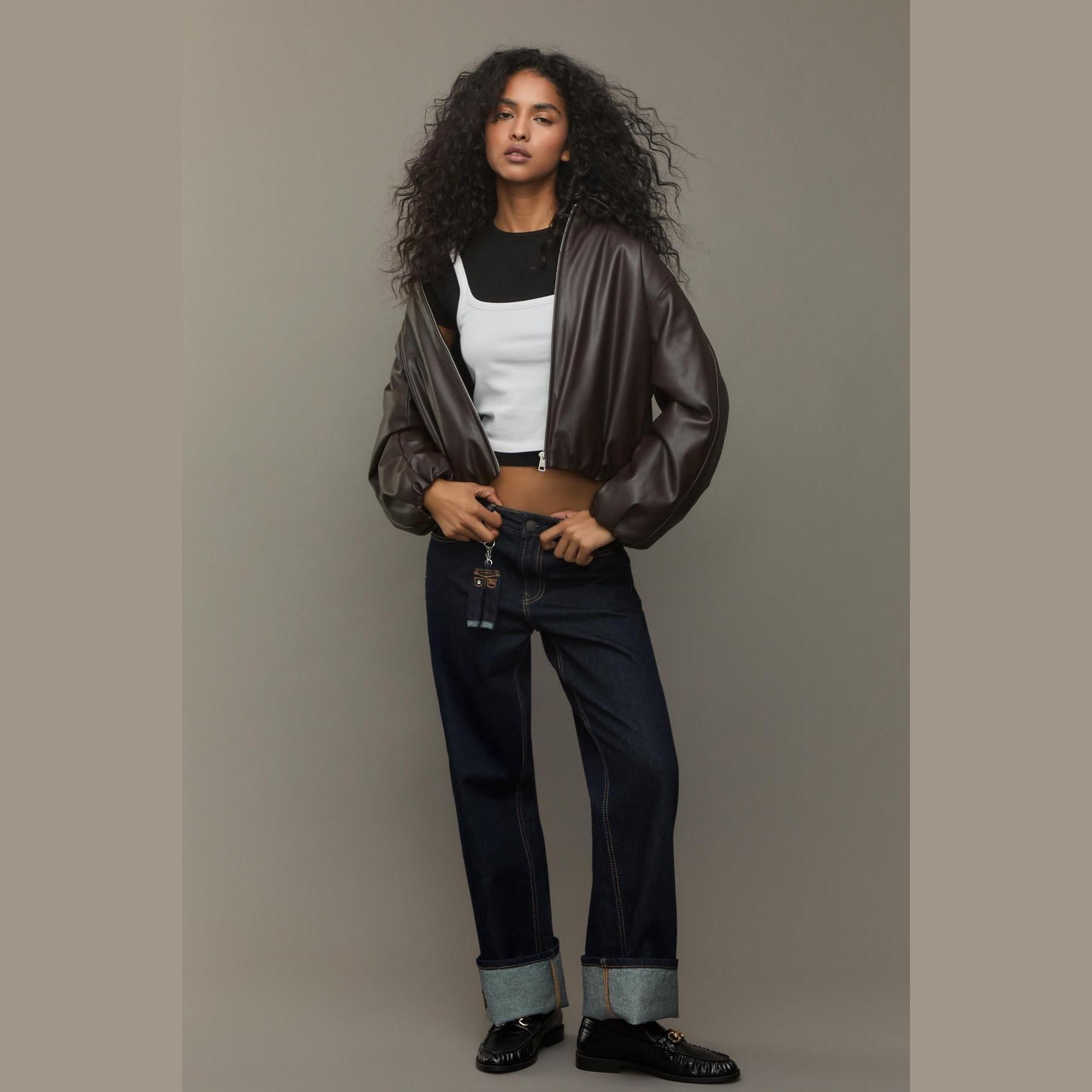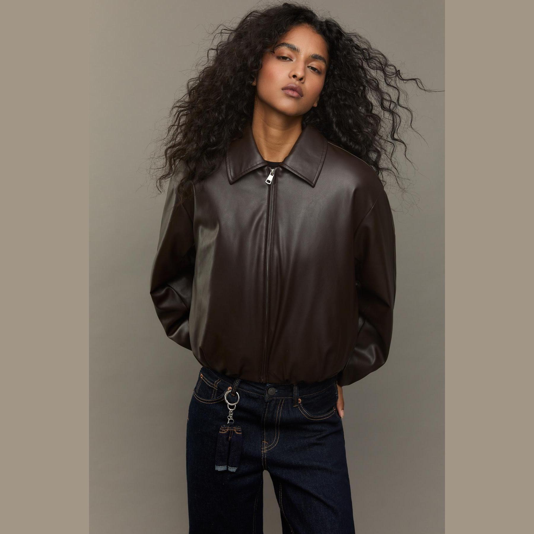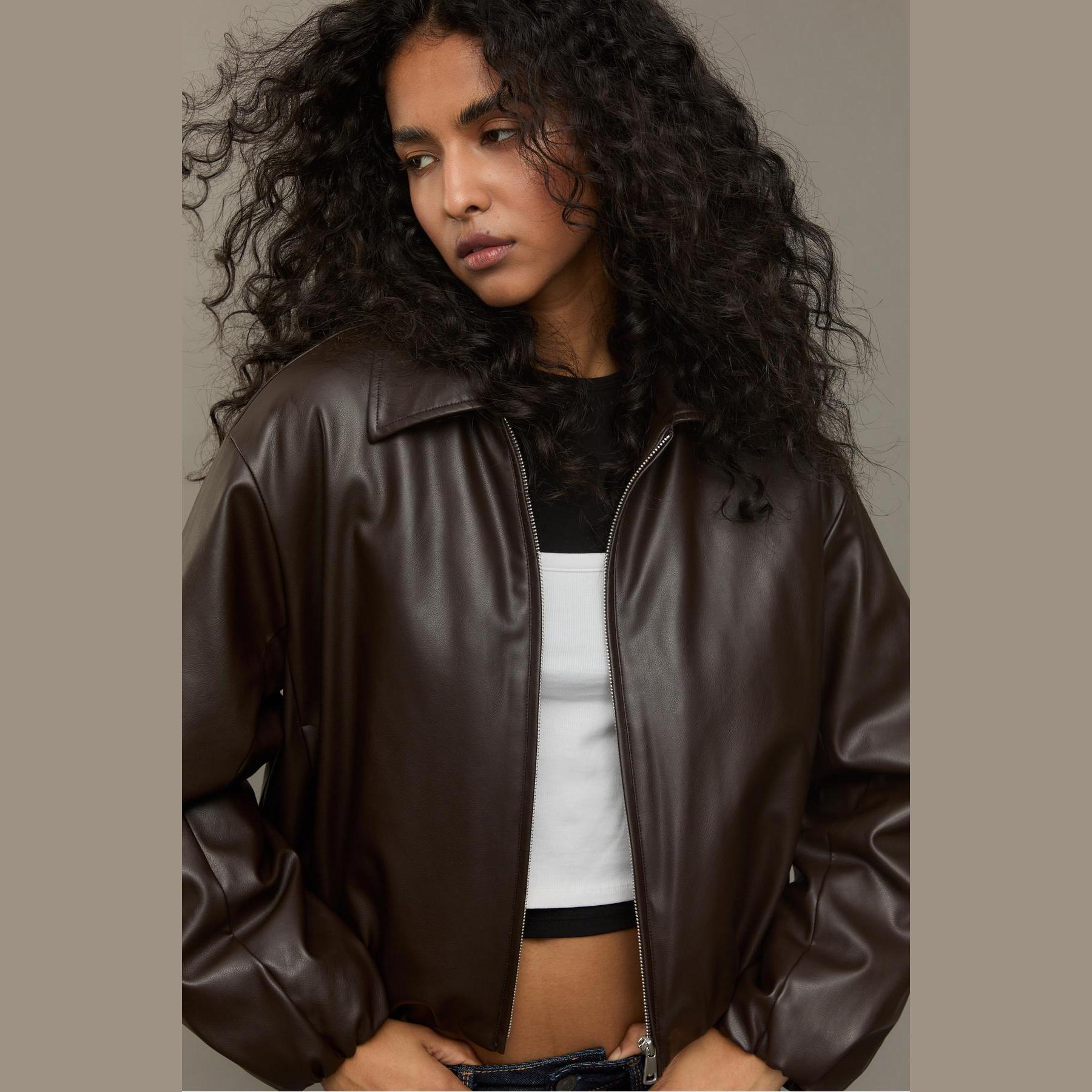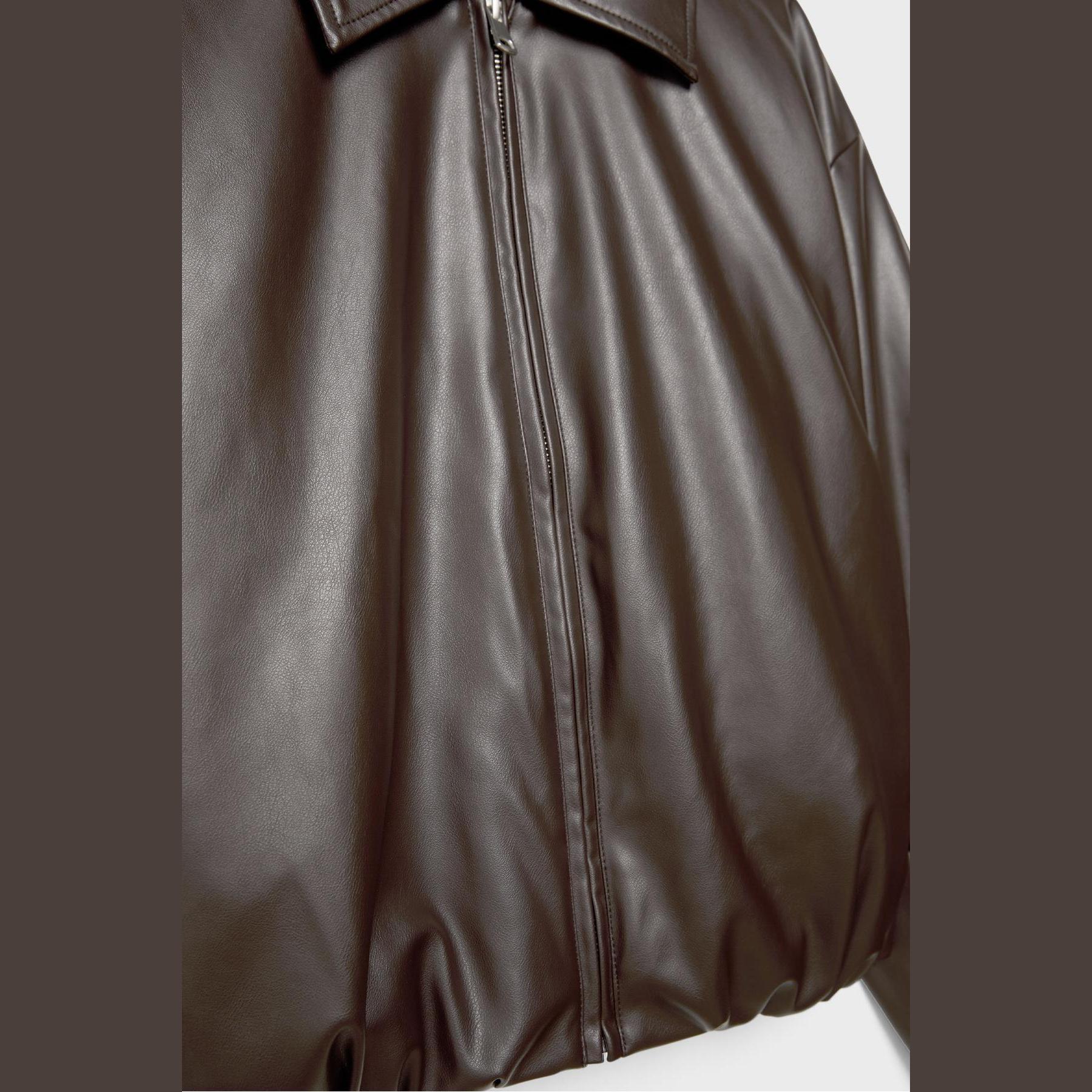 جاكيت شتوي أنيق من Stradivarius بلون بني، مصنوع من خامة جلد صناعي بتركيبة 50% بوليستر، 50% بولي يوريثان، يتميز بقصة Bomber Fit، ياقة بومبر مستقيمة، أكمام طويلة مع أساور مطاطية، إغلاق أمامي بسحاب معدني، مزود بجيبين جانبيين، حافة سفلية مطاطية بستايل بالون، تصميم سادة بملمس جلدي ناعم، بدون بطانة، مثالي للتنسيق مع قطع كاجوال لإطلالة شتوية دافئة وعصرية.
