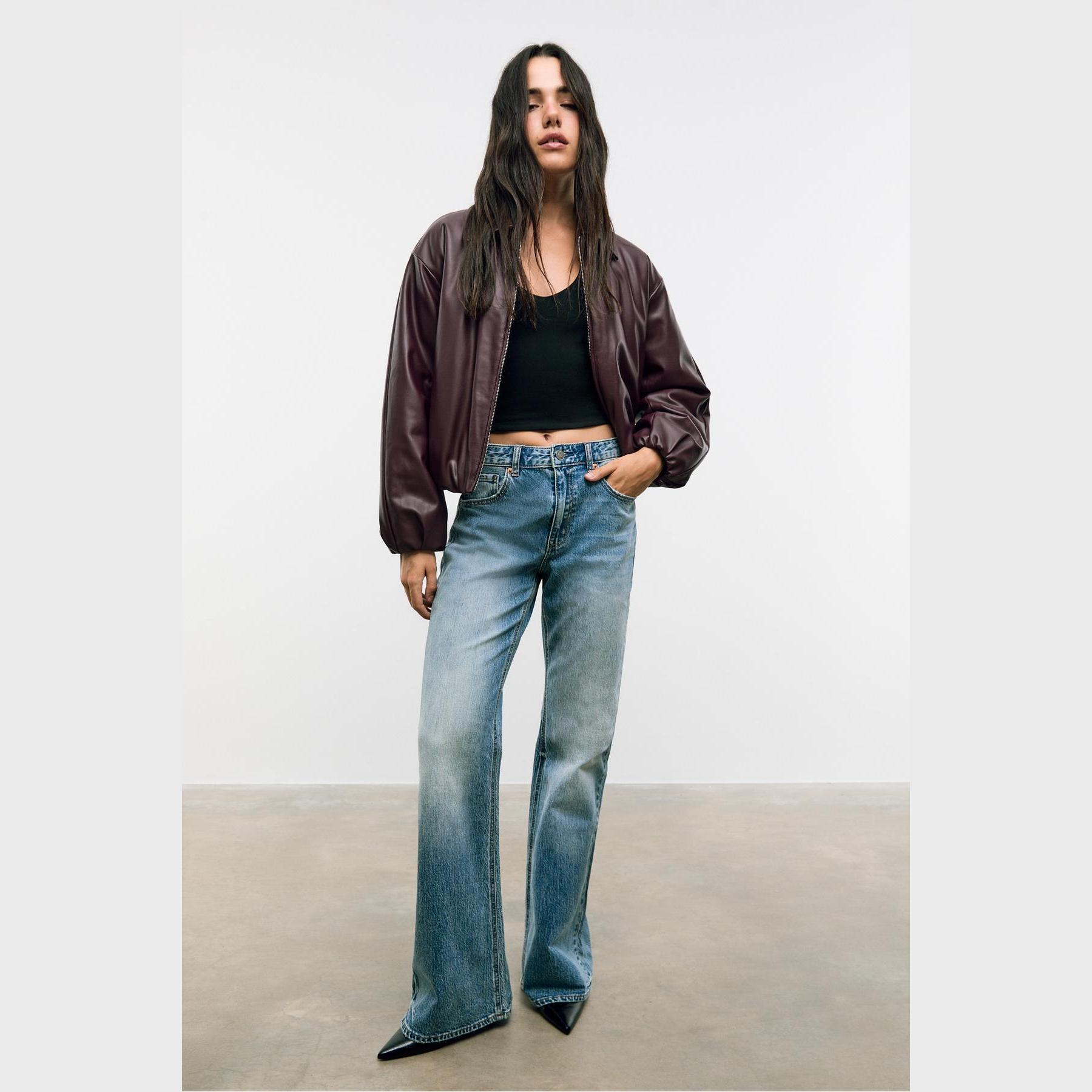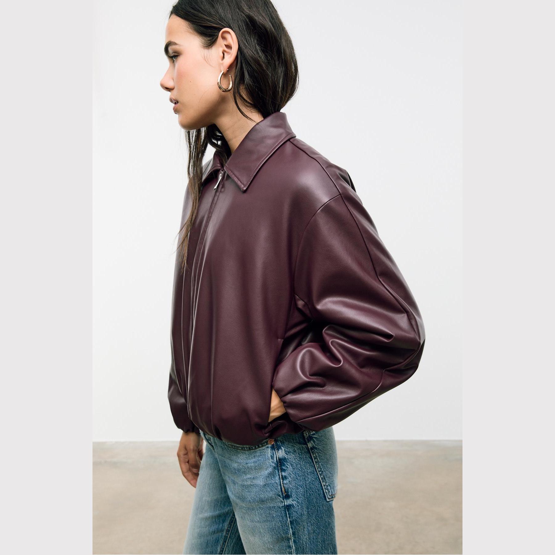 جاكيت شتوي أنيق من Stradivarius بلون بوردو، مصنوع من خامة جلد صناعي بتركيبة 50% بوليستر، 50% بولي يوريثان، يتميز بقصة Regular Fit، ياقة بومبر مستقيمة، أكمام طويلة مع أساور مطاطية، إغلاق أمامي بسحاب معدني، مزود بجيبين جانبيين، حافة سفلية مطاطية بستايل بالون، تصميم سادة بملمس جلدي ناعم، بدون بطانة، مثالي للتنسيق مع قطع كاجوال لإطلالة شتوية دافئة وعصرية.
