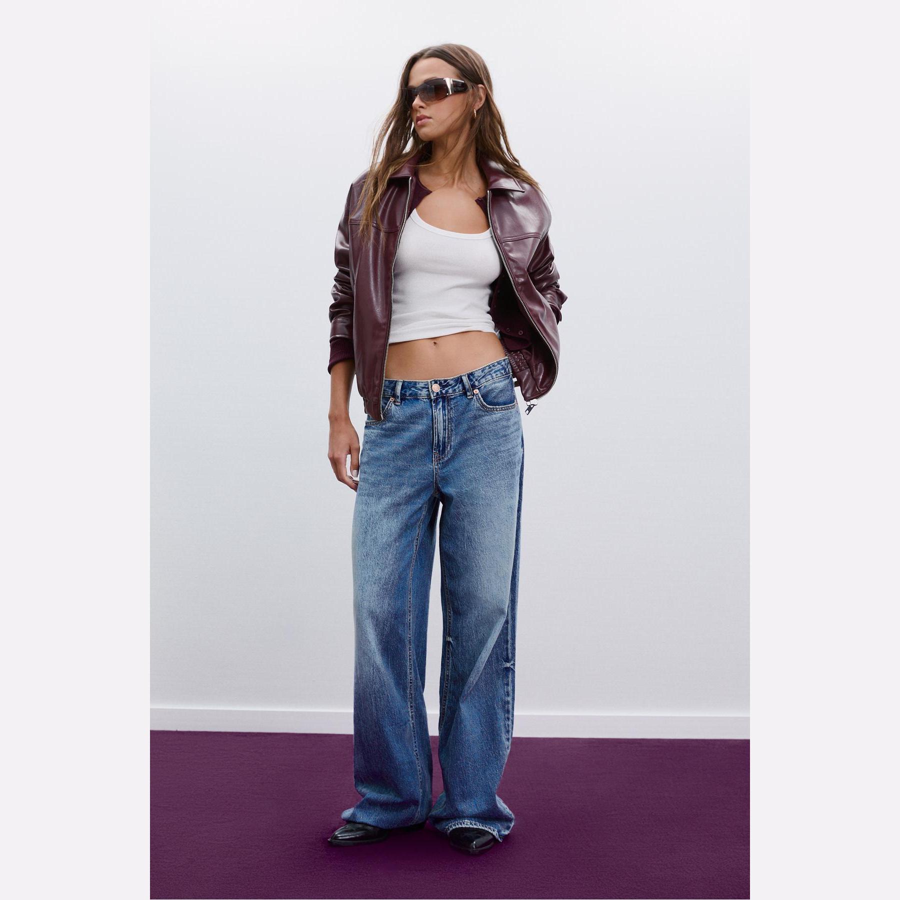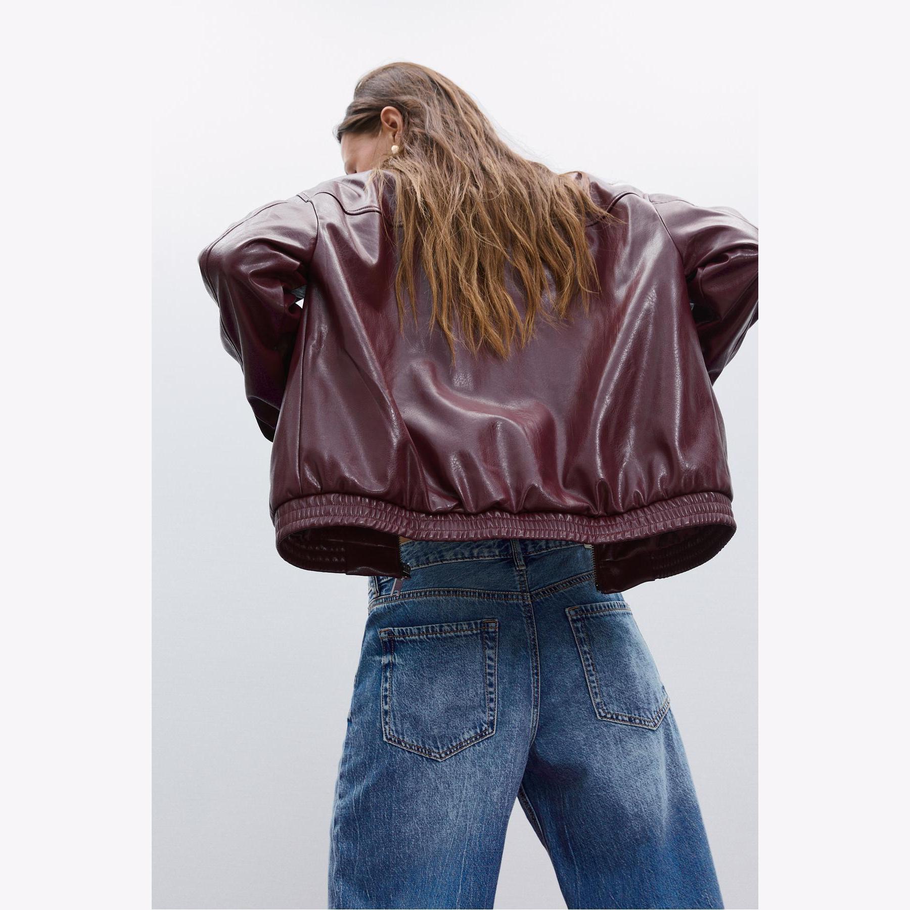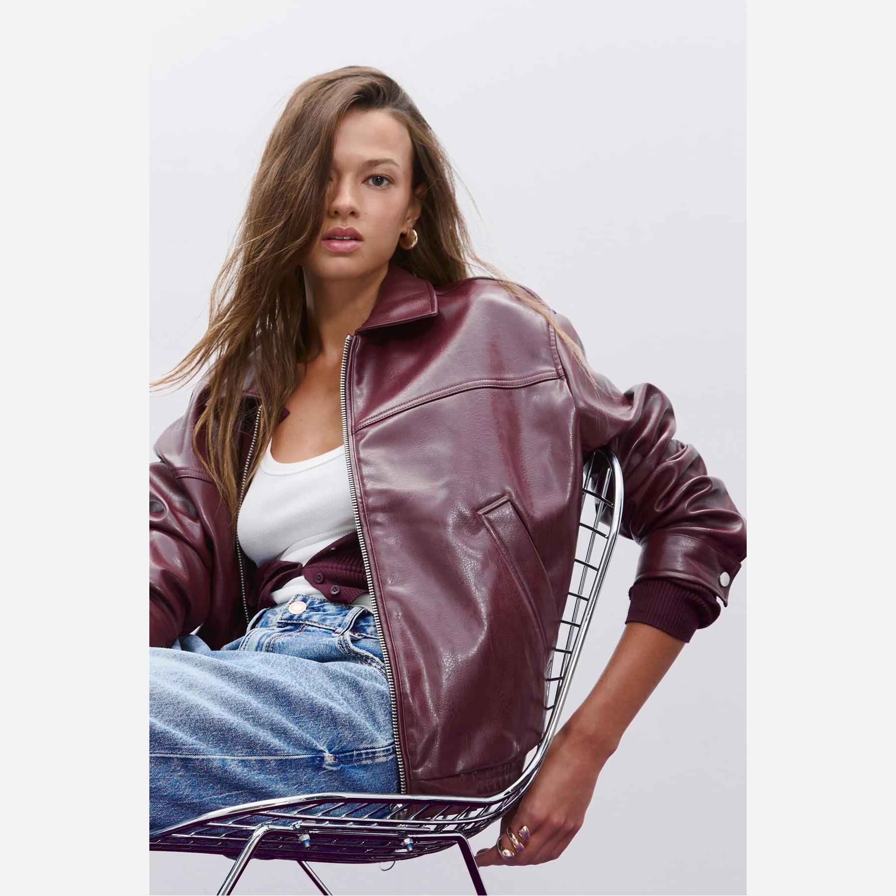 جاكيت بستايل Oversize من Stradivarius بلون بوردو، مصنوع من خامة جلد صناعي بتركيبة 63% بوليستر، 37% بولي يوريثان، يتميز بياقة شال مطوية، أكمام طويلة مع أساور بأزرار، إغلاق أمامي بسحاب معدني، مزود بجيوب جانبية بِييه، حافة سفلية مطاطية، تصميم سادة بملمس جلدي ناعم، بدون بطانة، مثالي للتنسيق مع قطع كاجوال لإطلالة حضرية جريئة.