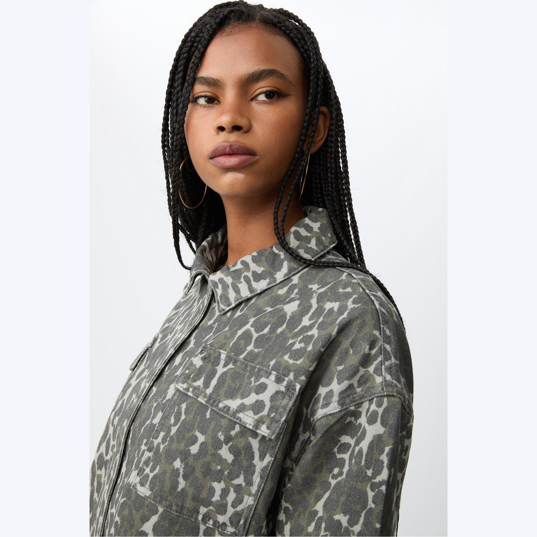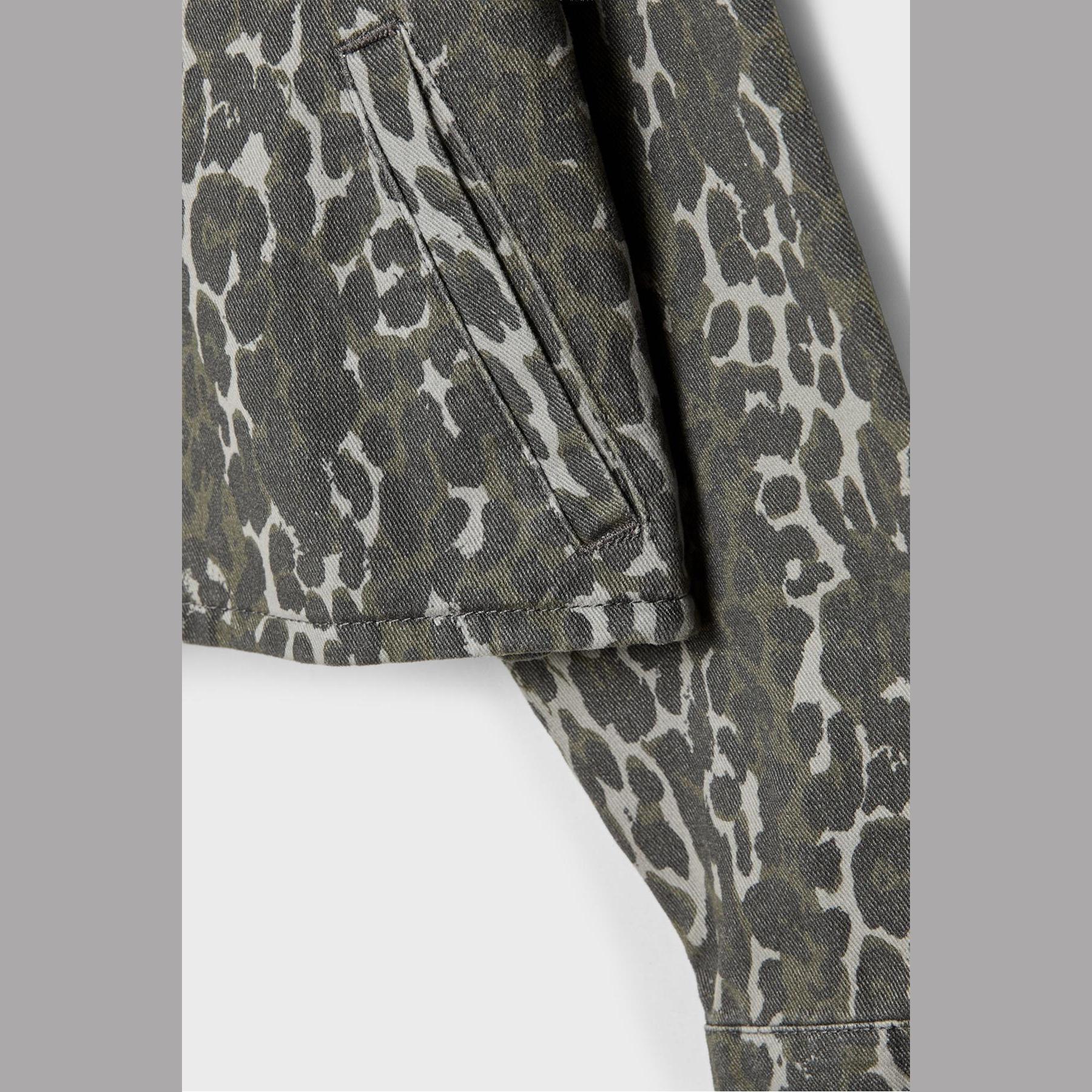 جاكيت عملي من Stradivarius بلون زيتي بنقشة مطبوعة، مصنوع من خامة قطنية بتركيبة 100% قطن، يتميز بقصة Regular Fit، ياقة ديكولتي مطوية، أكمام طويلة مع أساور بأزرار، إغلاق أمامي بكبسات معدنية، مزود بجيوب جانبية بِييه وجيوب صدرية بغطاء، تصميم قصير بنقشة مطبوعة، بدون بطانة، مثالي للتنسيق مع قطع كاجوال لإطلالة حضرية مريحة.