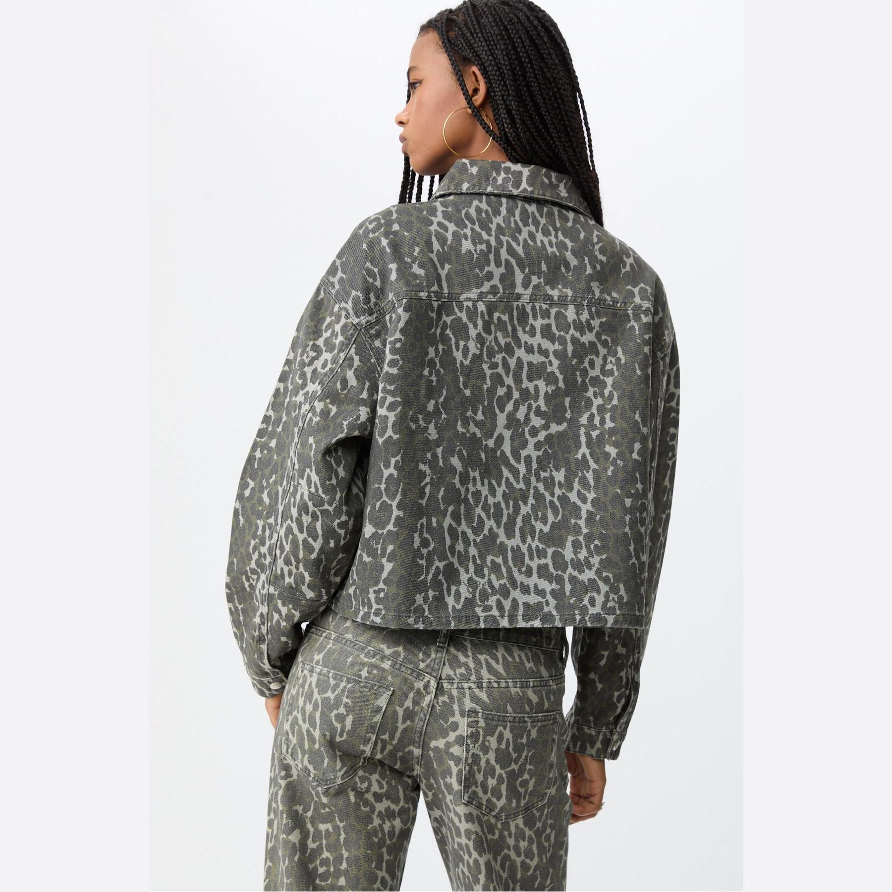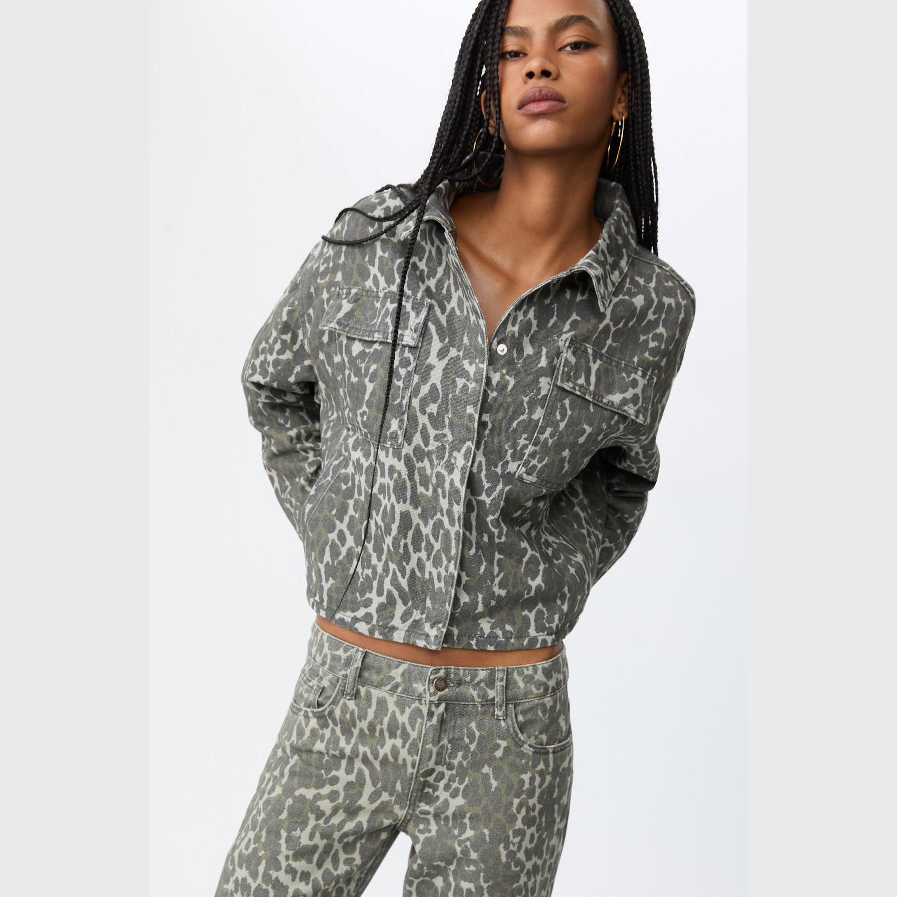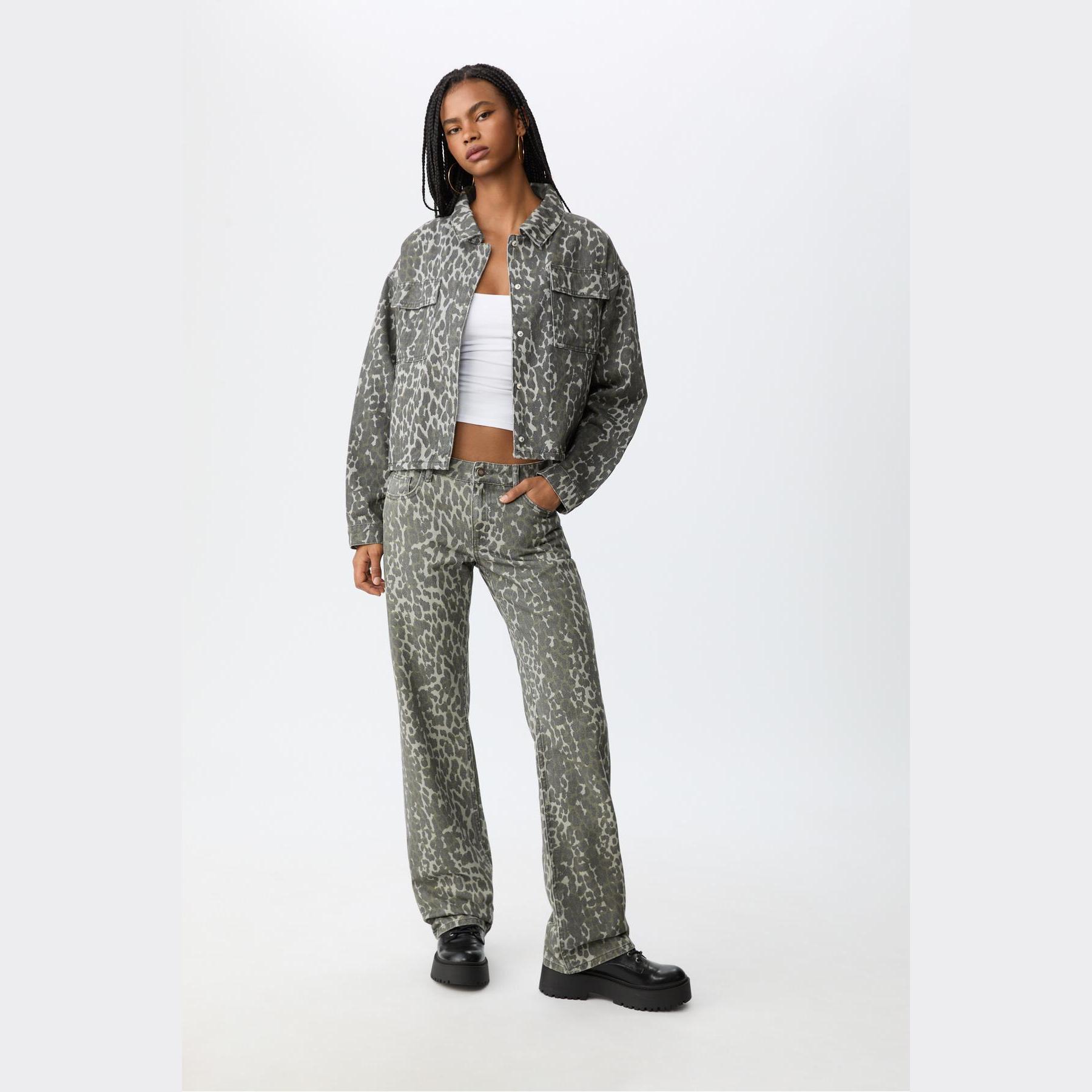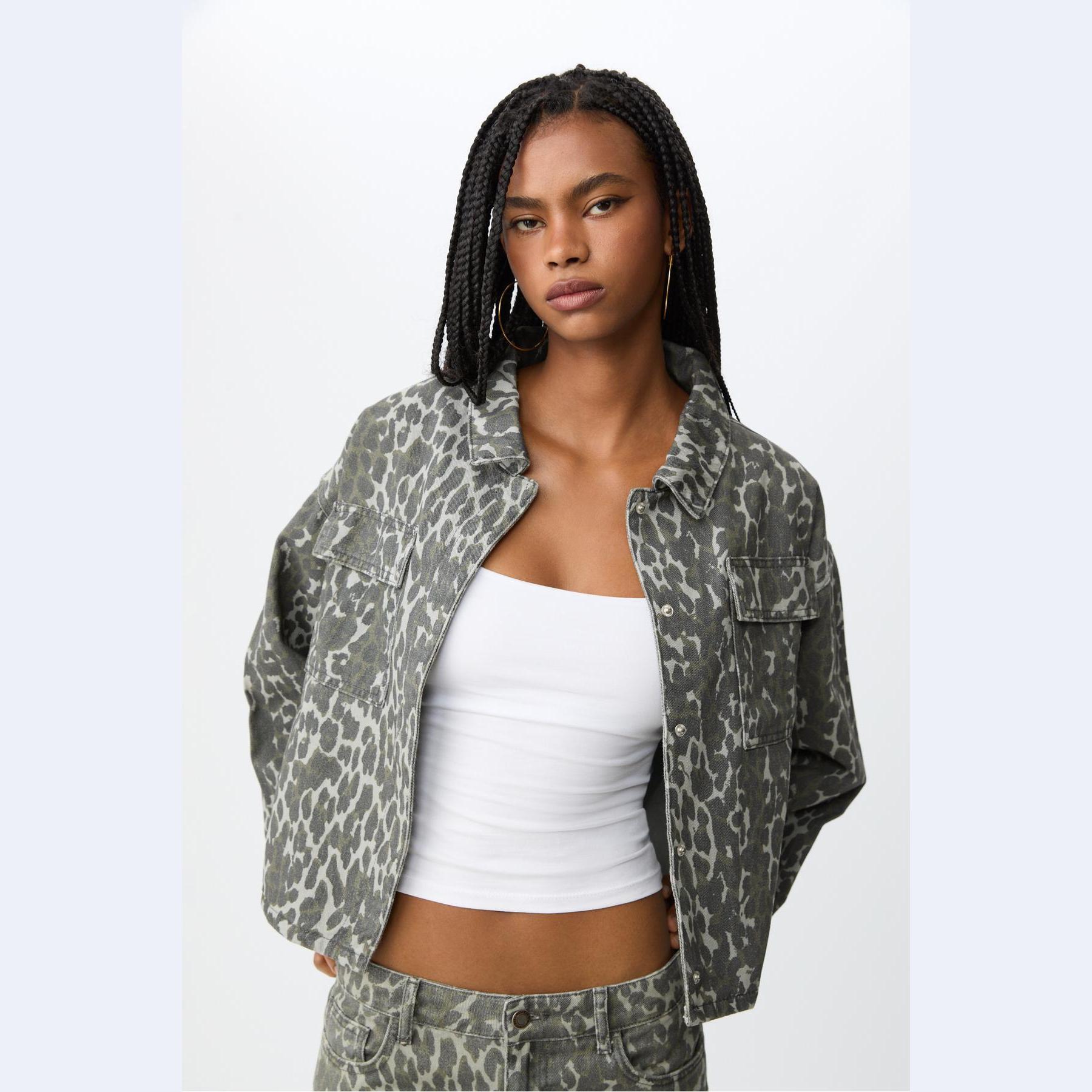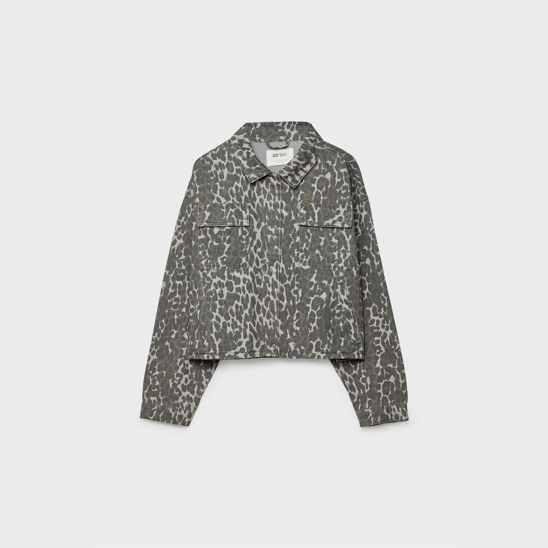 جاكيت قصير بنقشة مطبوعة وجيوب أمامية – زيتي من Stradivarius