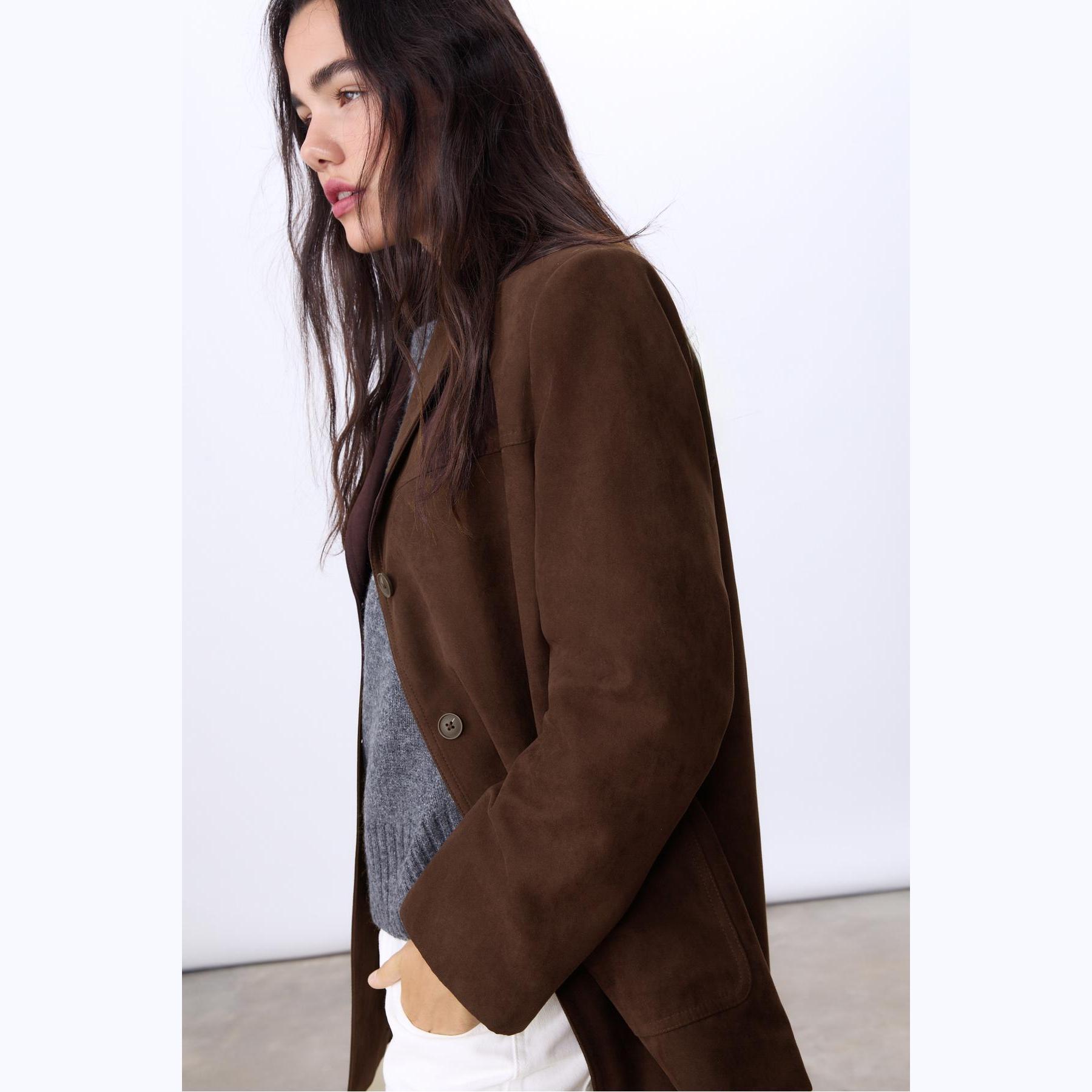 بليزر أنيق من Stradivarius بلون بني، مصنوع من خامة سويِد صناعي بتركيبة 100% بوليستر، يتميز بقصة Regular Fit، ياقة كلاسيكية مطوية، أكمام طويلة، إغلاق أمامي بأزرار، مزود بجيوب أمامية يدوية (يامة)، تصميم سادة بملمس ناعم، بدون بطانة، مثالي للتنسيق مع بنطال رسمي أو تنورة لإطلالة مكتبية أو يومية أنيقة.