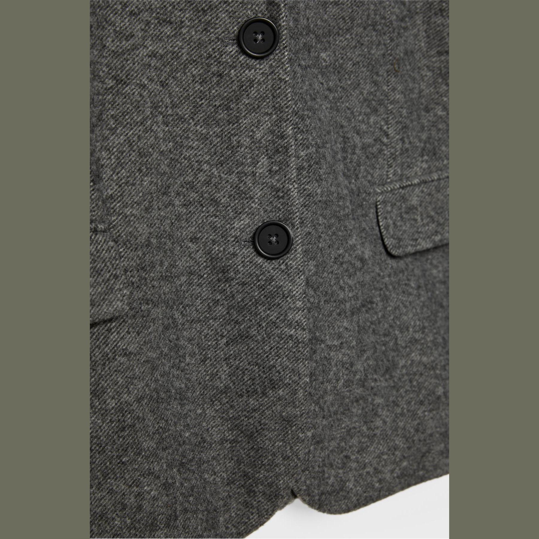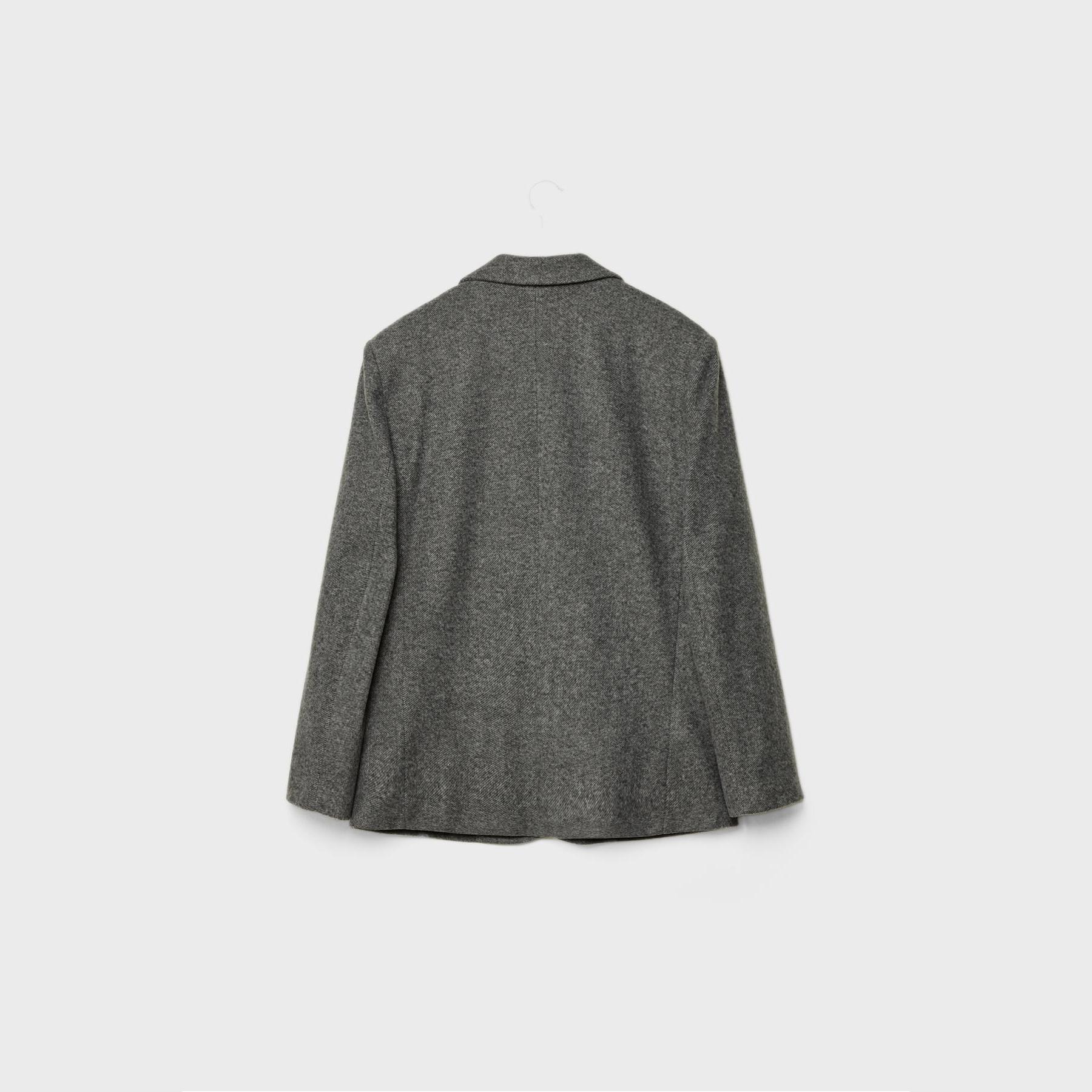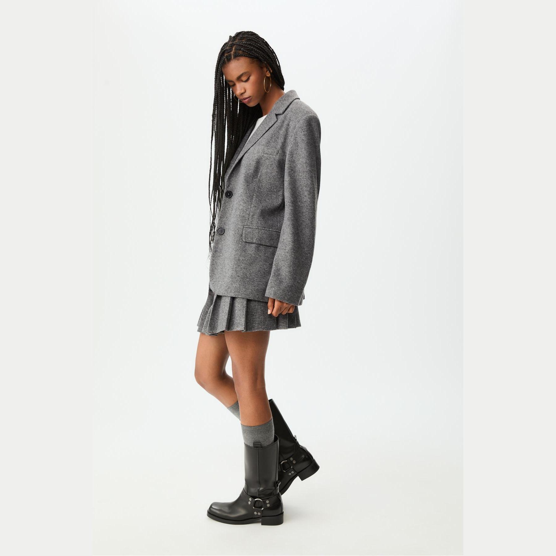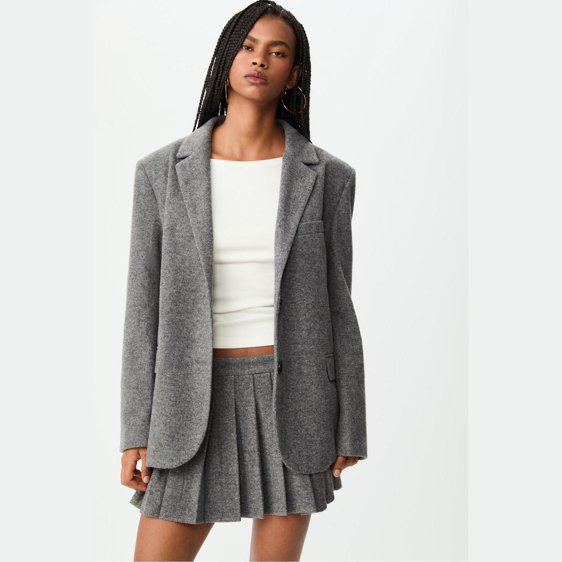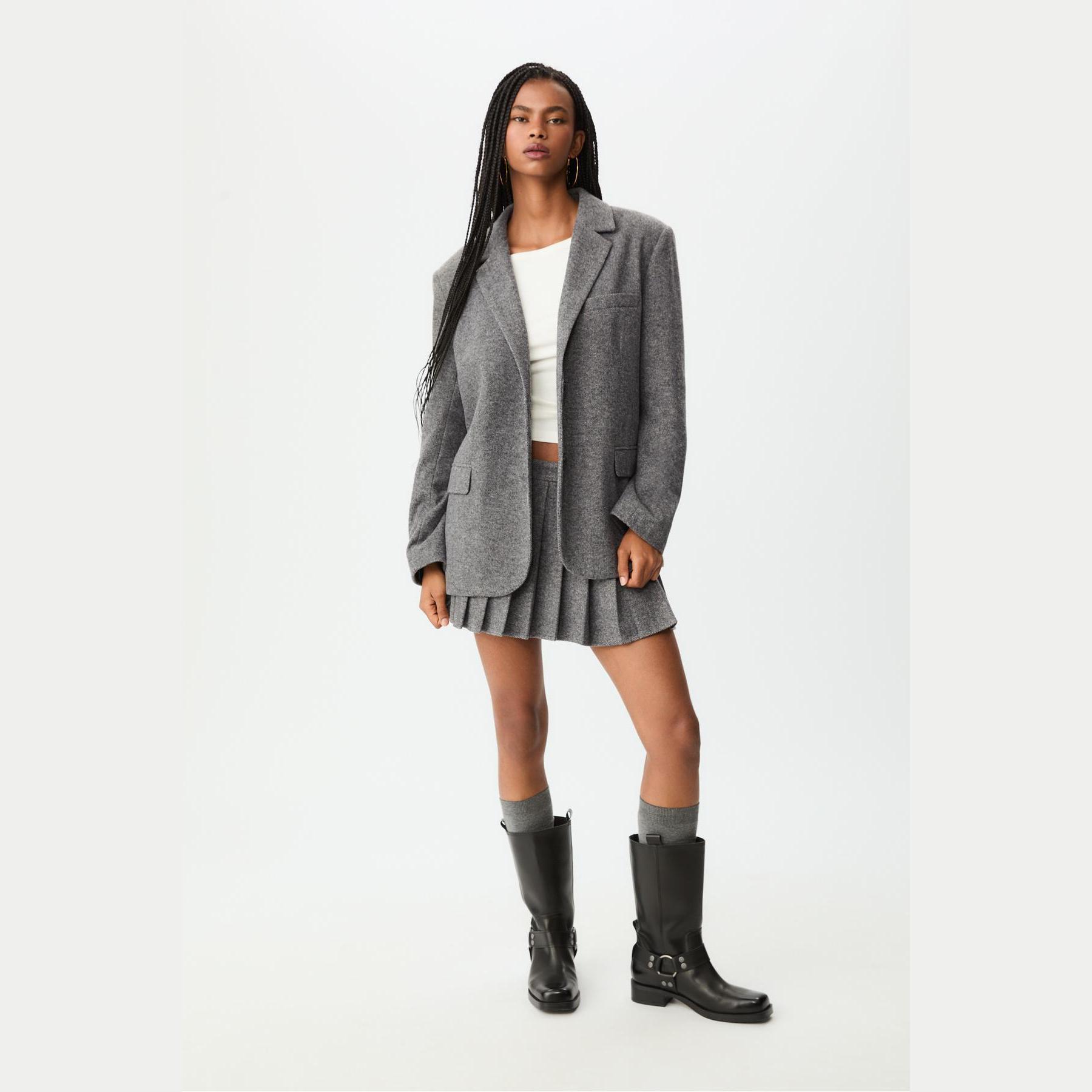 بليزر أنيق من Stradivarius بلون رمادي بنقشة عظم السمكة، مصنوع من خامة ناعمة بتركيبة 100% بوليستر، يتميز بقصة Oversize، ياقة كروڤاز مطوية، أكمام طويلة، إغلاق أمامي بأزرار، مزود بجيوب أمامية بغطاء وجيوب صدرية بِييه، تصميم سادة بنقشة Balıksırtı، بدون بطانة، مثالي للتنسيق مع بنطال رسمي أو تنورة لإطلالة مكتبية أو يومية أنيقة.