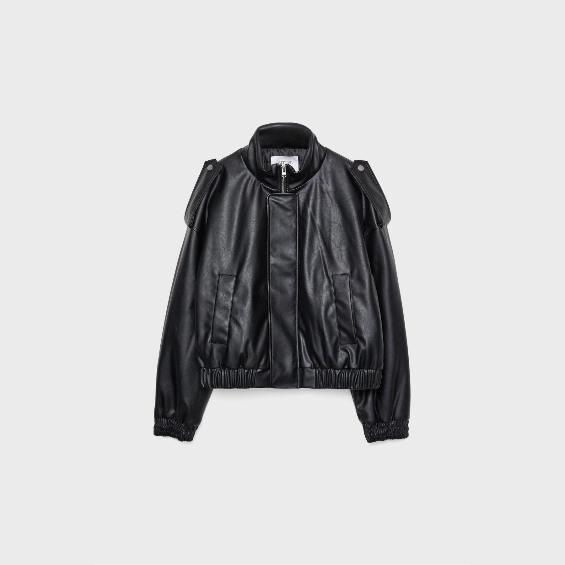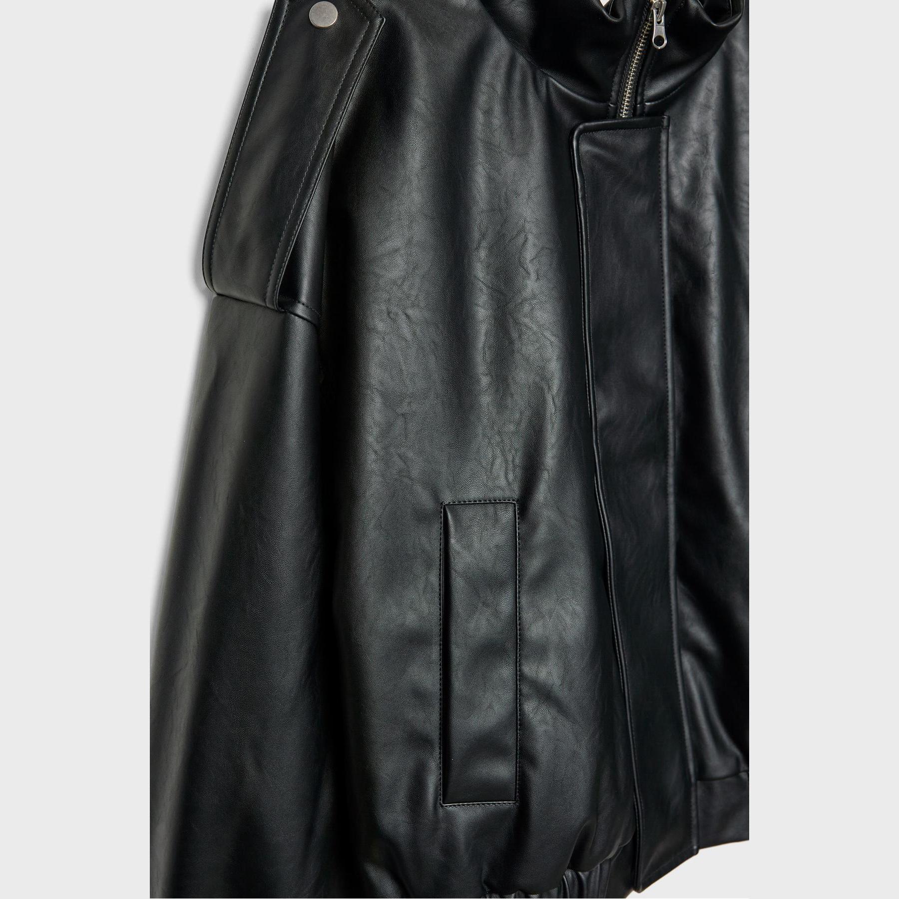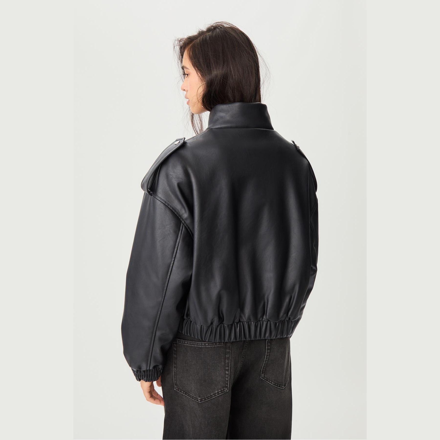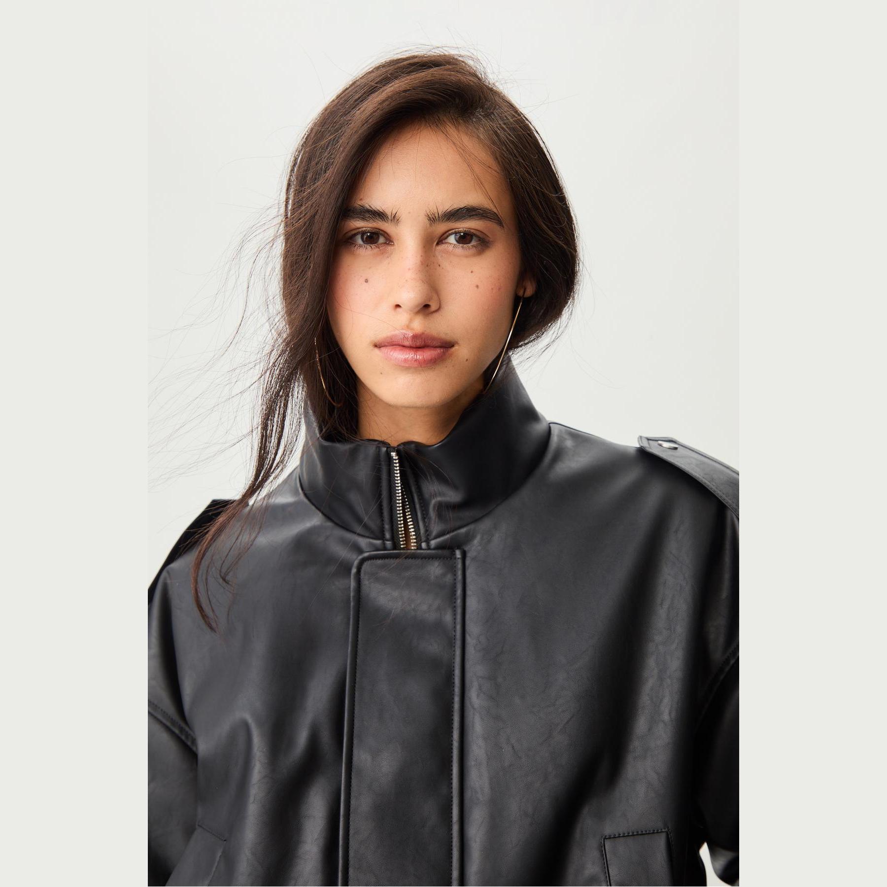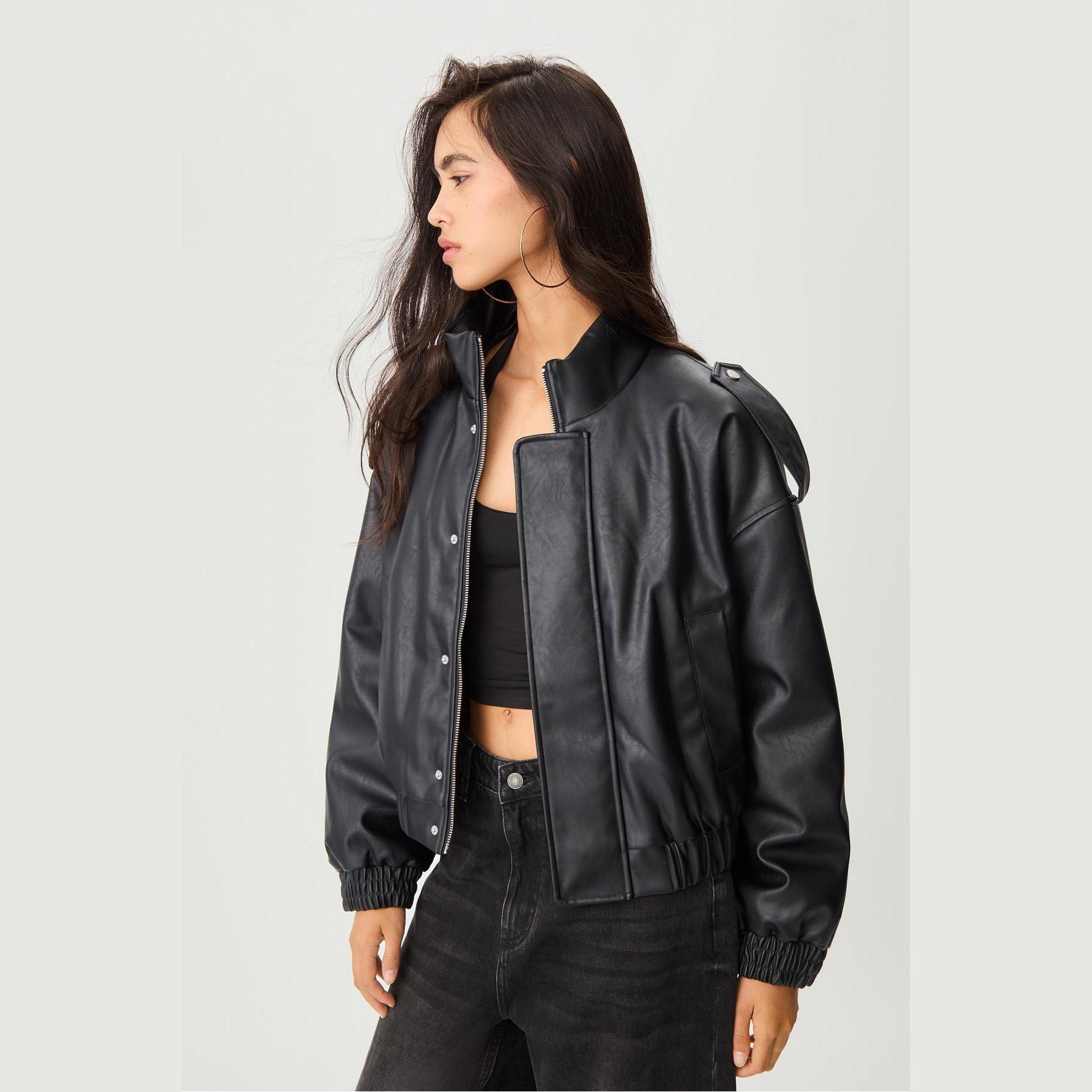 جاكيت بومبر أنيق من Stradivarius بلون أسود، مصنوع من خامة جلد صناعي بتركيبة 65% بولي يوريثان، 35% بوليستر، يتميز بقصة Regular Fit، ياقة بومبر مستقيمة، أكمام طويلة مع أساور مطاطية، إغلاق أمامي بسحاب معدني مخفي تحت باتليت بكبسات، مزود بجيوب جانبية بِييه، مزين بتفاصيل أكتاف بأبوَلت، حافة سفلية مطاطية، تصميم سادة بدون بطانة، مثالي للتنسيق مع قطع كاجوال لإطلالة حضرية عصرية.