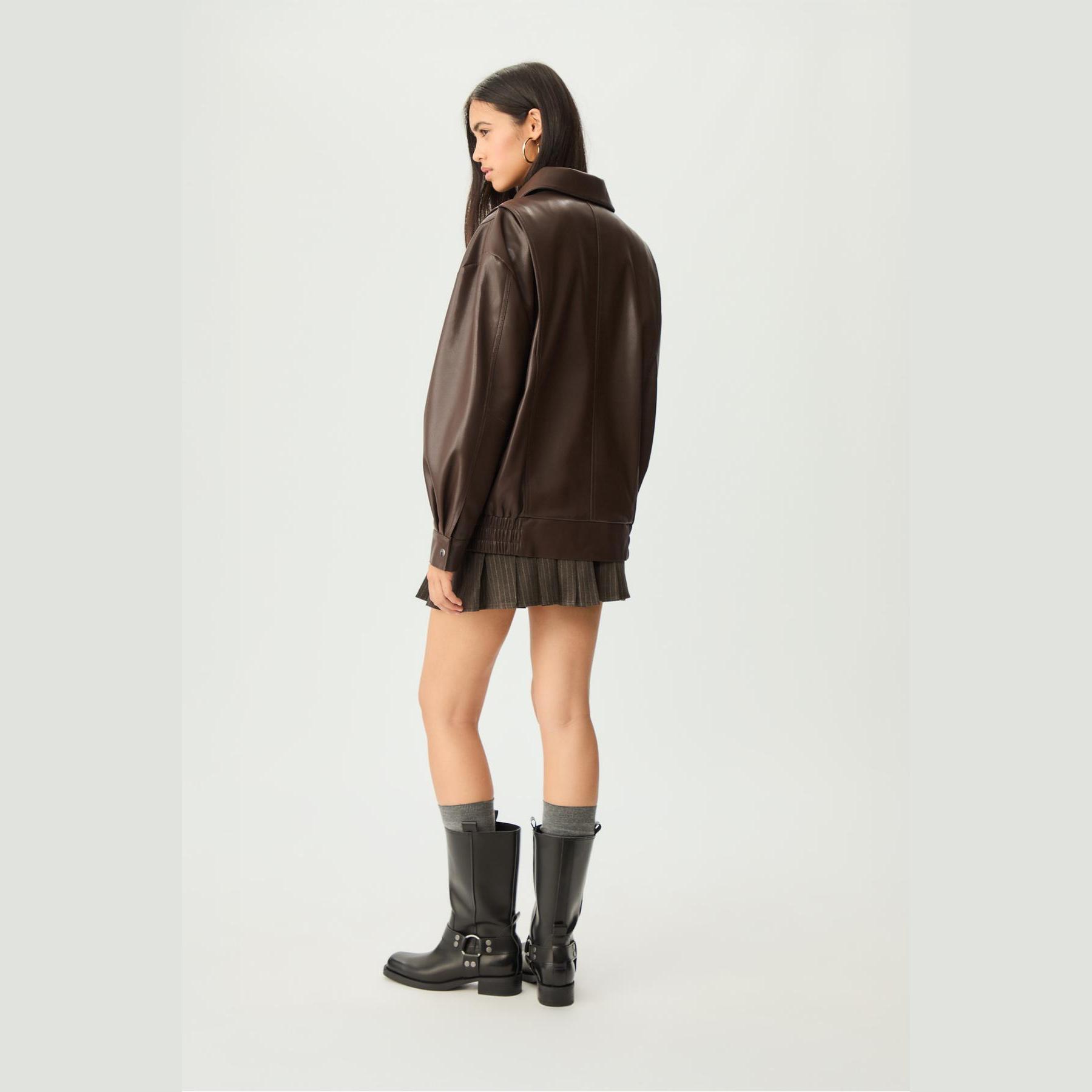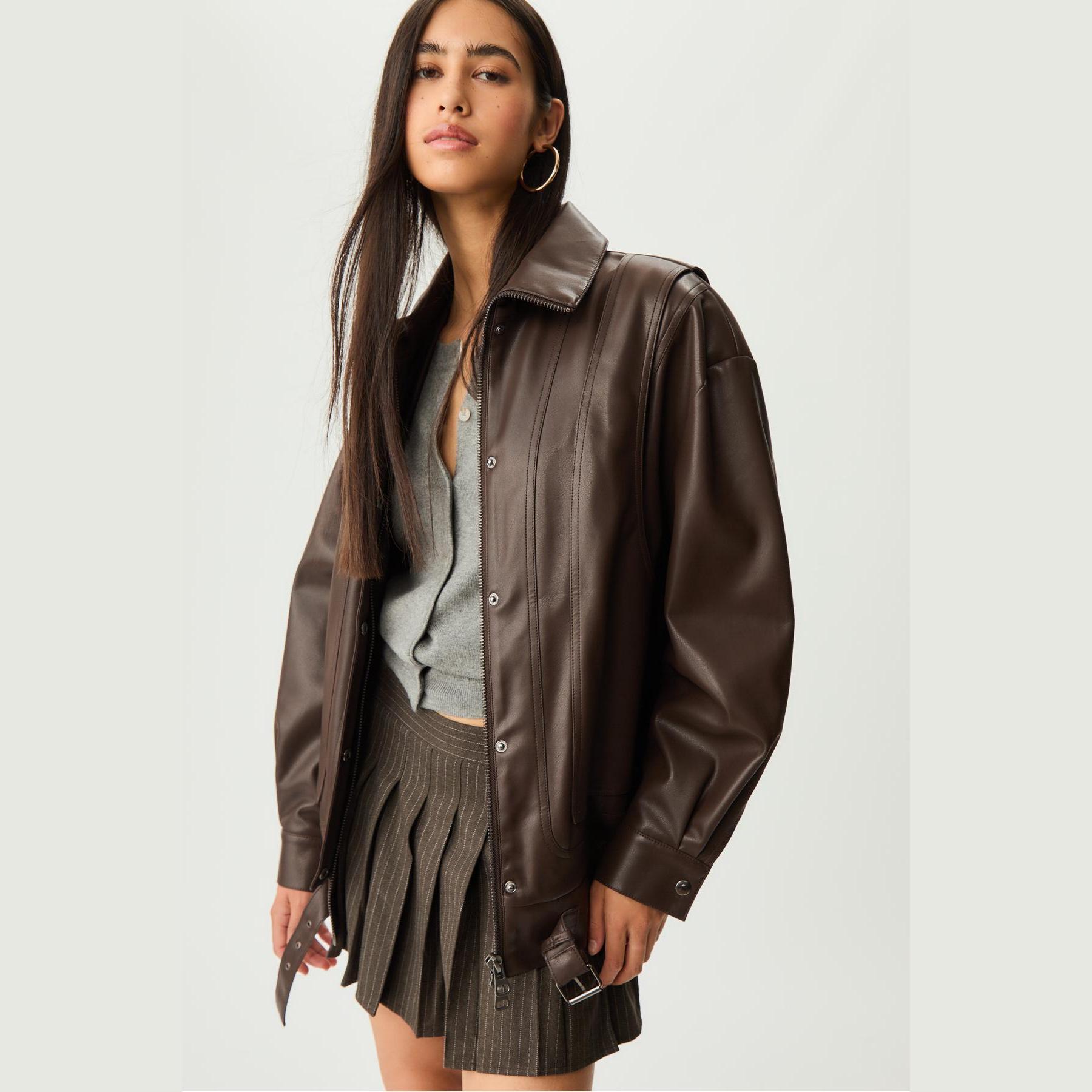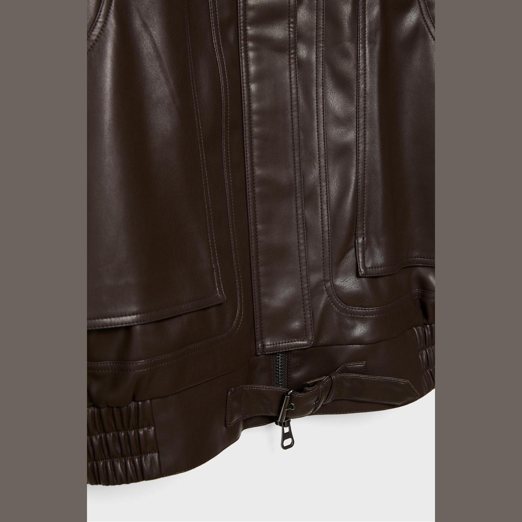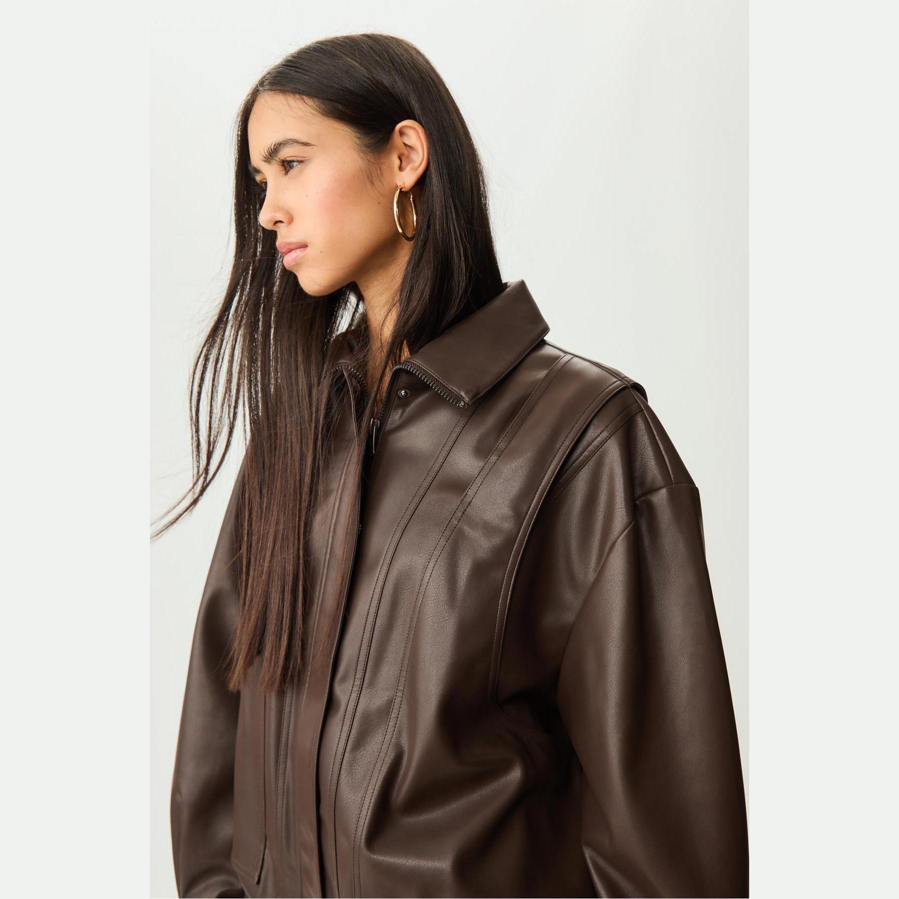 جاكيت أنيق من Stradivarius بلون بني، مصنوع من خامة جلد صناعي بتركيبة 50% بوليستر، 50% بولي يوريثان، يتميز بقصة Oversize، ياقة كلاسيكية، أكمام طويلة بكُمّات بأزرار، إغلاق أمامي بسحاب معدني مخفي تحت باتليت بكبسات، مزود بجيوب جانبية مزدوجة، تصميم سادة بملمس Dokuma، بدون بطانة، حافة سفلية مطاطية، مثالي للتنسيق مع قطع كاجوال لإطلالة حضرية عصرية.