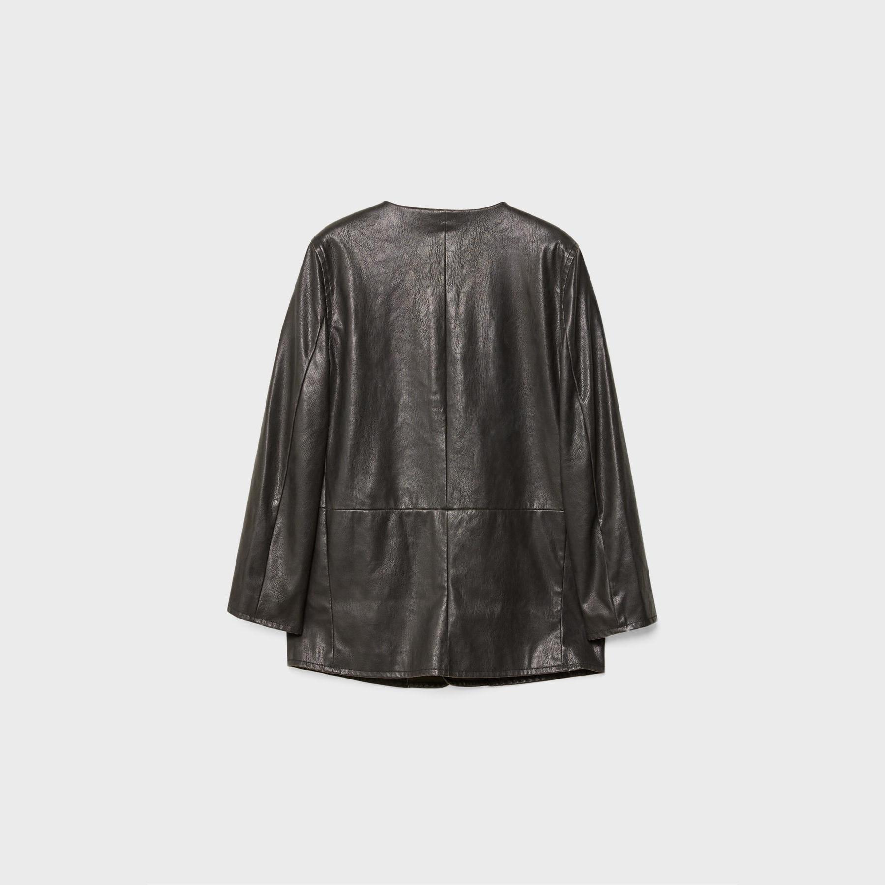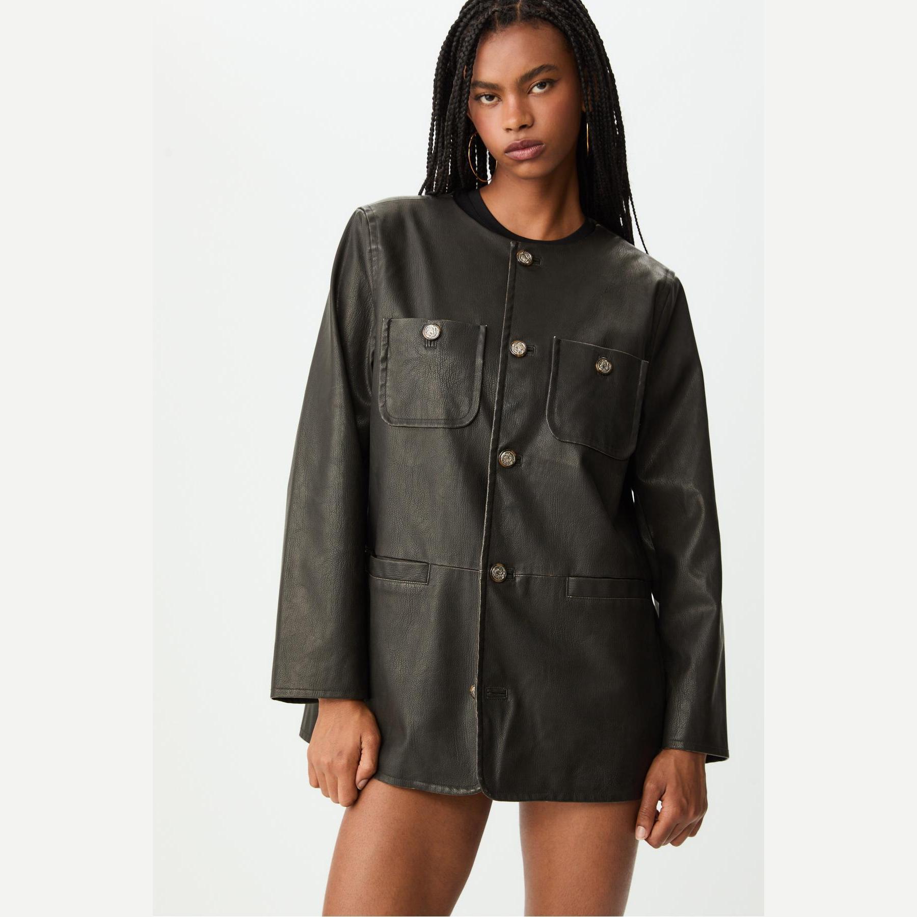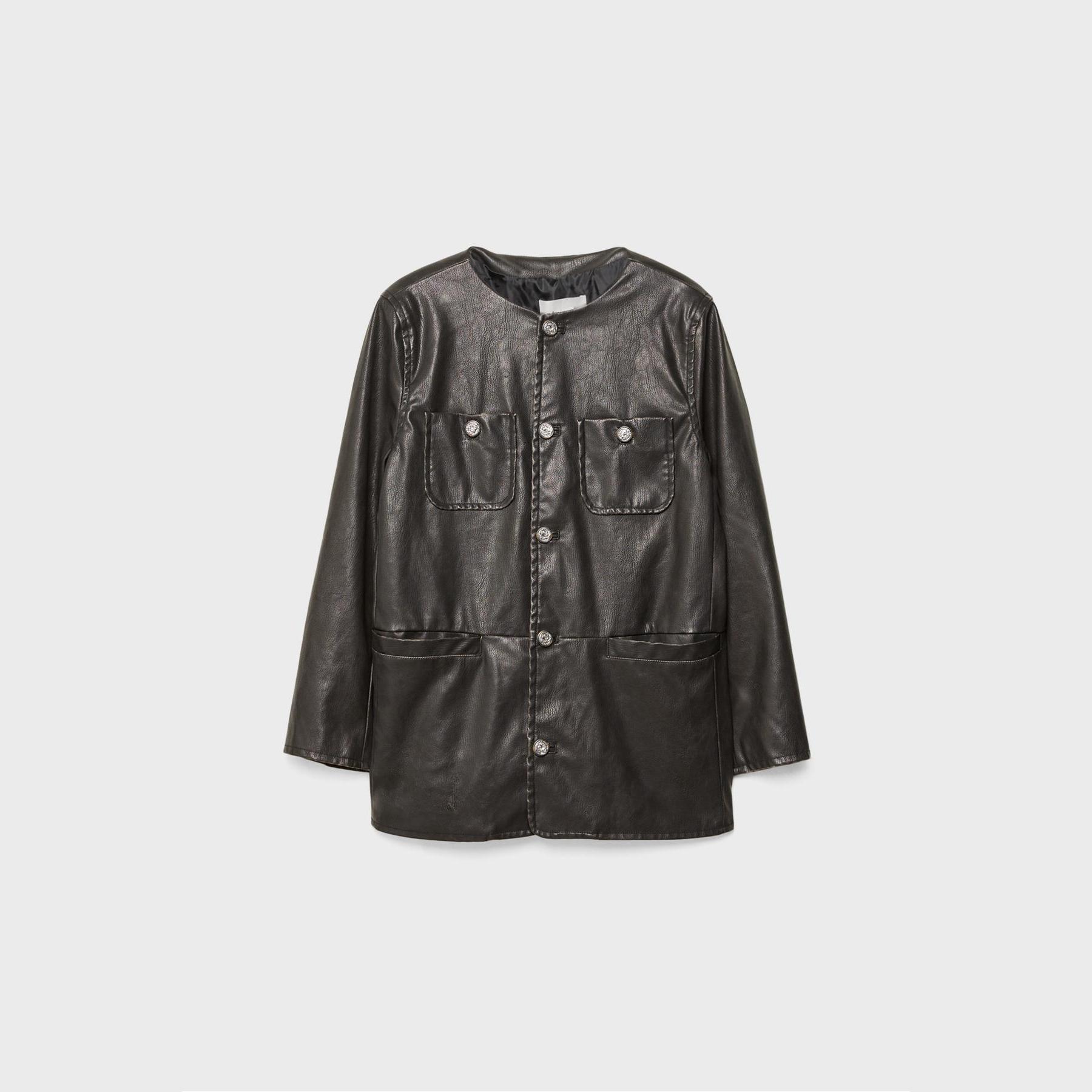 بليزر أنيق من Stradivarius بلون أسود، مصنوع من خامة جلد صناعي بتركيبة 65% بولي يوريثان، 35% بوليستر، يتميز بقصة Oversize، ياقة دائرية، أكمام طويلة، إغلاق أمامي بأزرار بارزة بنقشة مزخرفة، مزود بجيب أمامي على الصدر بغطاء، وجيوب بِييه جانبية، تصميم Dokuma بملمس جلد صناعي ناعم، بدون بطانة، مثالي للتنسيق مع قطع رسمية أو كاجوال لإطلالة حضرية أنيقة.