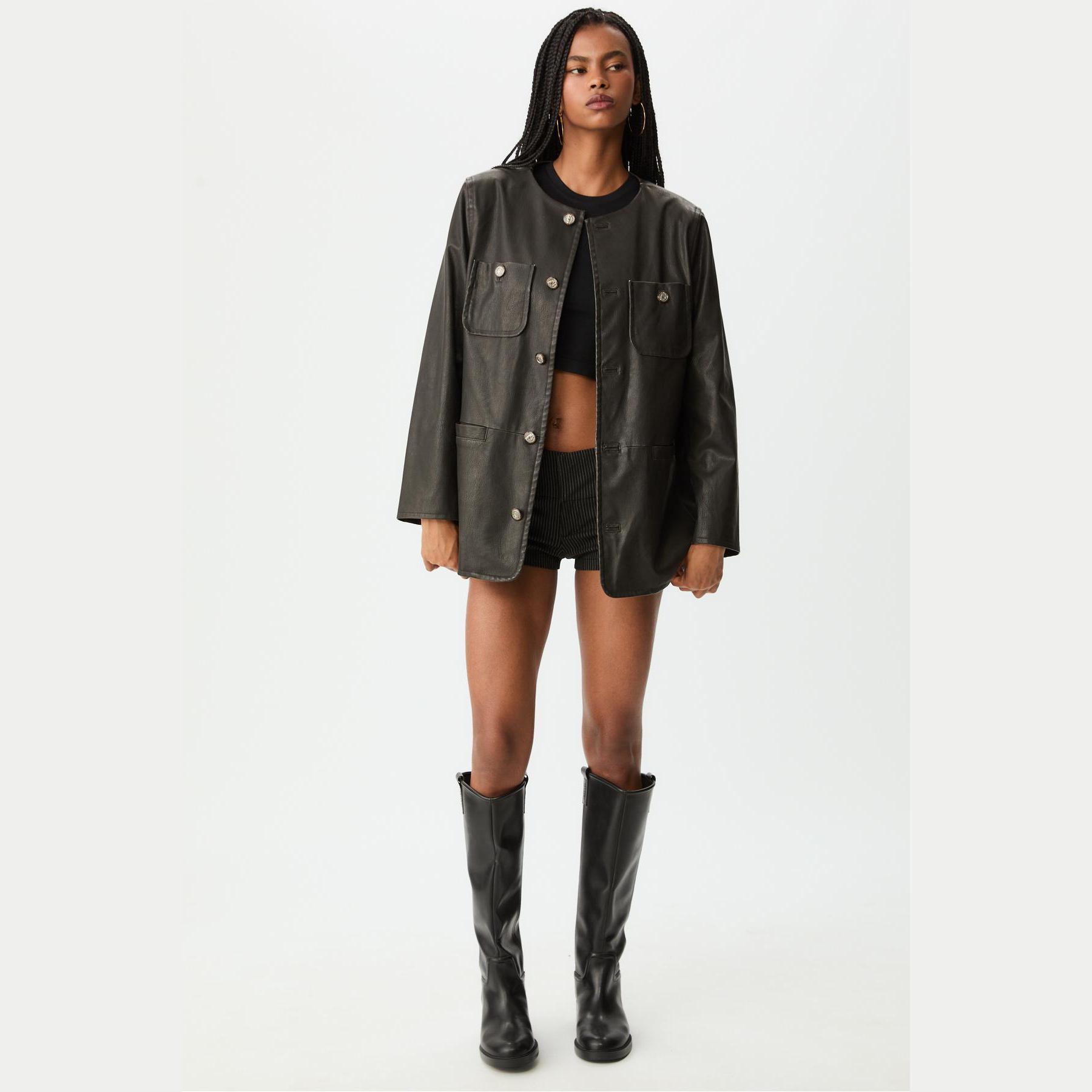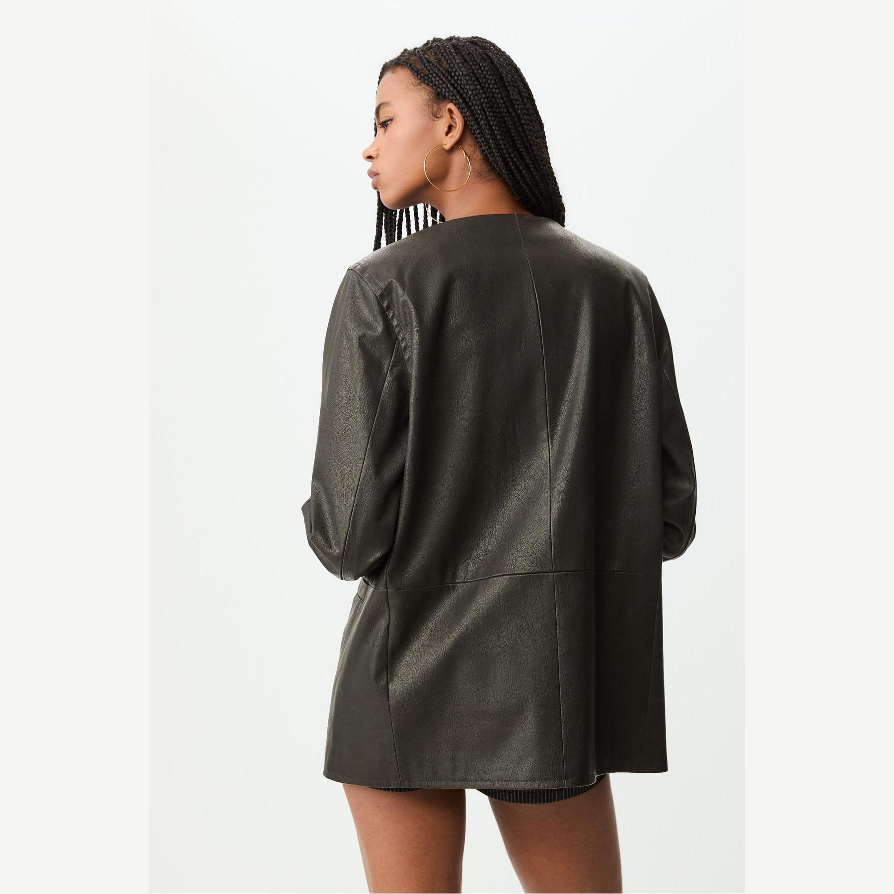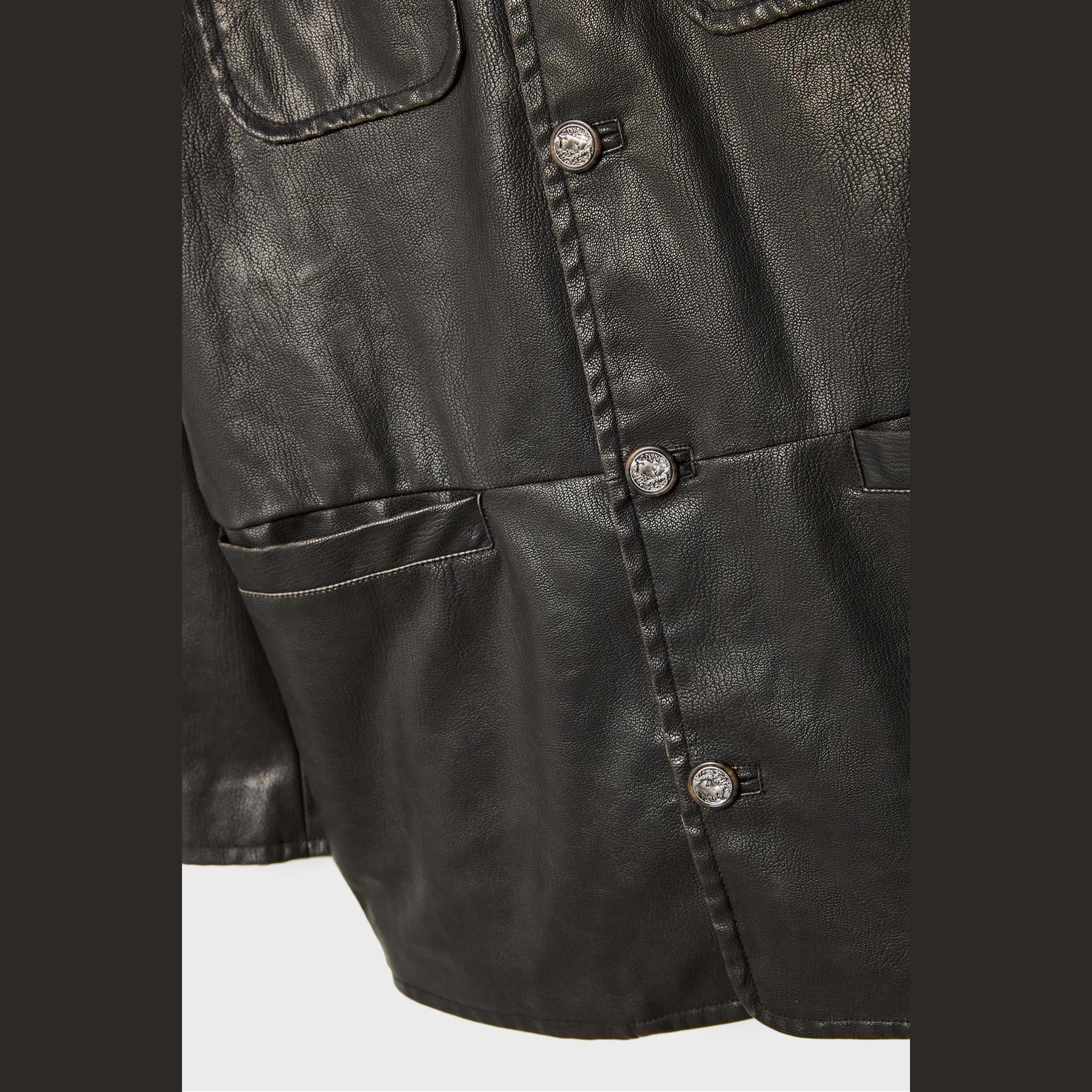 بليزر أنيق من Stradivarius بلون أسود، مصنوع من خامة جلد صناعي بتركيبة 65% بولي يوريثان، 35% بوليستر، يتميز بقصة Oversize، ياقة دائرية، أكمام طويلة، إغلاق أمامي بأزرار بارزة بنقشة مزخرفة، مزود بجيب أمامي على الصدر بغطاء، وجيوب بِييه جانبية، تصميم Dokuma بملمس جلد صناعي ناعم، بدون بطانة، مثالي للتنسيق مع قطع رسمية أو كاجوال لإطلالة حضرية أنيقة.