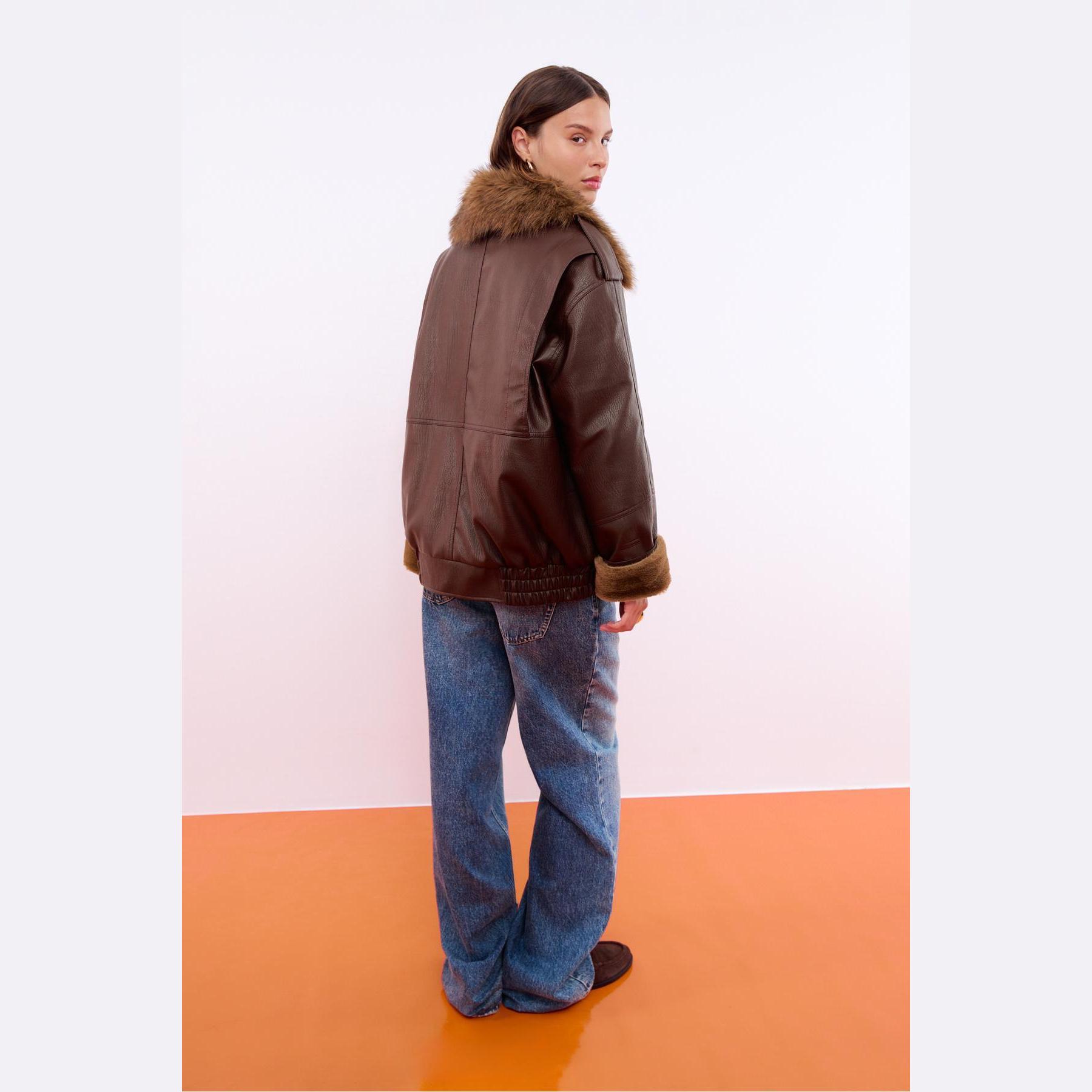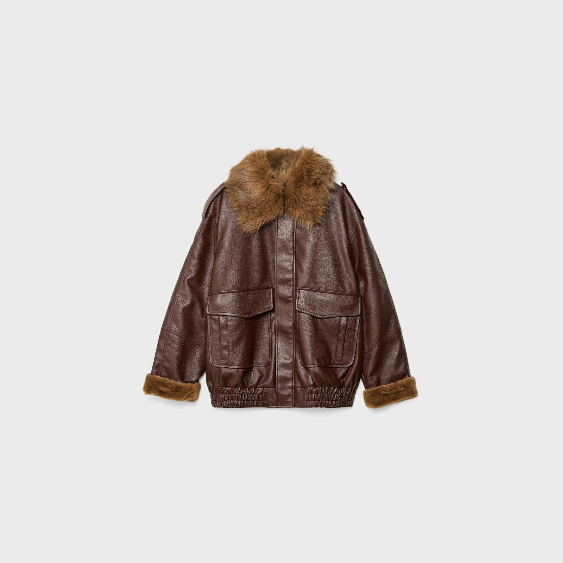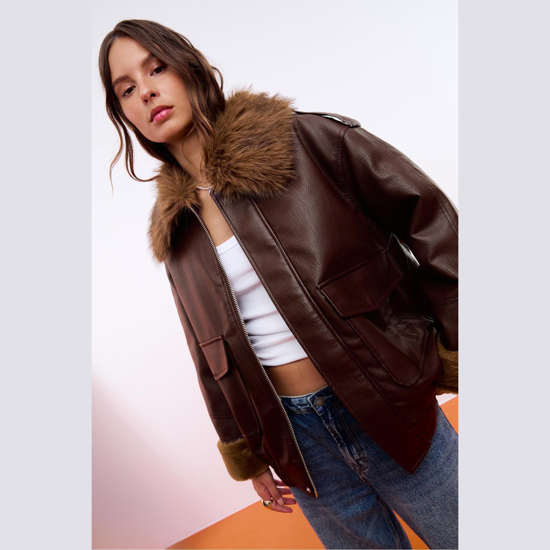 جاكيت شتوي أنيق من Stradivarius بلون بني، مصنوع من خامة جلد صناعي بتركيبة 65% بولي يوريثان، 35% بوليستر، يتميز بقصة Regular Fit، ياقة مركبة مزودة بتفصيل فرو صناعي قابل للفصل، أكمام طويلة بكُمّات منحنية، إغلاق أمامي بسحاب معدني مخفي تحت باتليت بكبسات، مزود بجيوب أمامية يامة بغطاء وجيوب جانبية بِييه، تصميم Dokuma بملمس جلد صناعي، حافة سفلية مطاطية، مثالي للتنسيق مع قطع كاجوال لإطلالة شتوية دافئة وعصرية.