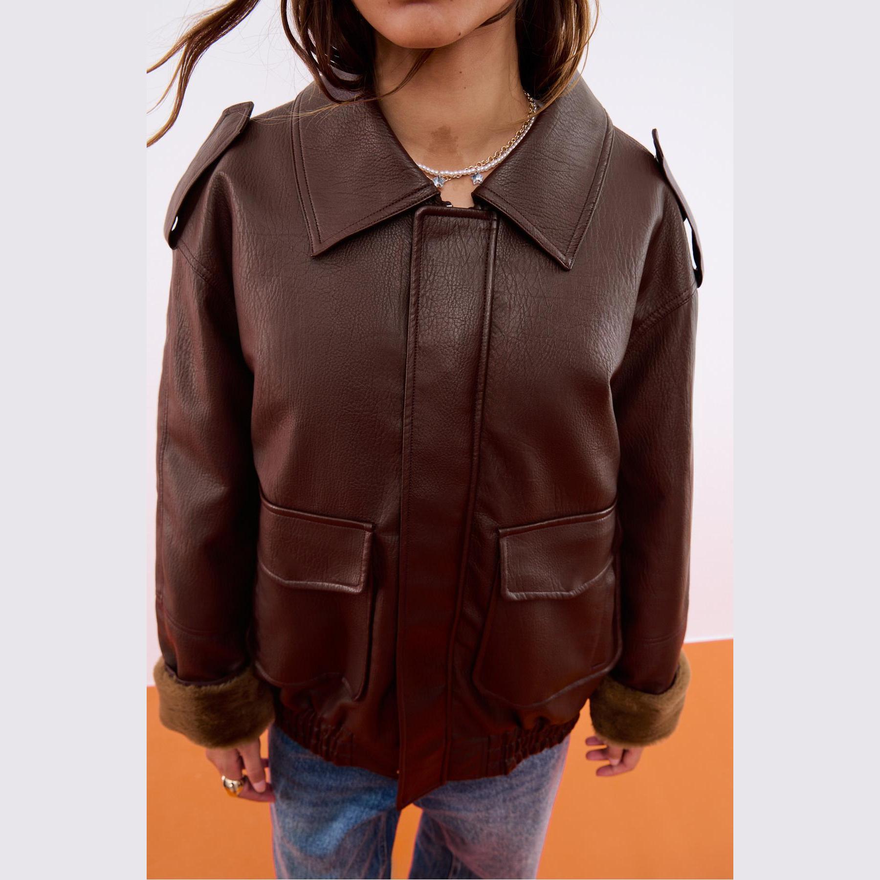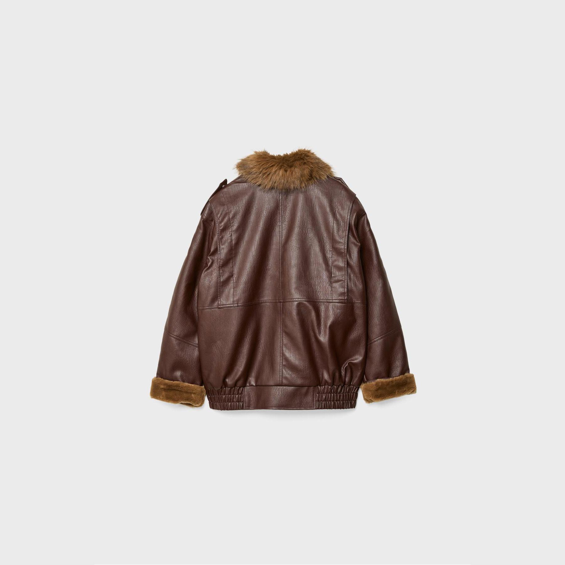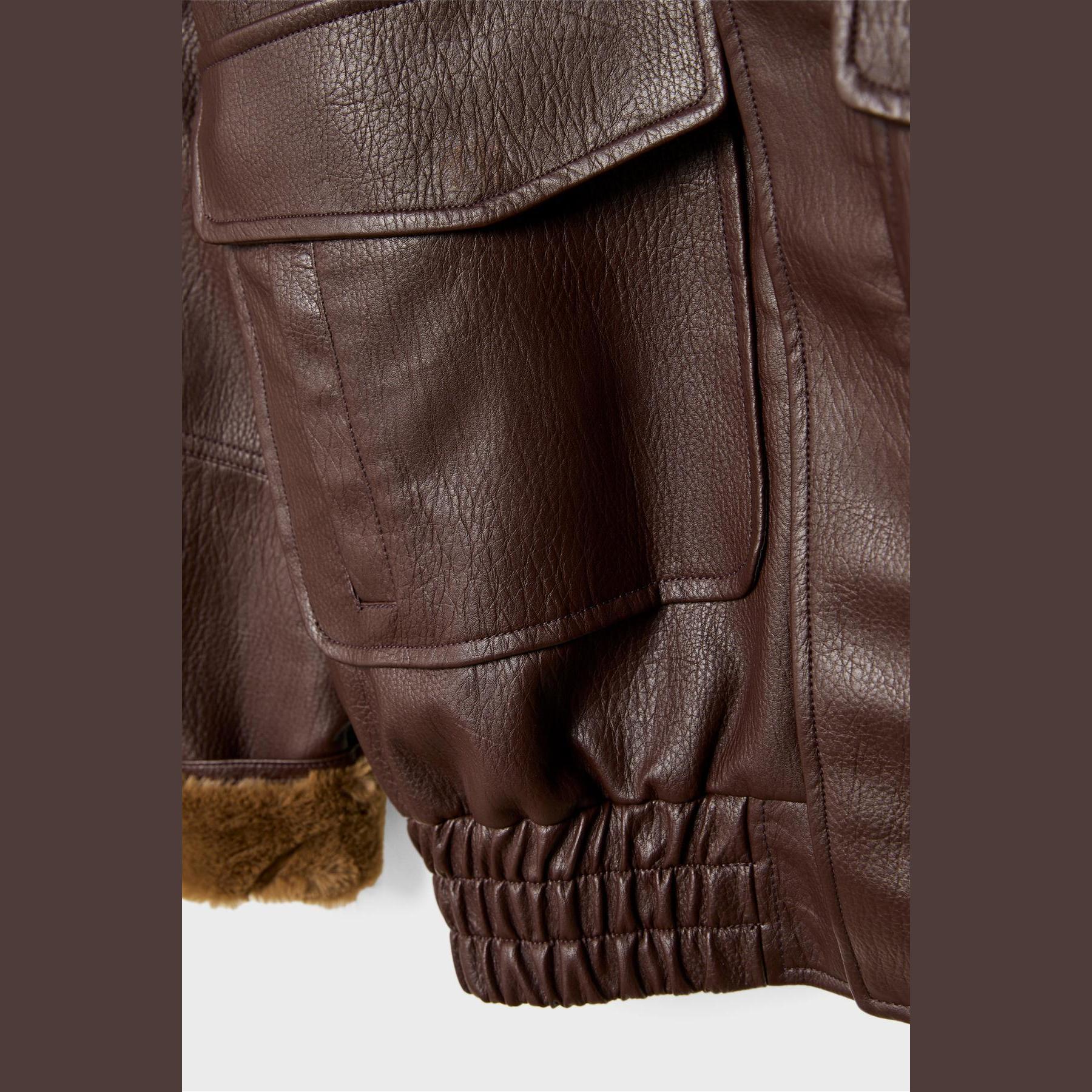جاكيت شتوي أنيق من Stradivarius بلون بني، مصنوع من خامة جلد صناعي بتركيبة 65% بولي يوريثان، 35% بوليستر، يتميز بقصة Regular Fit، ياقة مركبة مزودة بتفصيل فرو صناعي قابل للفصل، أكمام طويلة بكُمّات منحنية، إغلاق أمامي بسحاب معدني مخفي تحت باتليت بكبسات، مزود بجيوب أمامية يامة بغطاء وجيوب جانبية بِييه، تصميم Dokuma بملمس جلد صناعي، حافة سفلية مطاطية، مثالي للتنسيق مع قطع كاجوال لإطلالة شتوية دافئة وعصرية.