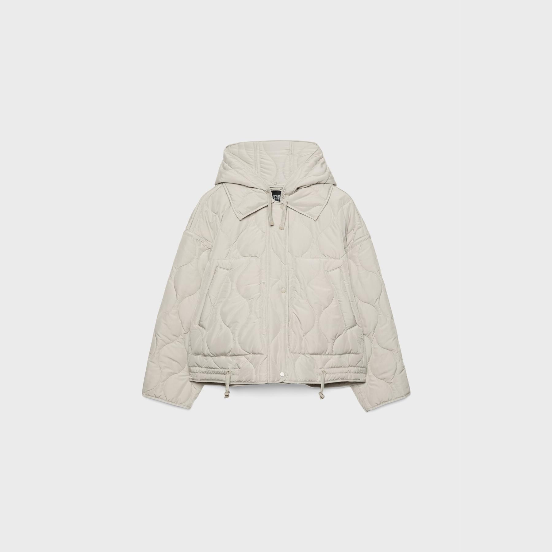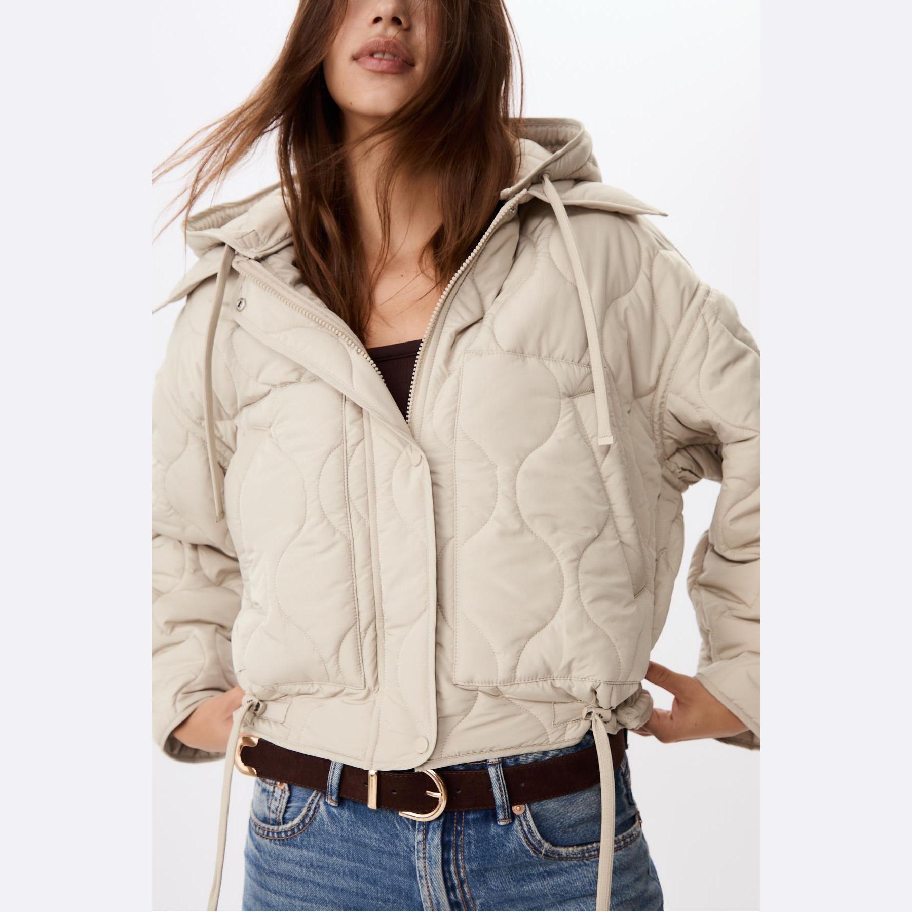 جاكيت شتوي أنيق من Stradivarius بلون أبيض، مصنوع من خامة Dokuma بتركيبة 100% بوليستر، يتميز بقصة Straight Fit، ياقة عالية مع كابيشون قابل للفصل، أكمام طويلة، إغلاق أمامي بسحاب معدني مخفي تحت باتليت بكبسات، مزود بجيوب أمامية بِييه، تصميم مبطن بتقنية Dolum، بدون بطانة إضافية، مزود بحبل داخلي قابل للتعديل عند الخصر، مثالي للتنسيق مع قطع كاجوال لإطلالة شتوية دافئة وعصرية.