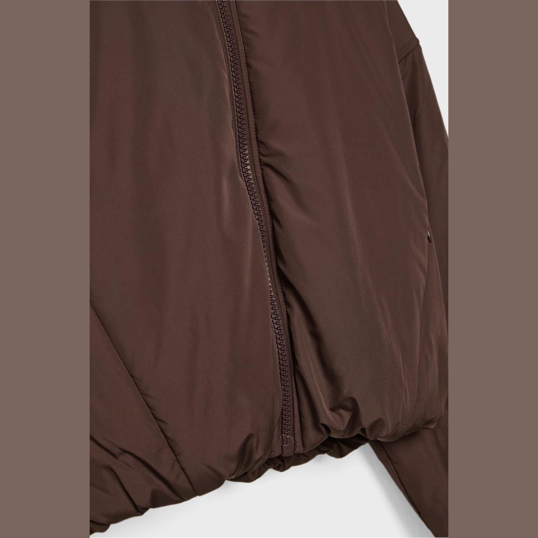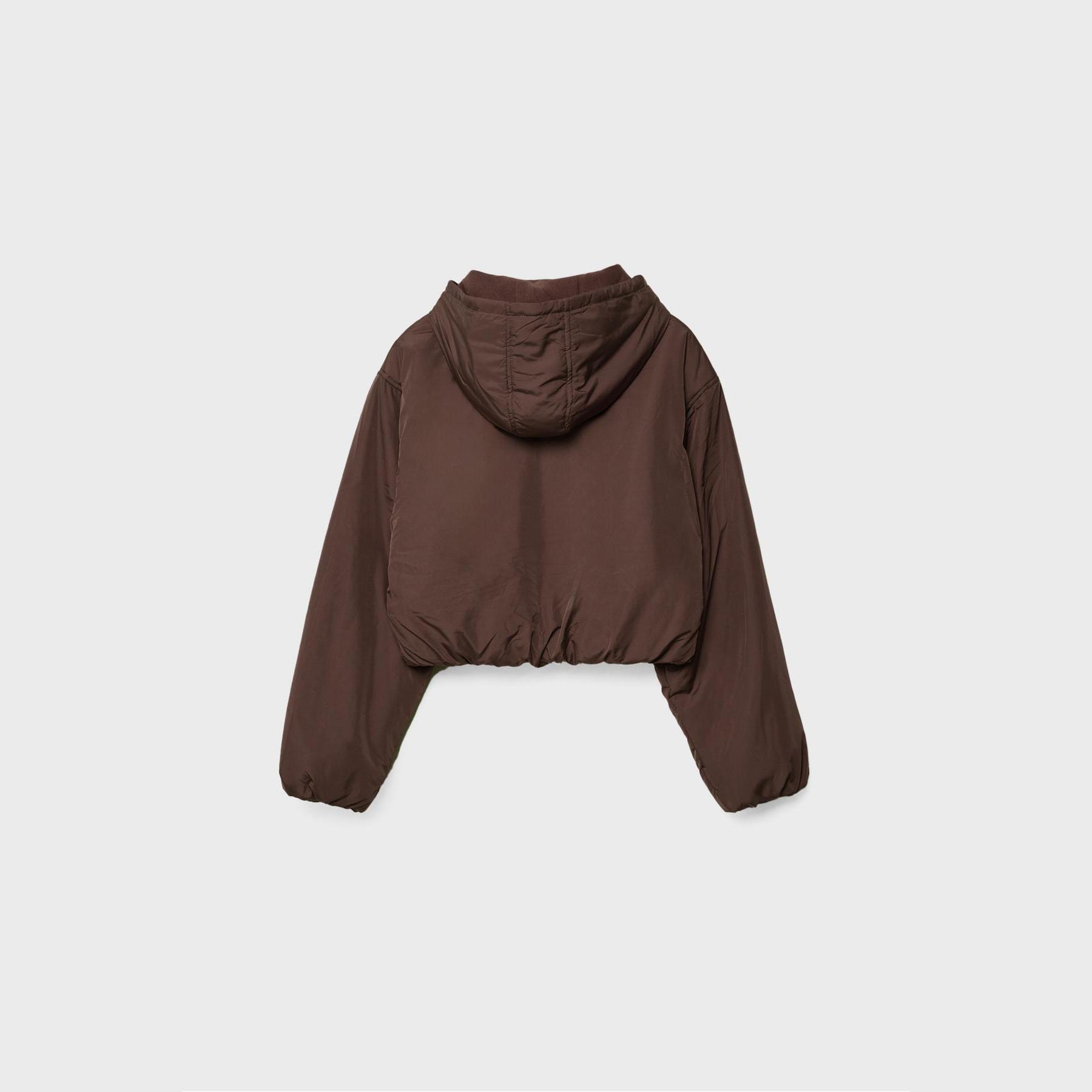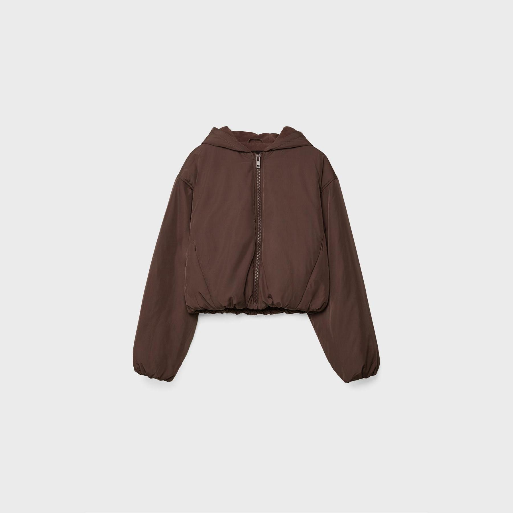جاكيت شتوي أنيق من Stradivarius بلون بني، مصنوع من خامة Dokuma بتركيبة 100% بوليستر، يتميز بقصة Crop Fit قصيرة، ياقة Kapüşonlu مدمجة، أكمام طويلة بكُمّات مطاطية، إغلاق أمامي بسحاب معدني، مزود بجيوب جانبية مخفية، تصميم Kapitone بنقشة مربعات، مبطن بالكامل من الداخل ببطانة ناعمة، حافة سفلية مطاطية، ملمس ناعم بسطح ساتان خفيف، مثالي للتنسيق مع قطع كاجوال لإطلالة شتوية دافئة وعصرية.