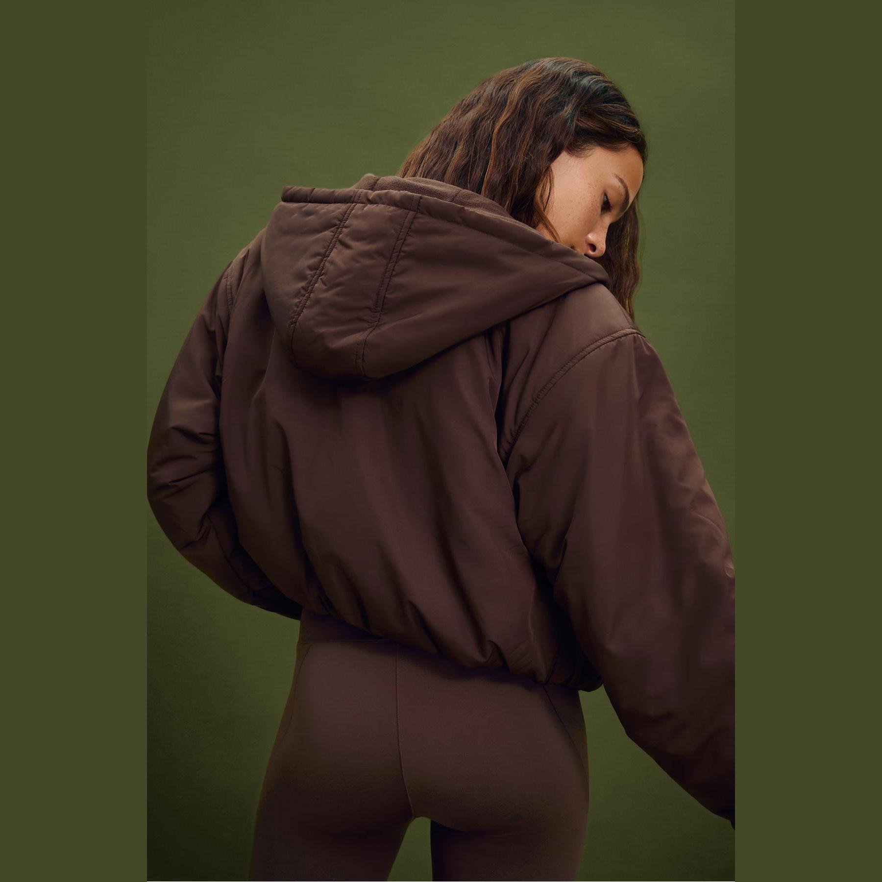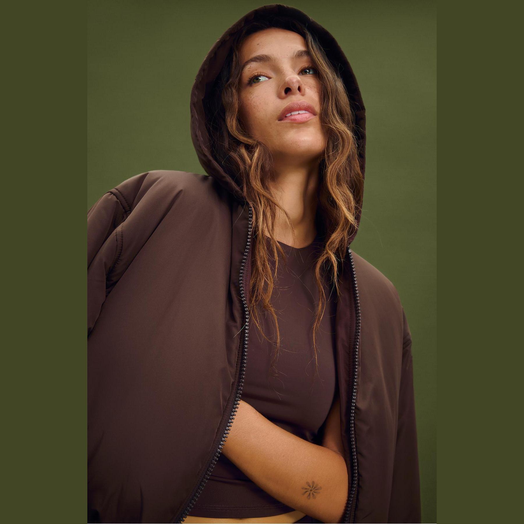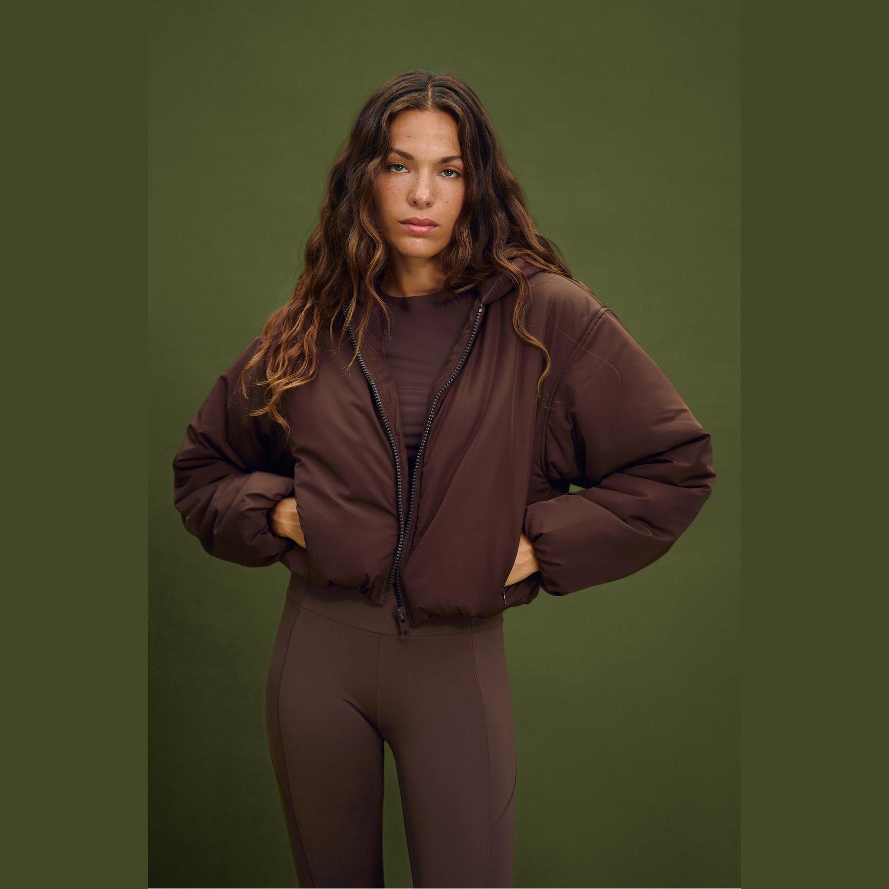 جاكيت شتوي أنيق من Stradivarius بلون بني، مصنوع من خامة Dokuma بتركيبة 100% بوليستر، يتميز بقصة Crop Fit قصيرة، ياقة Kapüşonlu مدمجة، أكمام طويلة بكُمّات مطاطية، إغلاق أمامي بسحاب معدني، مزود بجيوب جانبية مخفية، تصميم Kapitone بنقشة مربعات، مبطن بالكامل من الداخل ببطانة ناعمة، حافة سفلية مطاطية، ملمس ناعم بسطح ساتان خفيف، مثالي للتنسيق مع قطع كاجوال لإطلالة شتوية دافئة وعصرية.