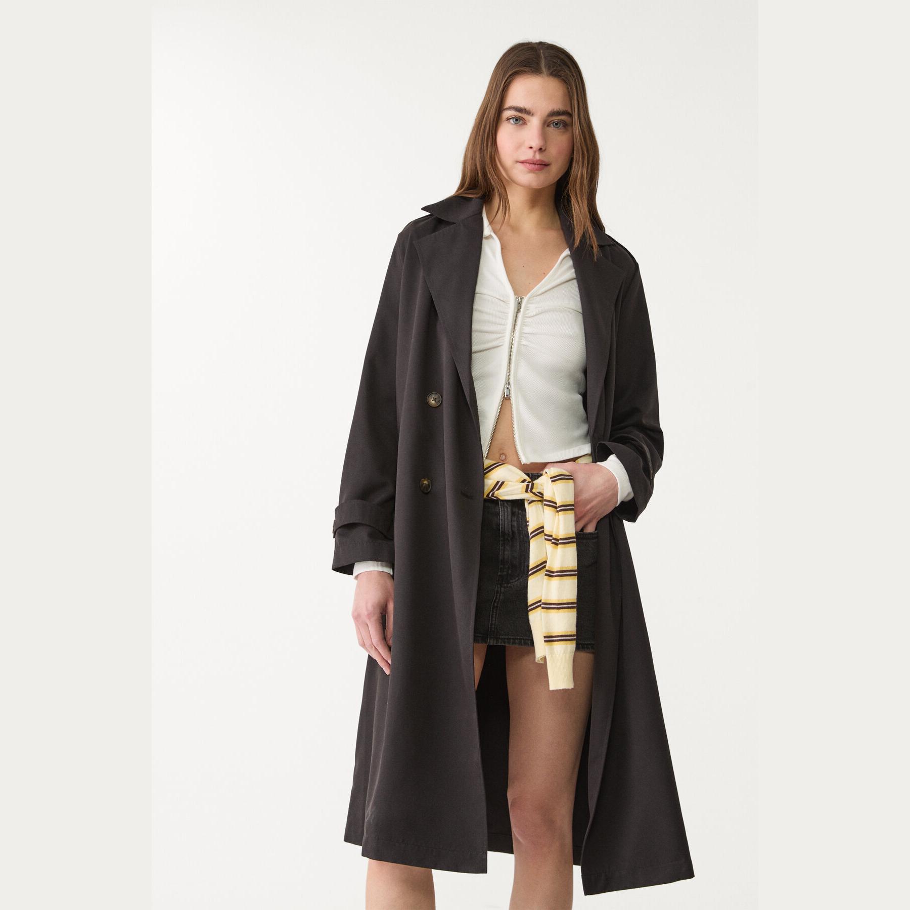ترنش كوت أنيق من Stradivarius بلون أسود، مصنوع من خامة Dokuma بتركيبة 100% بوليستر، يتميز بقصة Regular Fit، ياقة Ceket Yaka مزدوجة بأسلوب Kruvaze، أكمام طويلة بكُمّات قياسية، إغلاق أمامي بأزرار مزدوجة، مزود بحزام خصر بنفس القماش، جيوب جانبية مزدوجة، تصميم سادة بدون بطانة، ملمس ناعم وخفيف، مثالي للتنسيق مع قطع كاجوال أو رسمية لإطلالة انتقالية أنيقة وعملية.