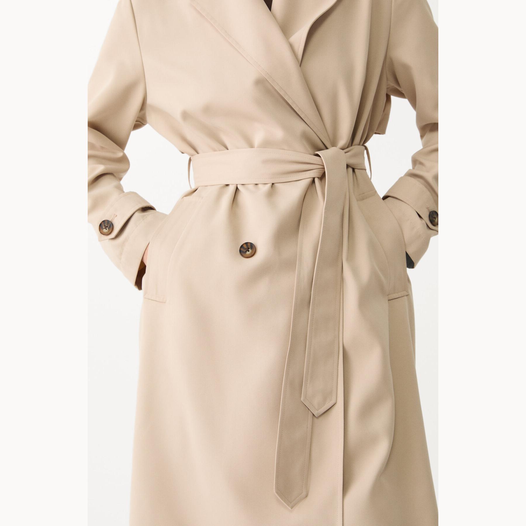 ترنش كوت أنيق من Stradivarius بلون كريمي، مصنوع من خامة Dokuma بتركيبة 100% بوليستر، يتميز بقصة Regular Fit، ياقة Ceket Yaka مزدوجة بأسلوب Kruvaze، أكمام طويلة بكُمّات قياسية، إغلاق أمامي بأزرار مزدوجة، مزود بحزام خصر بنفس القماش، جيوب جانبية مزدوجة، تصميم سادة بدون بطانة، ملمس ناعم وخفيف، مثالي للتنسيق مع قطع كاجوال أو رسمية لإطلالة انتقالية أنيقة وعملية.