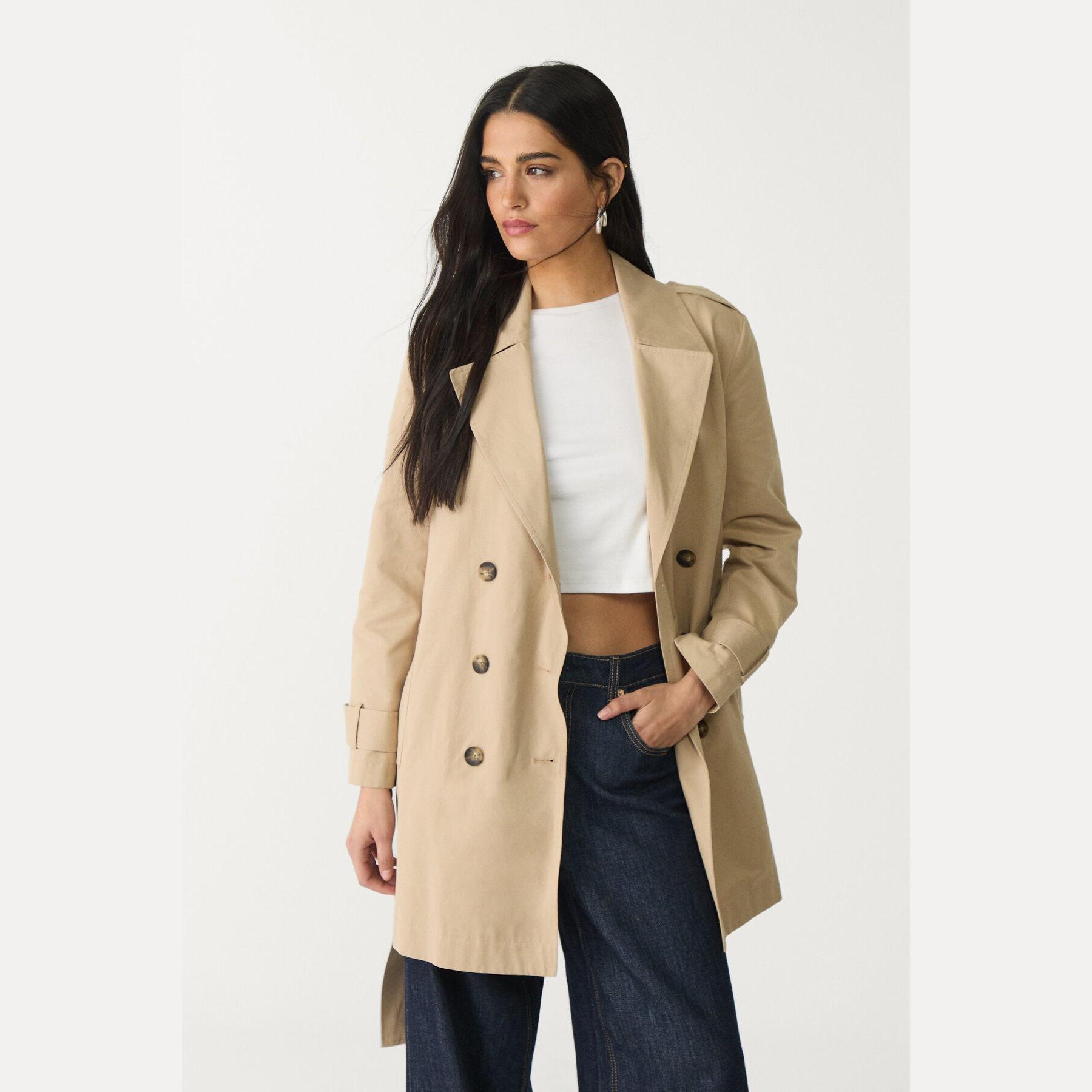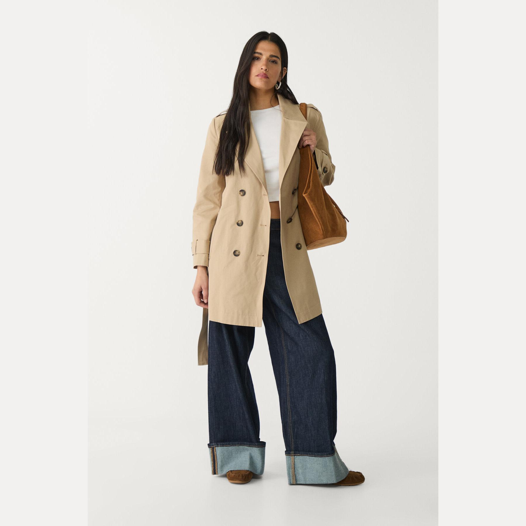 ترنش كوت أنيق من Stradivarius بلون كريمي، مصنوع من خامة Dokuma بتركيبة 55% قطن، 35% بوليستر، 10% بولياميد، يتميز بقصة Regular Fit، ياقة Kruvaze مزدوجة، أكمام طويلة بكُمّات مزودة بأزرار، إغلاق أمامي بأزرار مزدوجة، مزود بحزام خصر بنفس القماش، جيوب أمامية بِييه مع تفاصيل Biyeli، تصميم سادة بدون بطانة، ملمس ناعم وخفيف، مثالي للتنسيق مع قطع كاجوال أو رسمية لإطلالة خريفية أو ربيعية أنيقة وعملية.