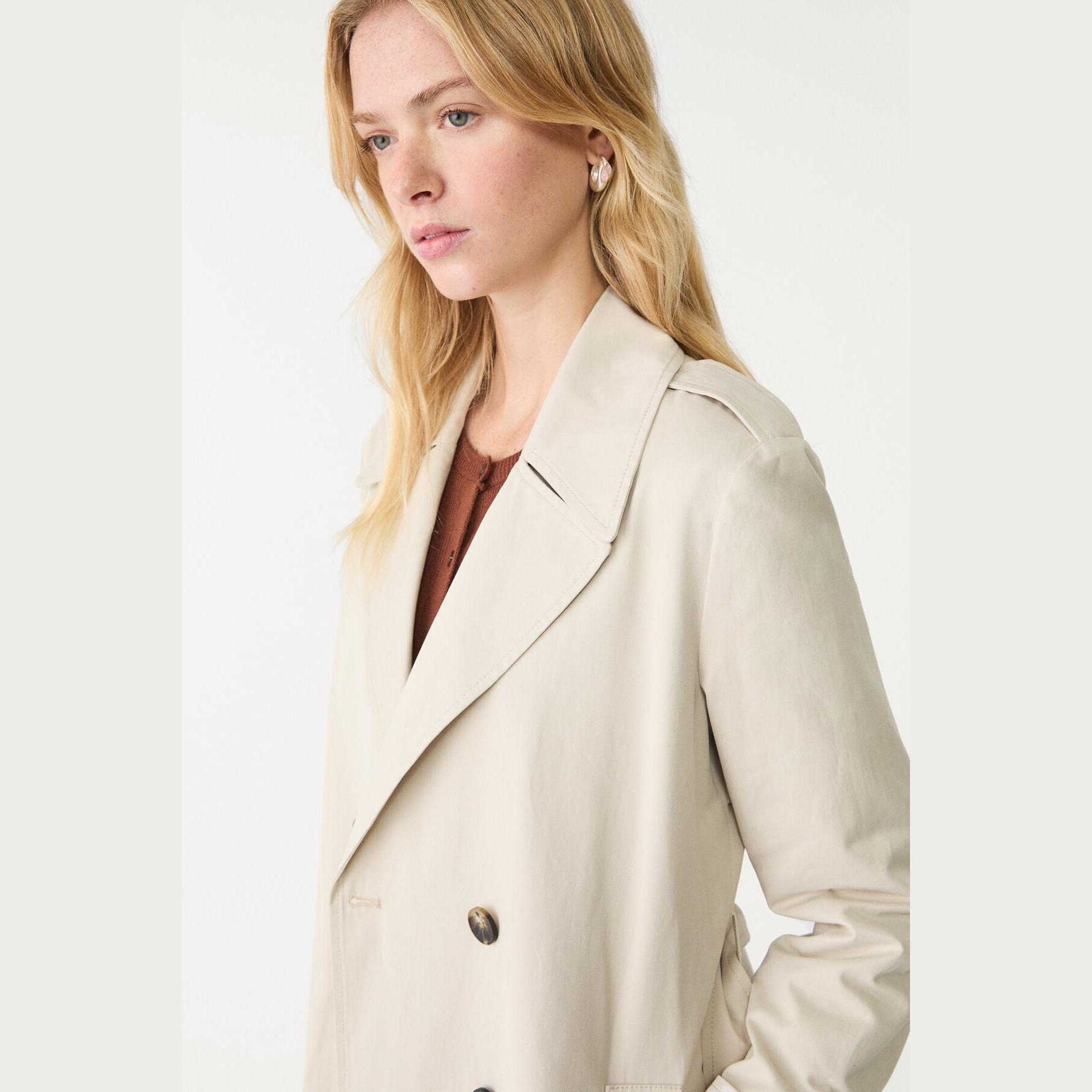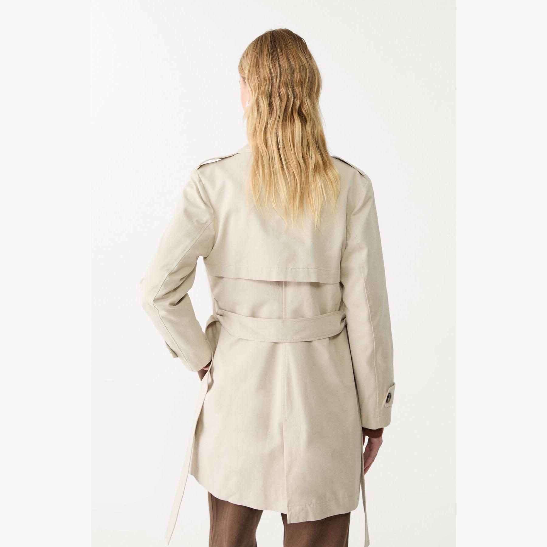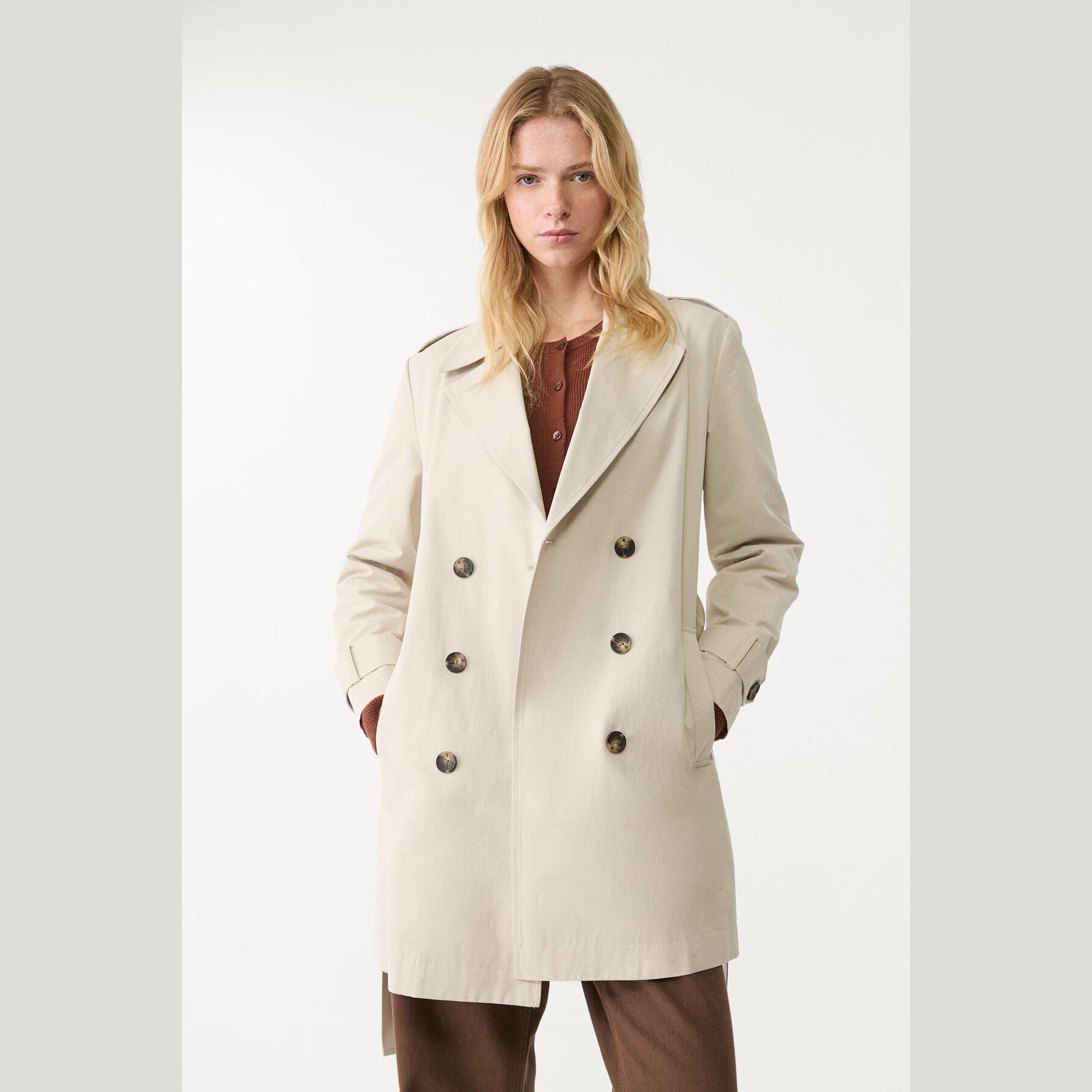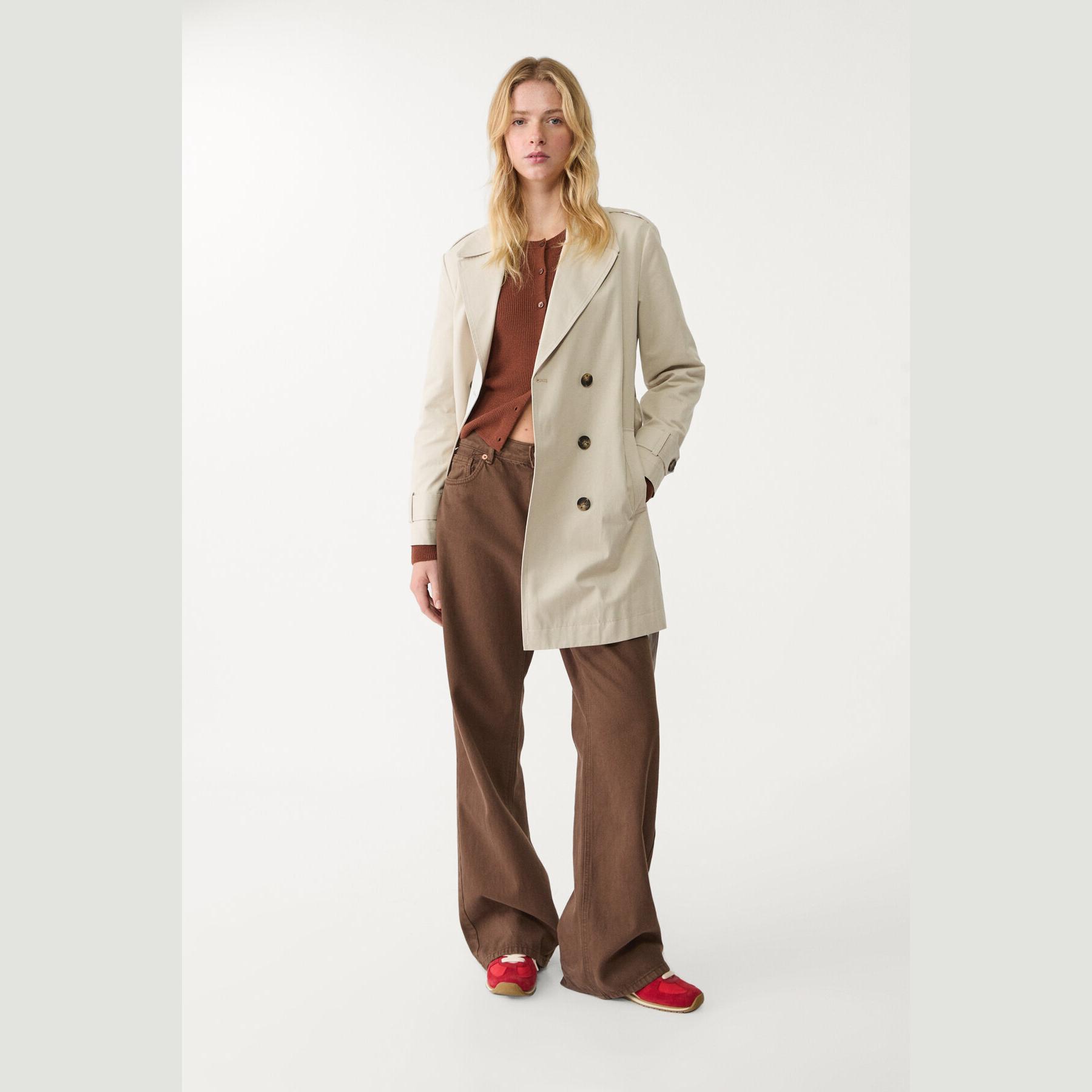 ترنش كوت أنيق من Stradivarius بلون إكرو، مصنوع من خامة Dokuma بتركيبة 55% قطن، 35% بوليستر، 10% بولياميد، يتميز بقصة Regular Fit، ياقة Kruvaze مزدوجة، أكمام طويلة بكُمّات مزودة بأزرار، إغلاق أمامي بأزرار مزدوجة، مزود بحزام خصر بنفس القماش، جيوب أمامية بِييه مع تفاصيل Biyeli، تصميم سادة بدون بطانة، ملمس ناعم وخفيف، مثالي للتنسيق مع قطع كاجوال أو رسمية لإطلالة خريفية أو ربيعية أنيقة وعملية.