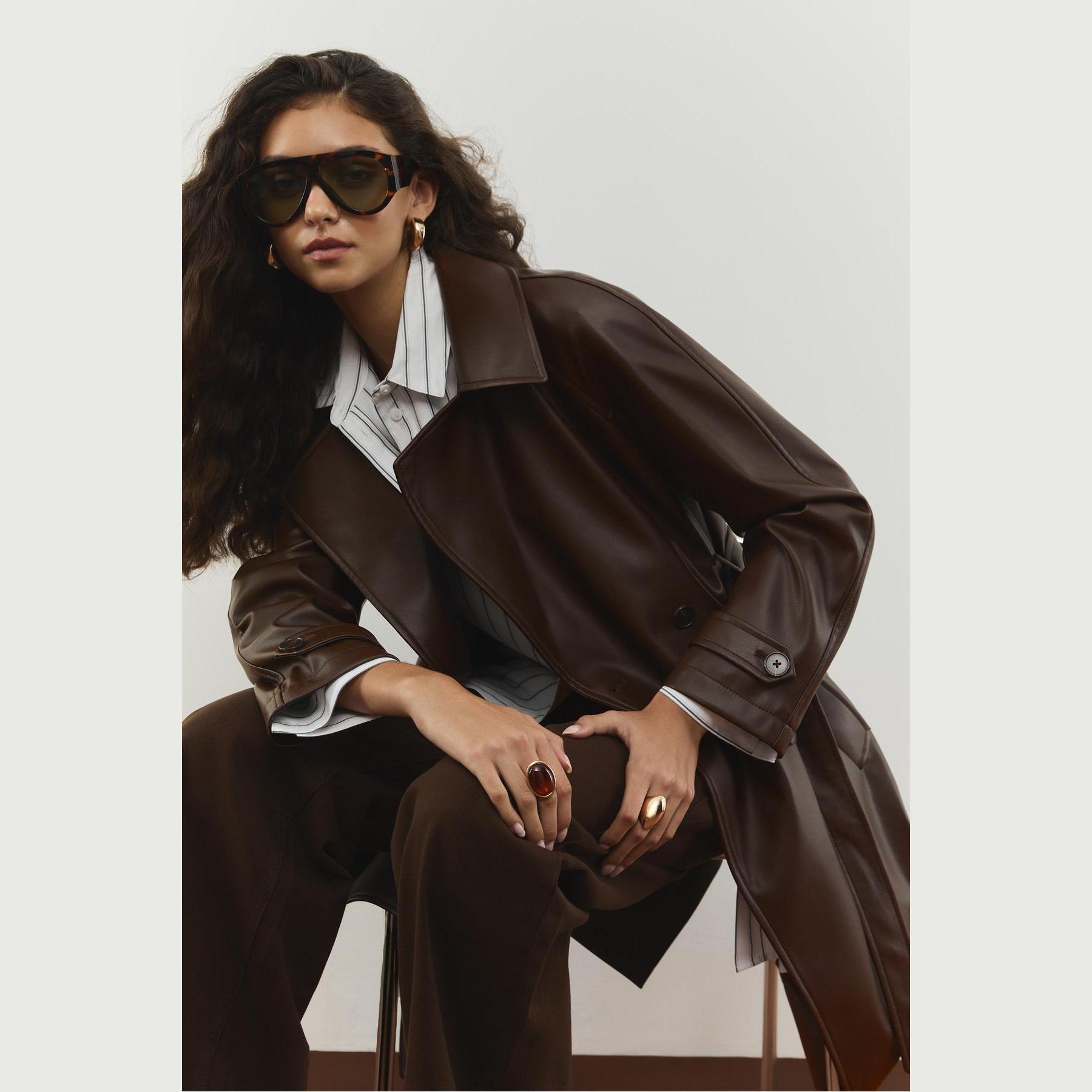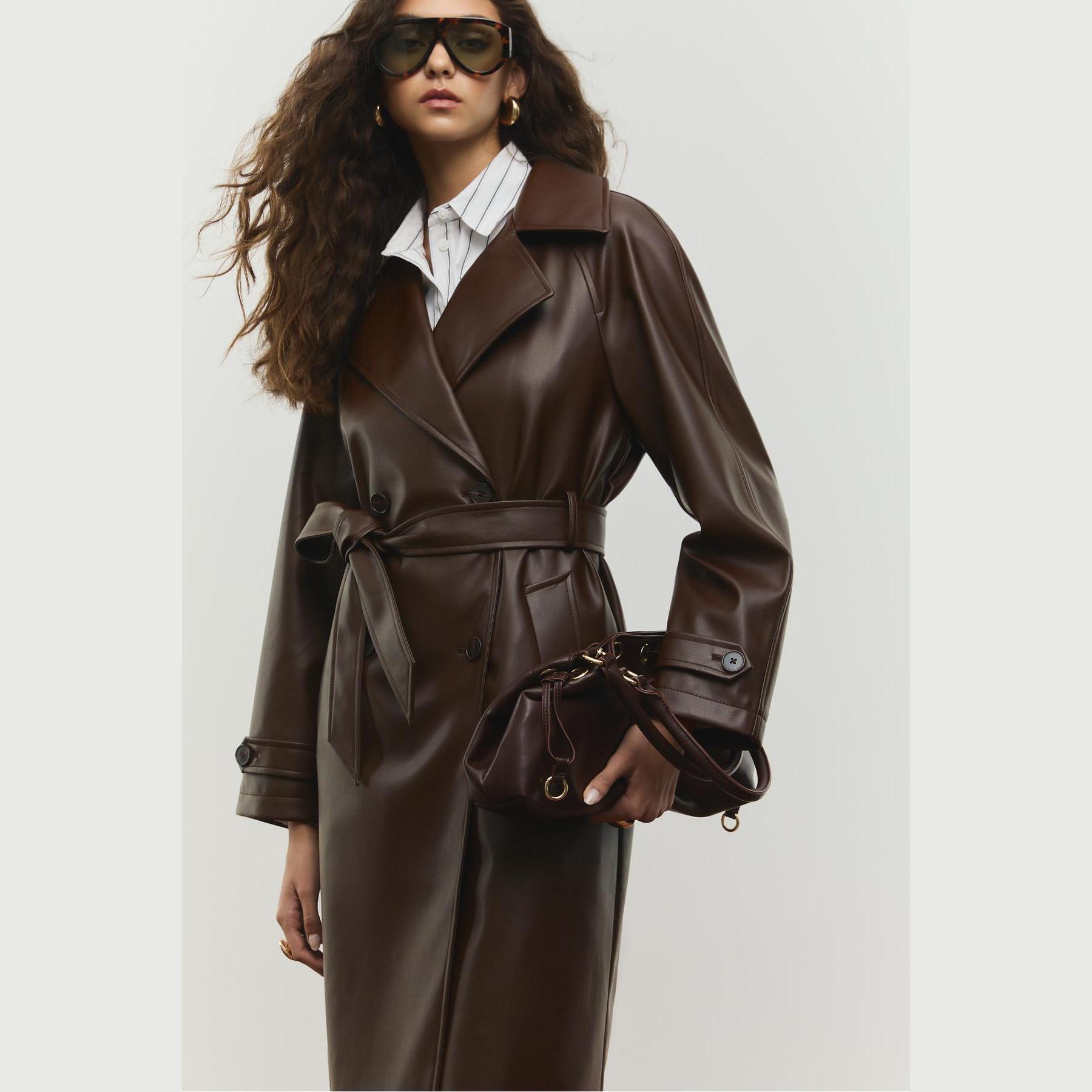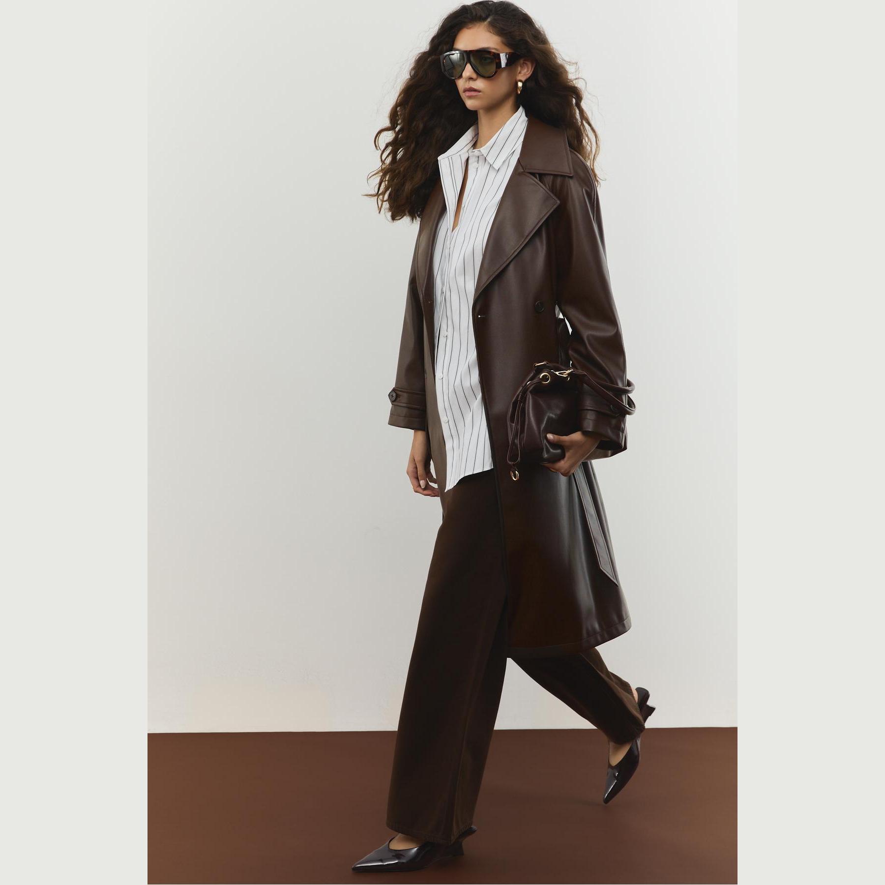 ترنش كوت أنيق من Stradivarius بلون بني، مصنوع من خامة Dokuma بتركيبة 65% بولي يوريثان و35% بوليستر، يتميز بقصة Straight Fit، ياقة Kruvaze مزدوجة، أكمام طويلة بكُمّات قياسية، إغلاق أمامي بأزرار مزدوجة، مزود بحزام خصر بنفس القماش قابل للإزالة، جيوب جانبية بِييه، تصميم سادة مبطن بالكامل، ملمس ناعم يشبه الجلد الطبيعي، مثالي للتنسيق مع قطع كاجوال أو رسمية لإطلالة انتقالية أنيقة وعملية.