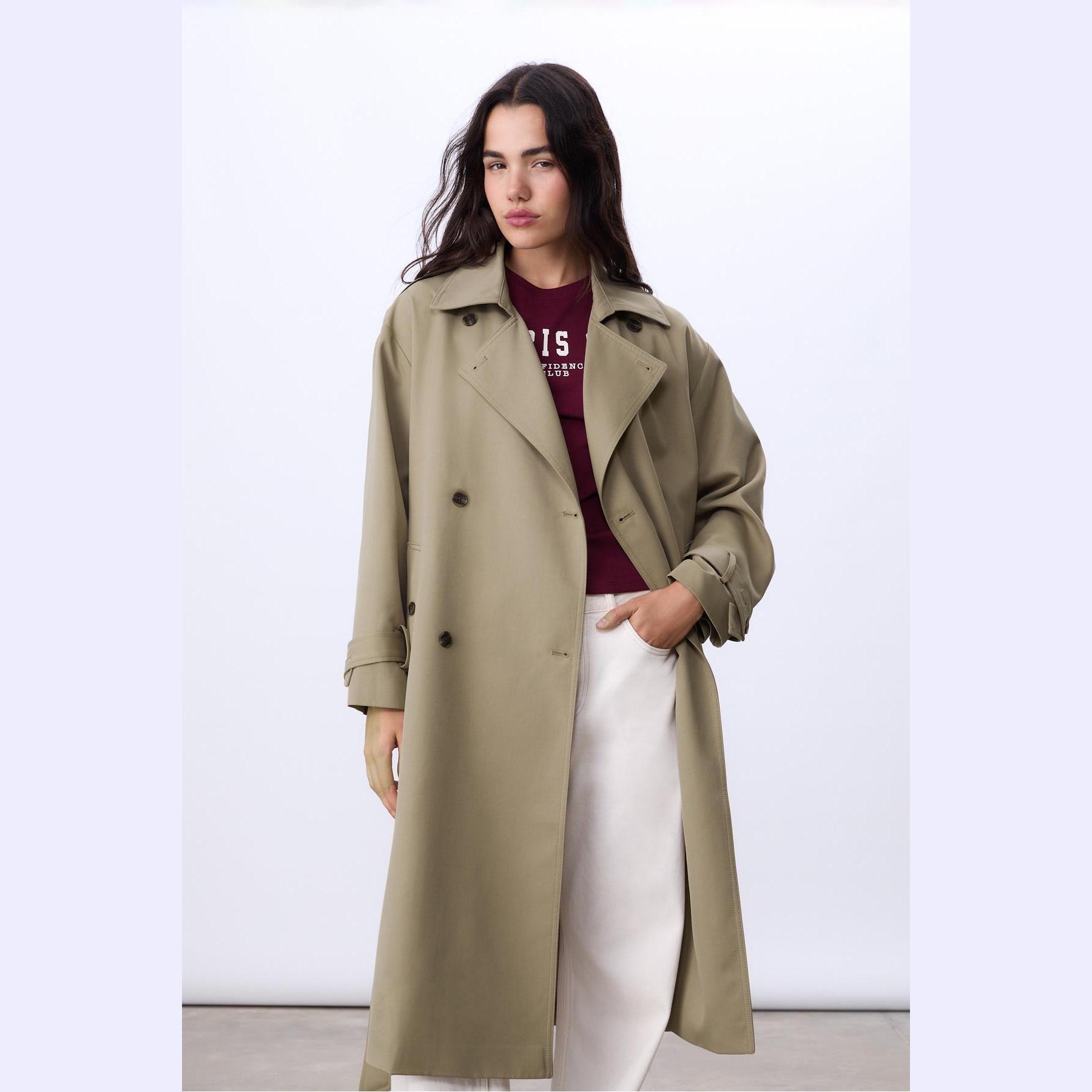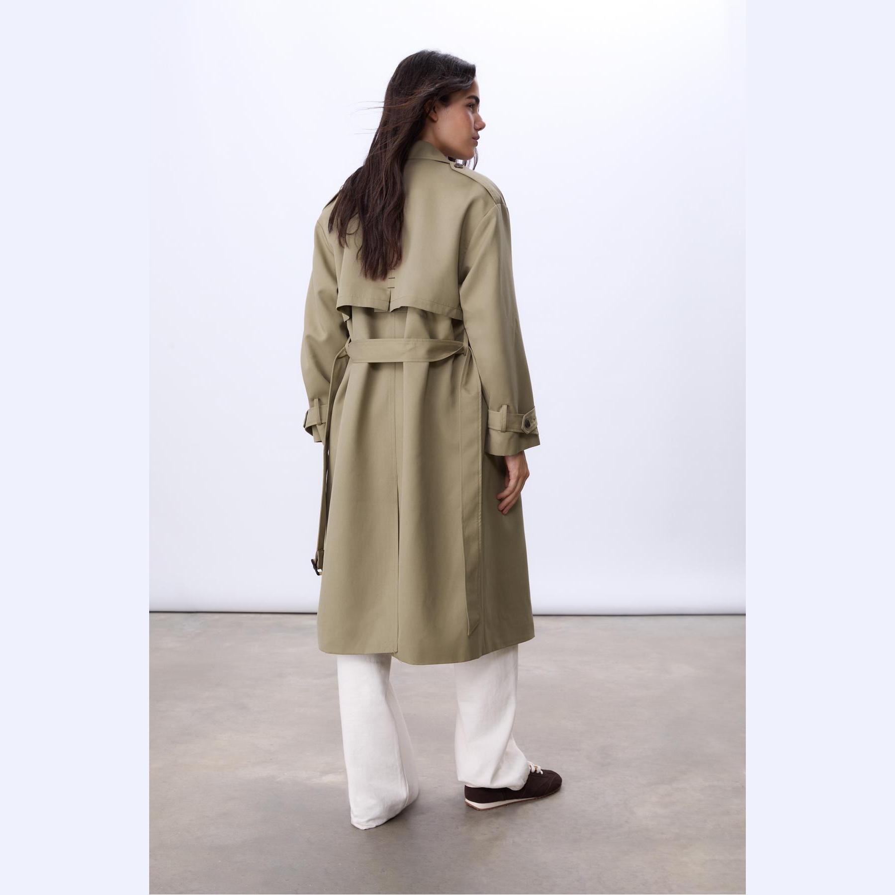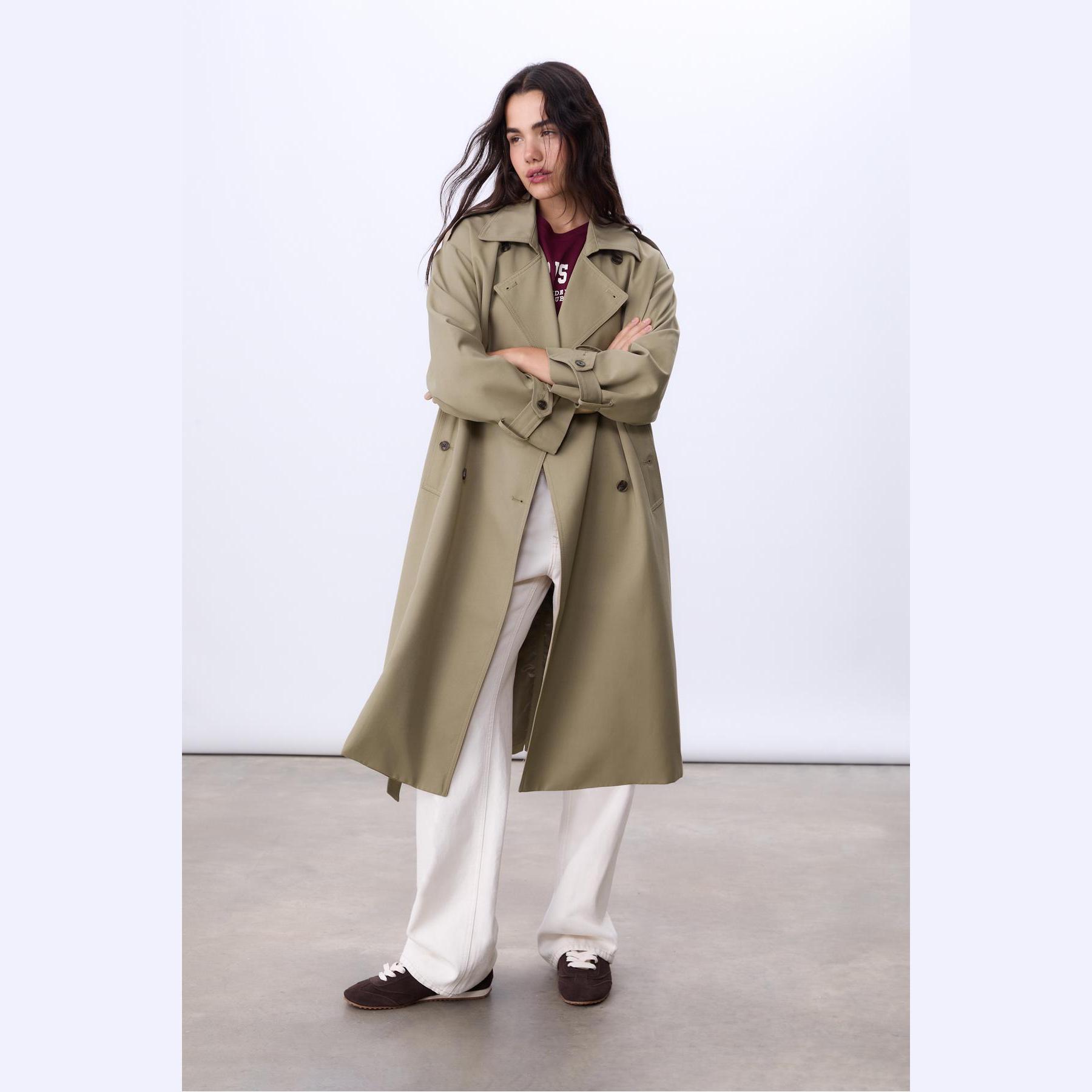 ترنش كوت طويل بقصة مستقيمة وحزام خصر – زيتي من Stradivarius