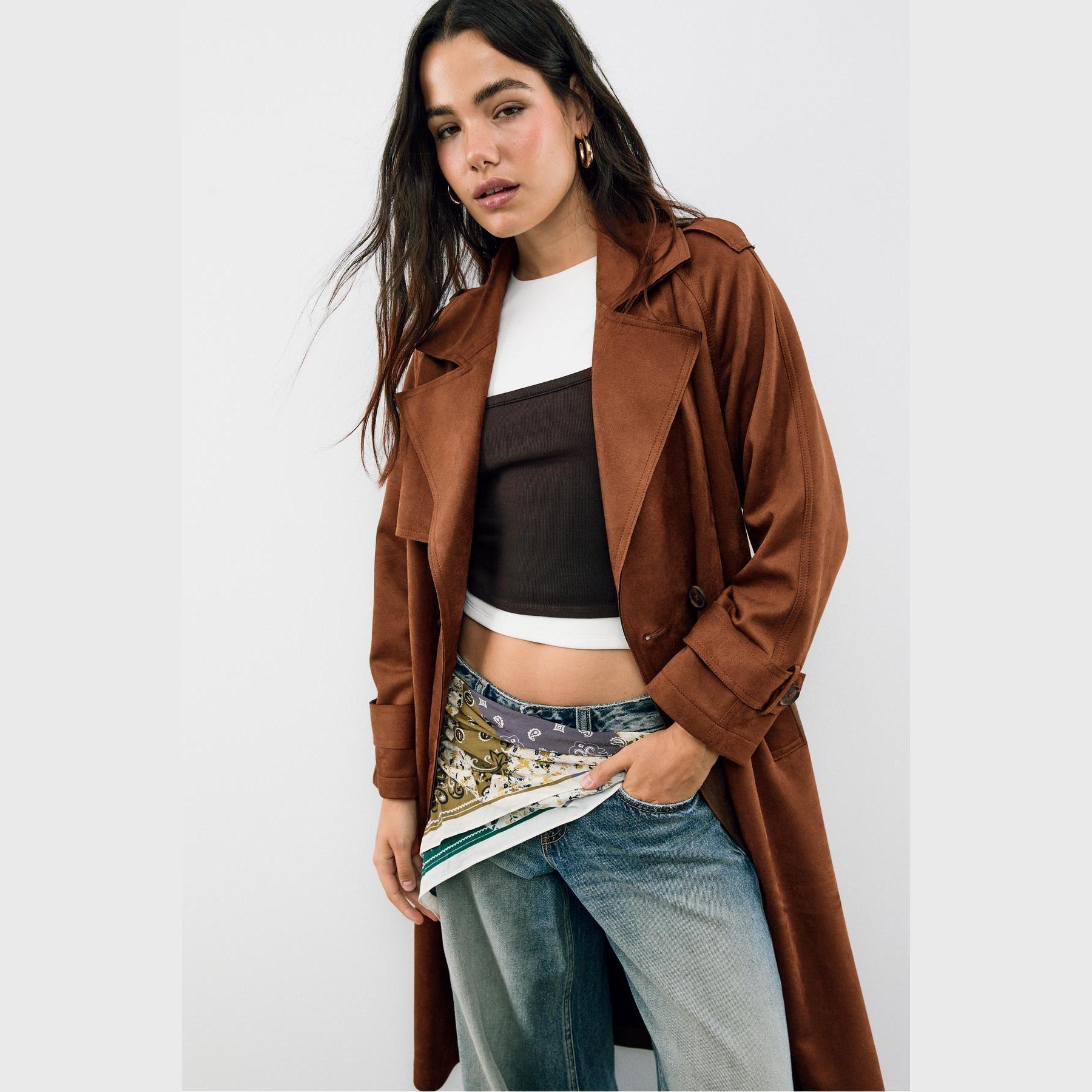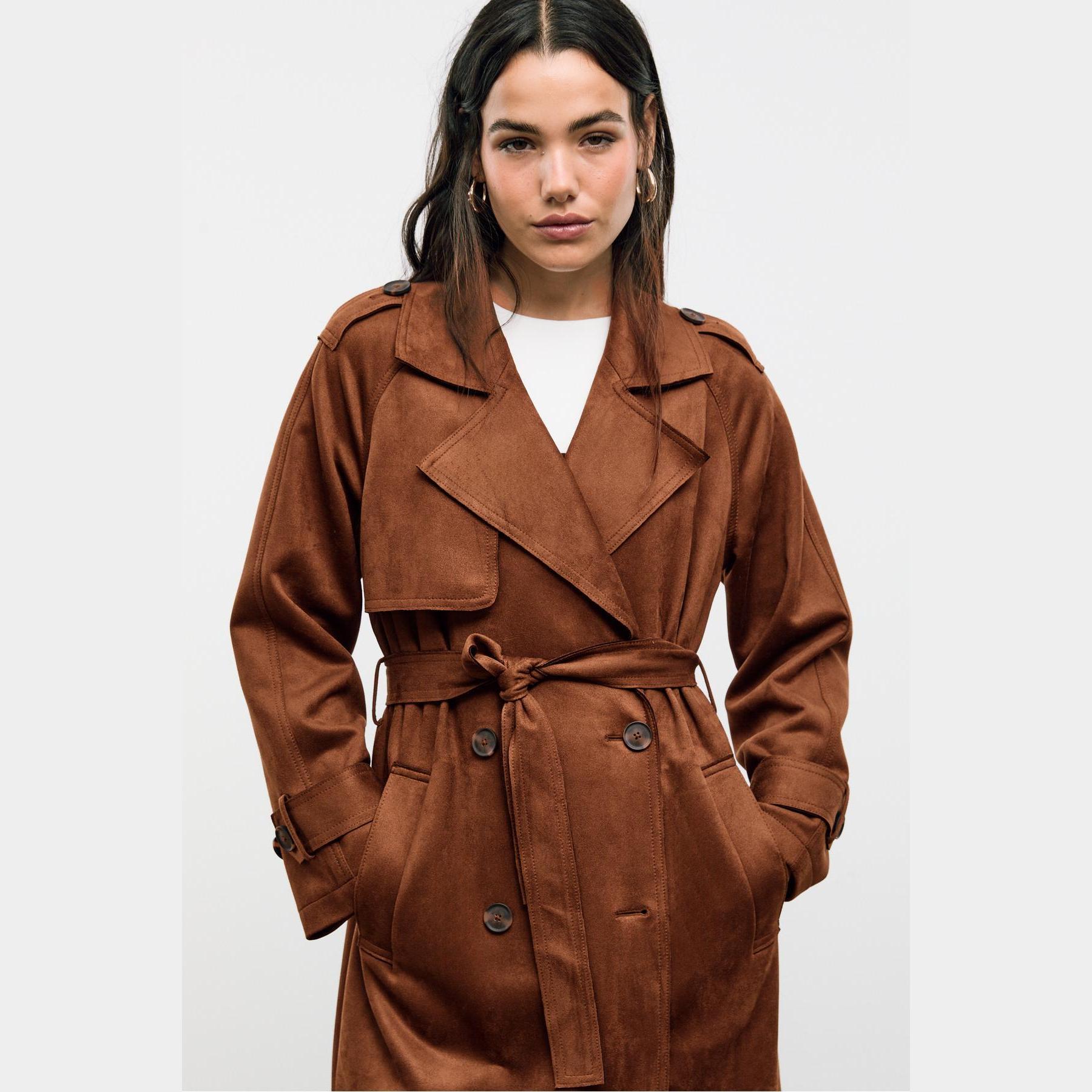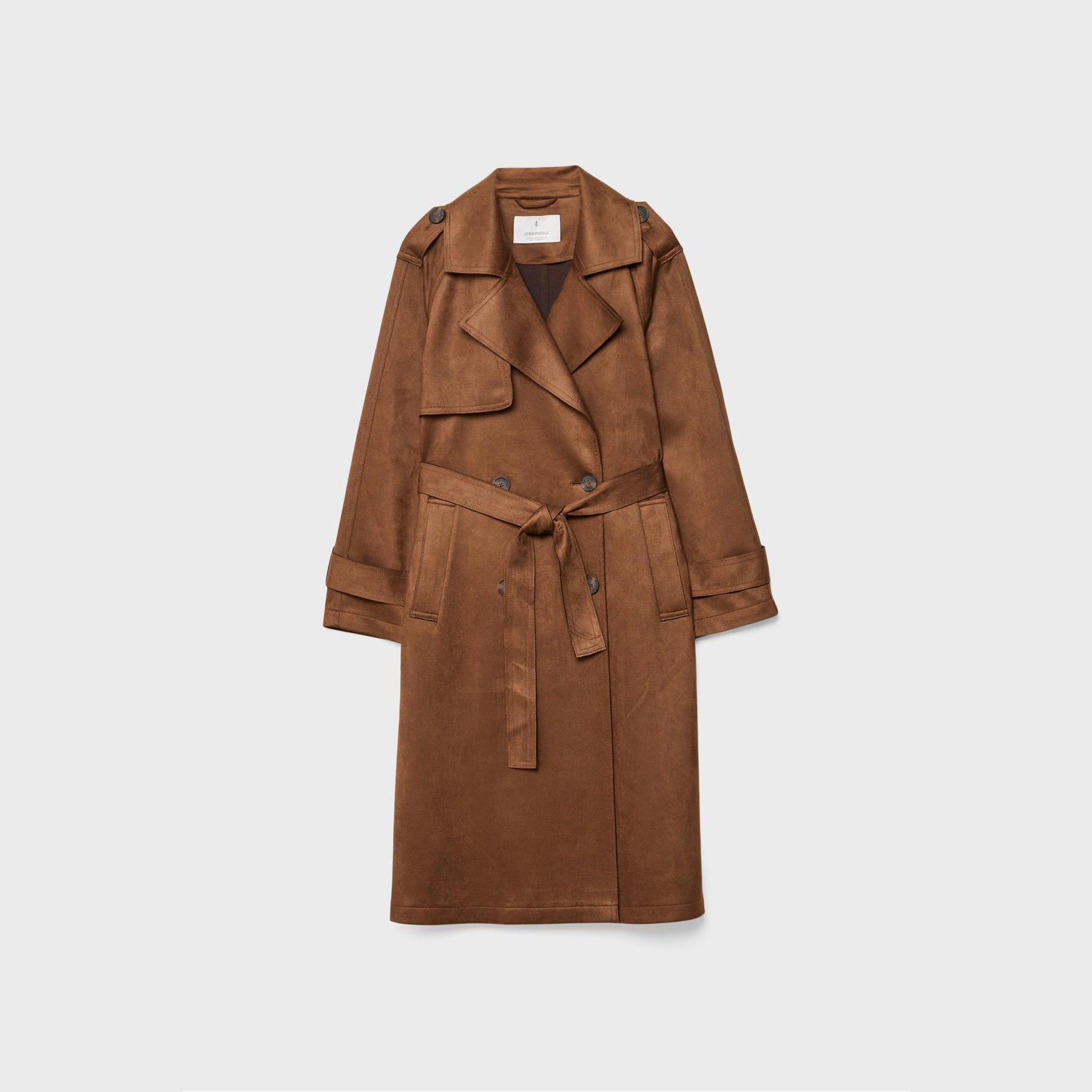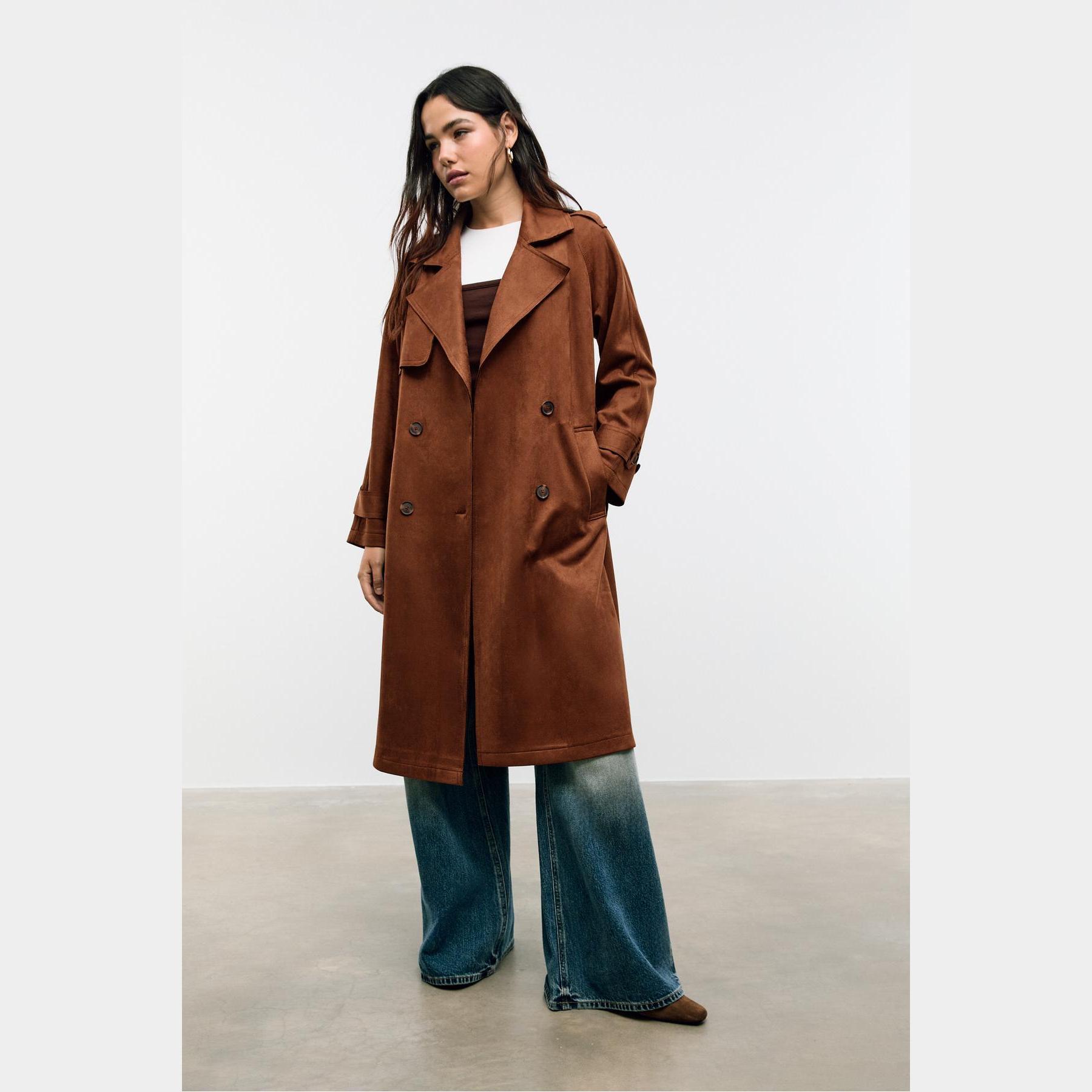 ترنش كوت أنيق من Stradivarius بلون بني، مصنوع من خامة Dokuma بتركيبة 92% بوليستر و8% إيلاستان، يتميز بقصة Straight Fit، ياقة Kruvaze مزدوجة، أكمام طويلة بكُمّات مزودة بأزرار، إغلاق أمامي بأزرار مزدوجة، مزود بحزام خصر بنفس القماش قابل للإزالة، جيوب أمامية بِييه، تصميم سادة بدون بطانة، ملمس ناعم يشبه الجلد السويدي، مثالي للتنسيق مع قطع كاجوال أو رسمية لإطلالة انتقالية أنيقة وعملية.