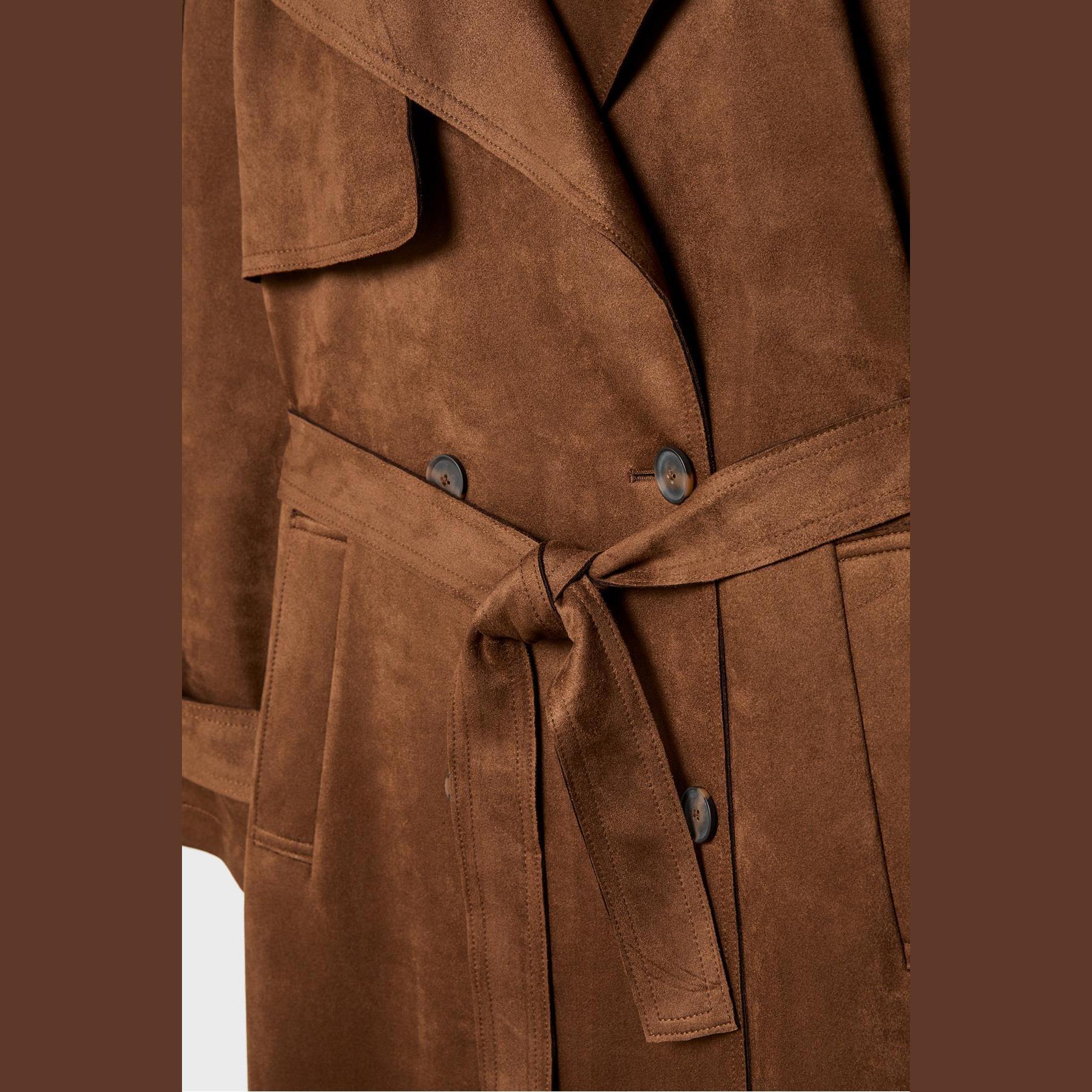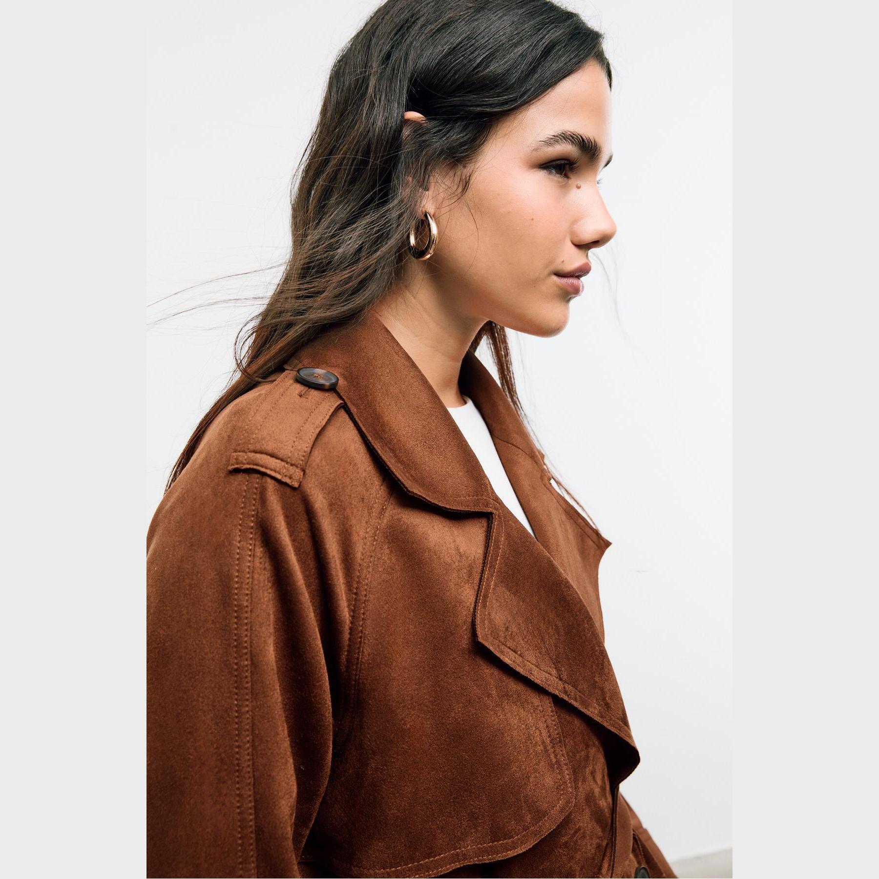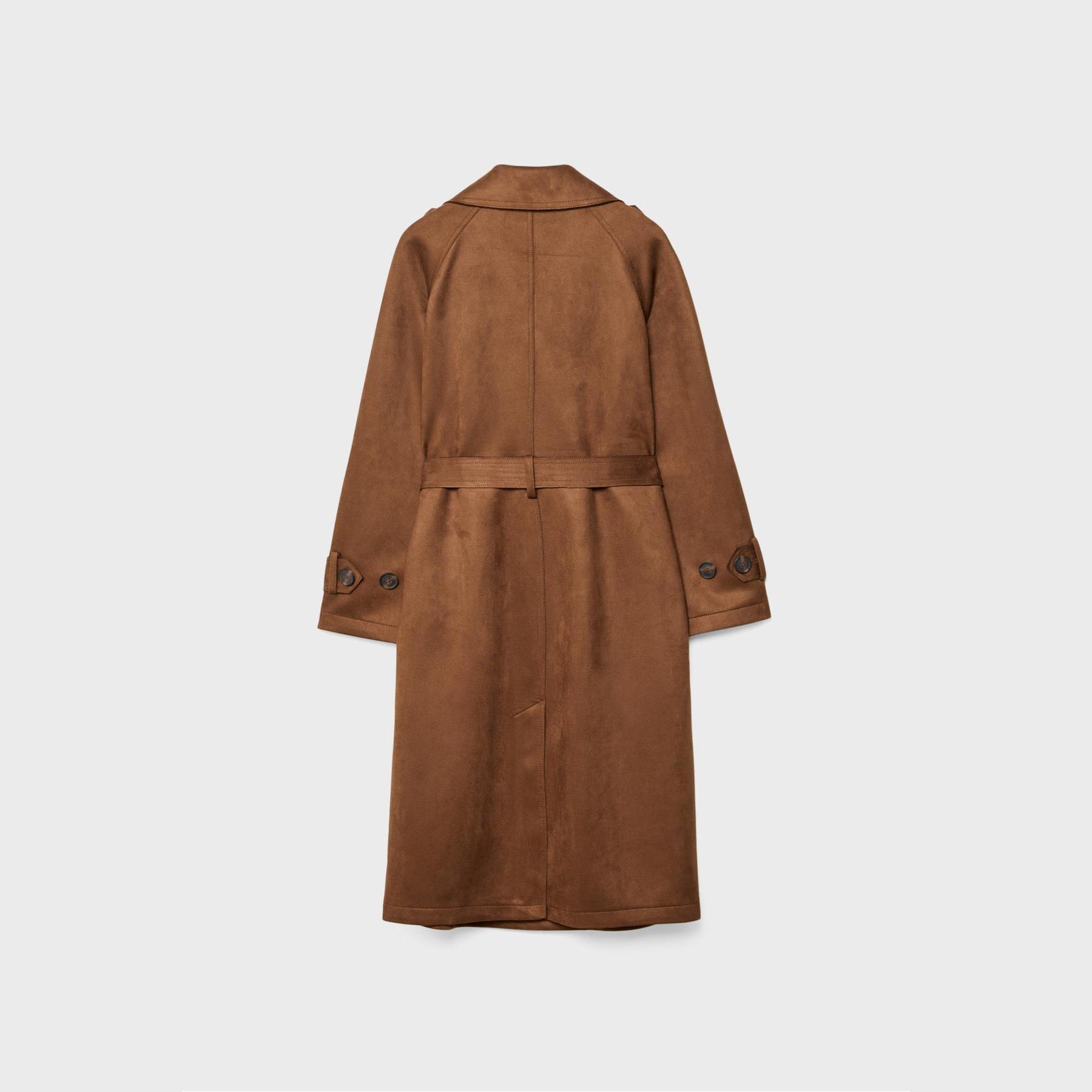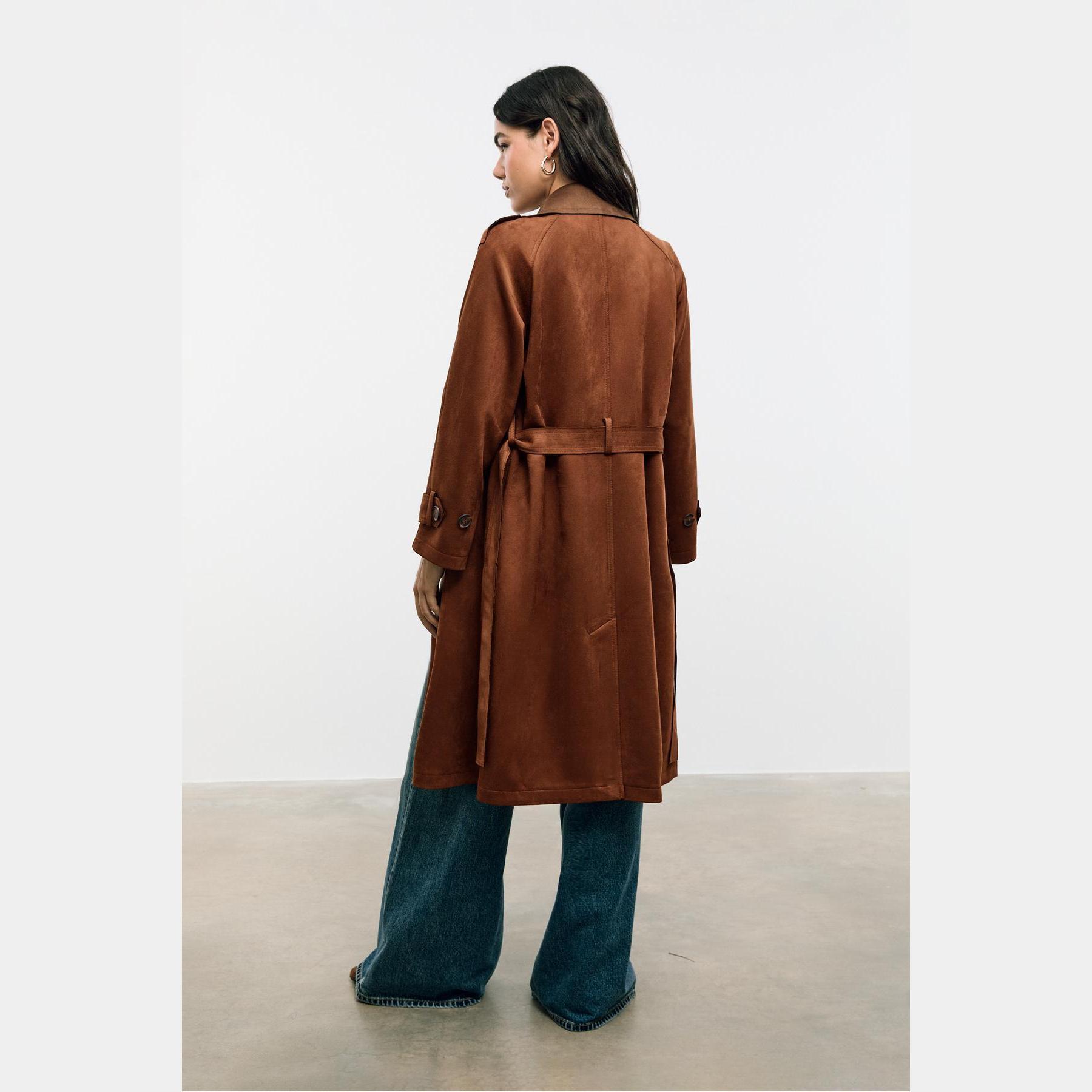 ترنش كوت أنيق من Stradivarius بلون بني، مصنوع من خامة Dokuma بتركيبة 92% بوليستر و8% إيلاستان، يتميز بقصة Straight Fit، ياقة Kruvaze مزدوجة، أكمام طويلة بكُمّات مزودة بأزرار، إغلاق أمامي بأزرار مزدوجة، مزود بحزام خصر بنفس القماش قابل للإزالة، جيوب أمامية بِييه، تصميم سادة بدون بطانة، ملمس ناعم يشبه الجلد السويدي، مثالي للتنسيق مع قطع كاجوال أو رسمية لإطلالة انتقالية أنيقة وعملية.
