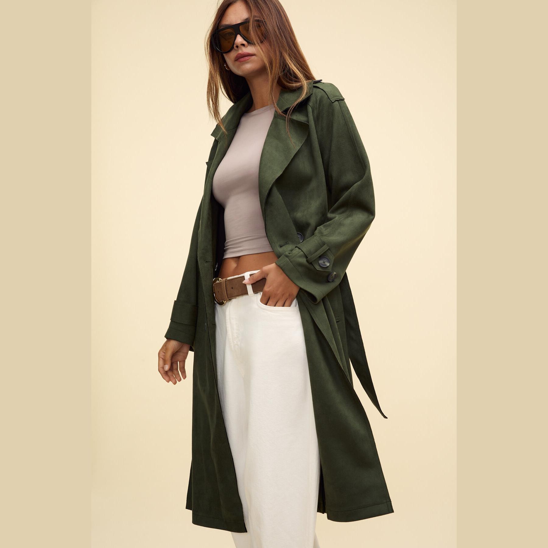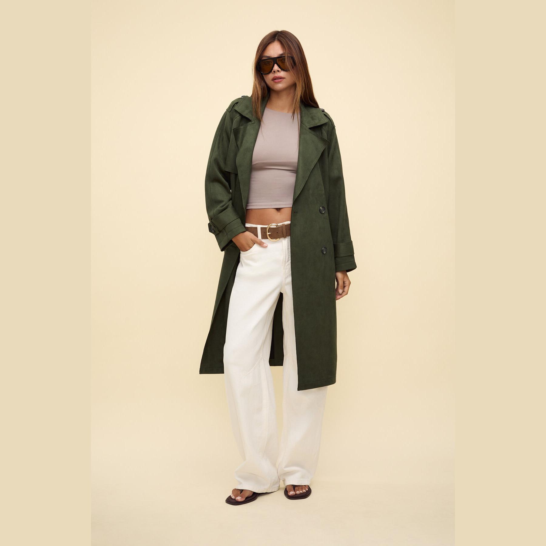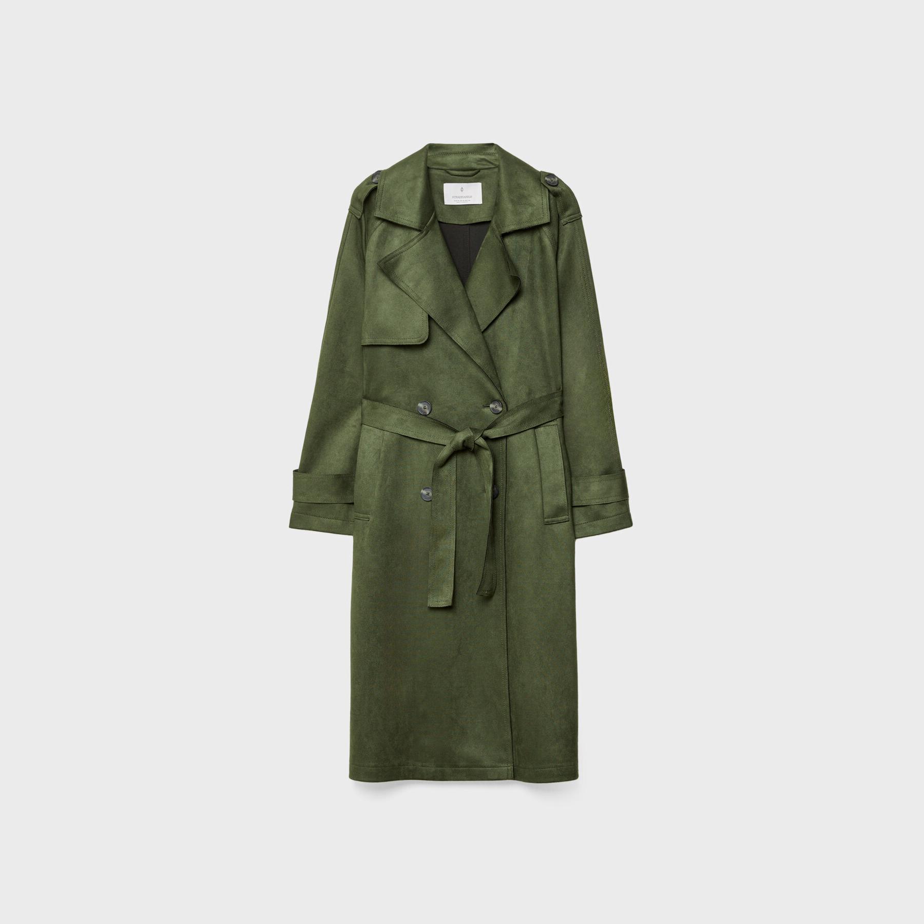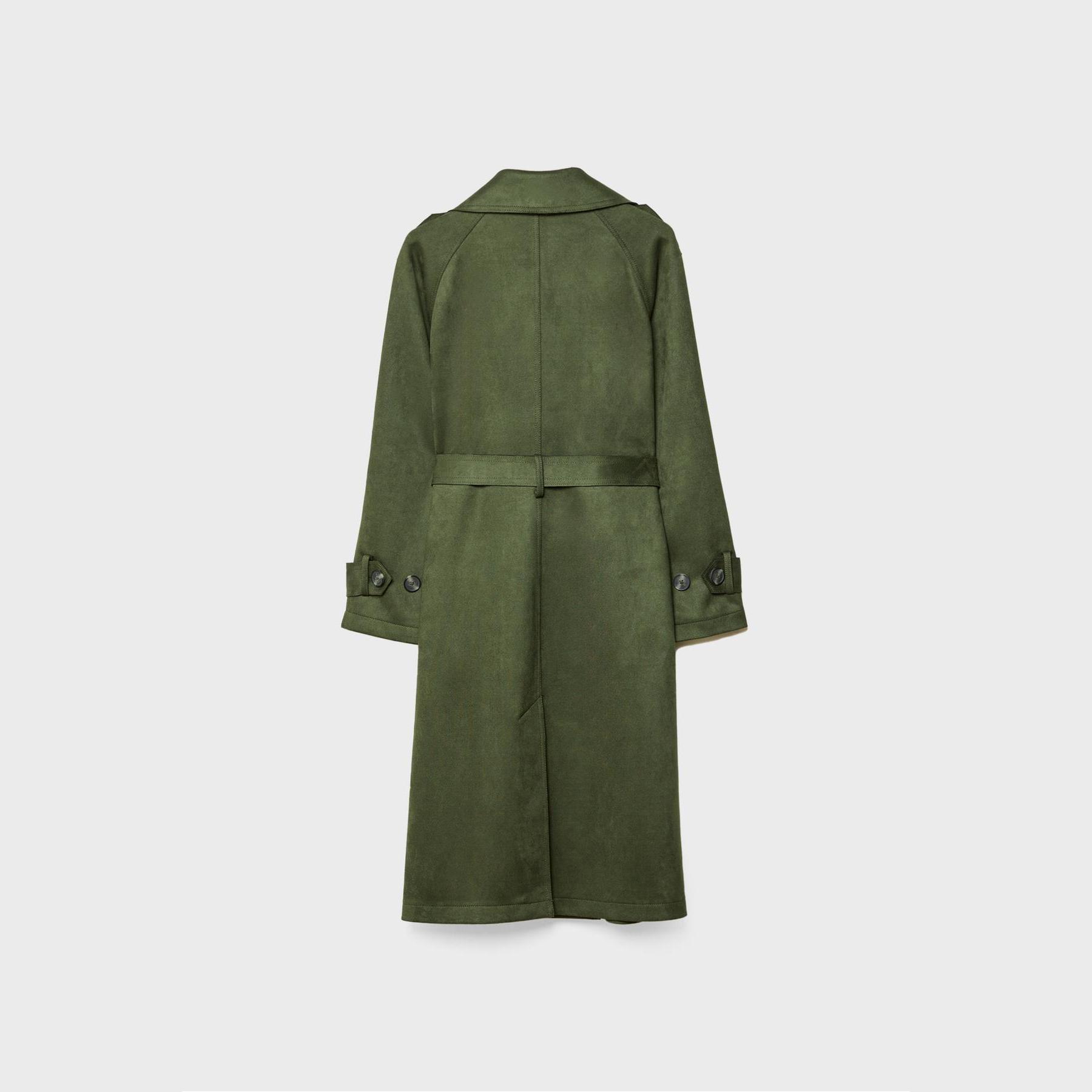 ترنش كوت طويل بملمس الجلد السويدي الصناعي – زيتي داكن من Stradivarius