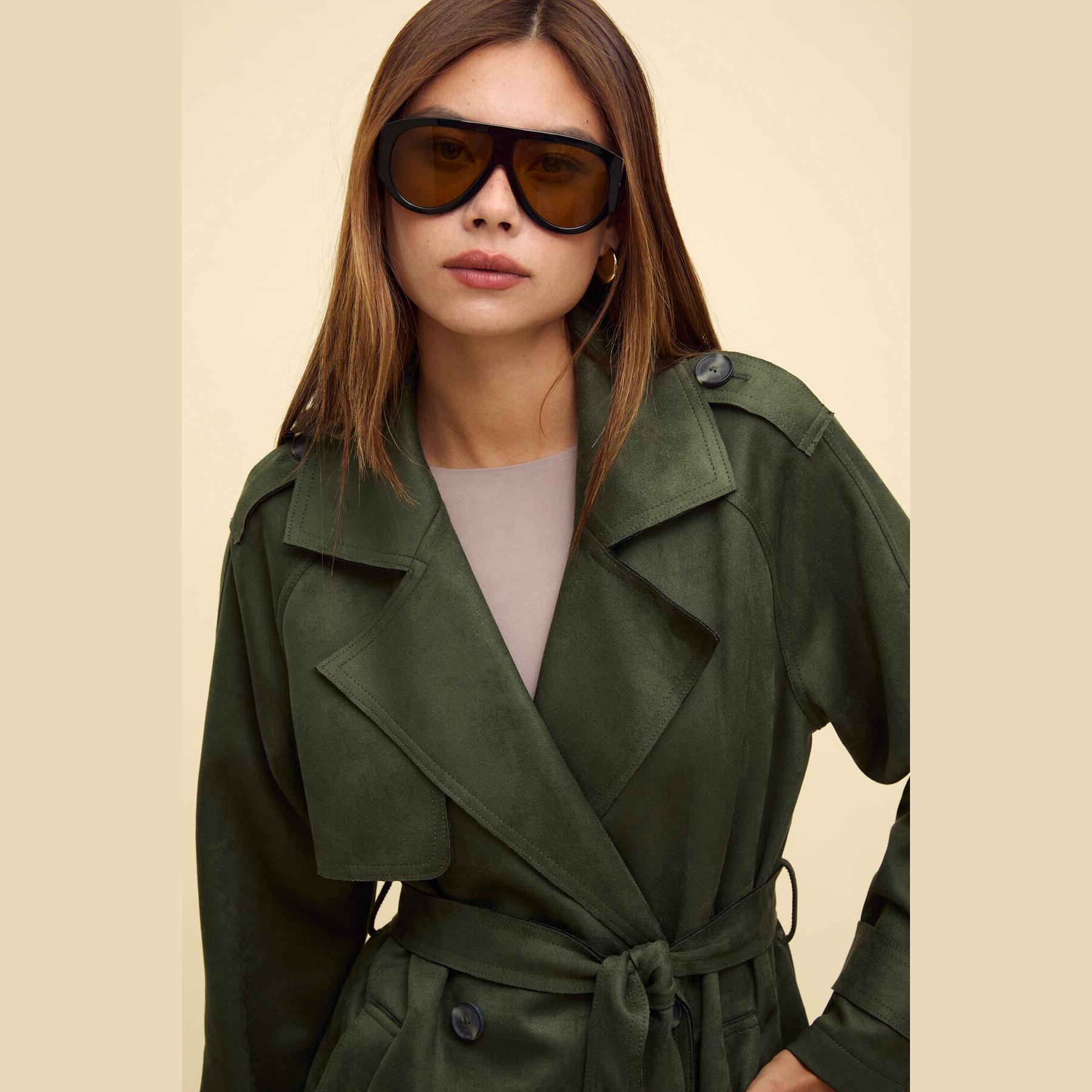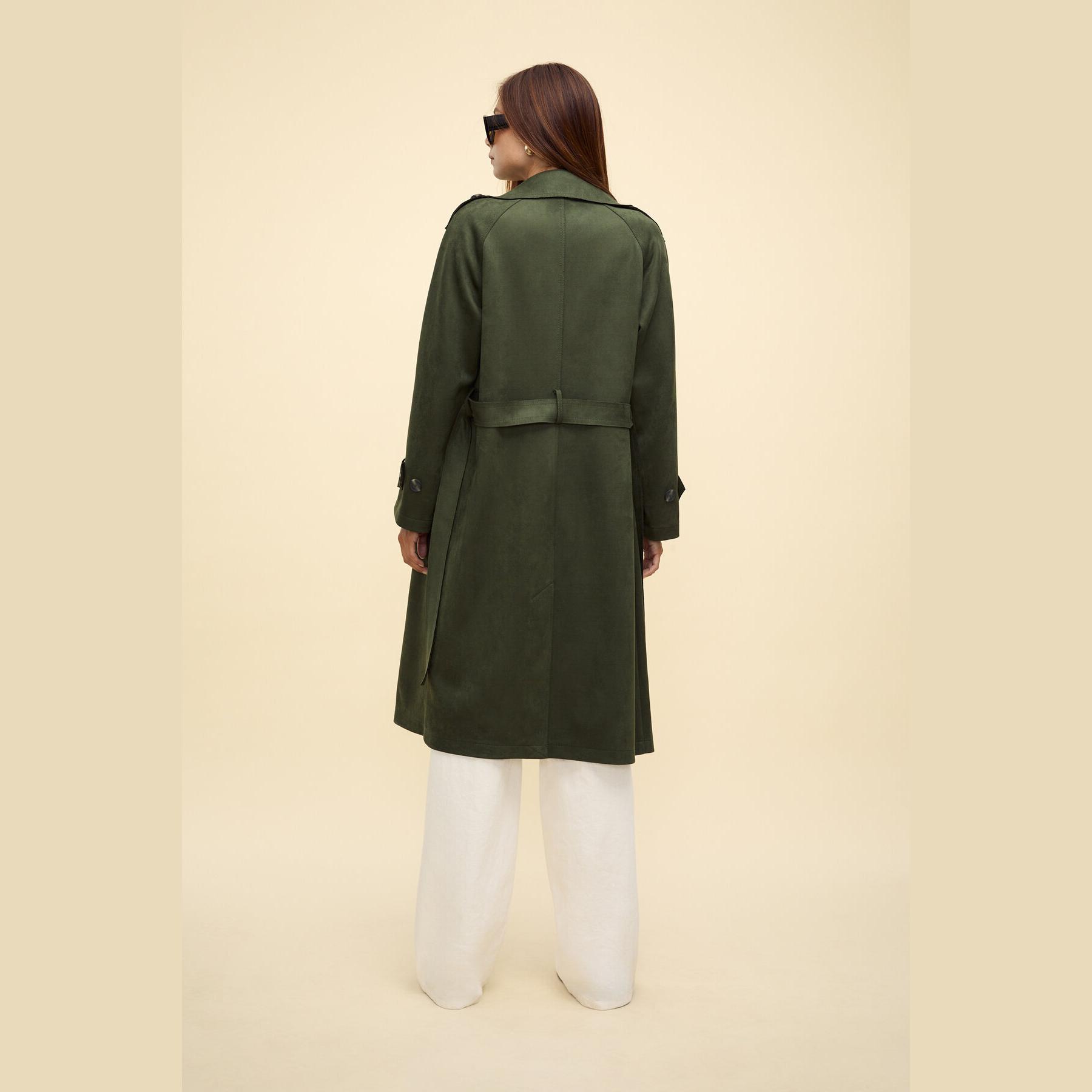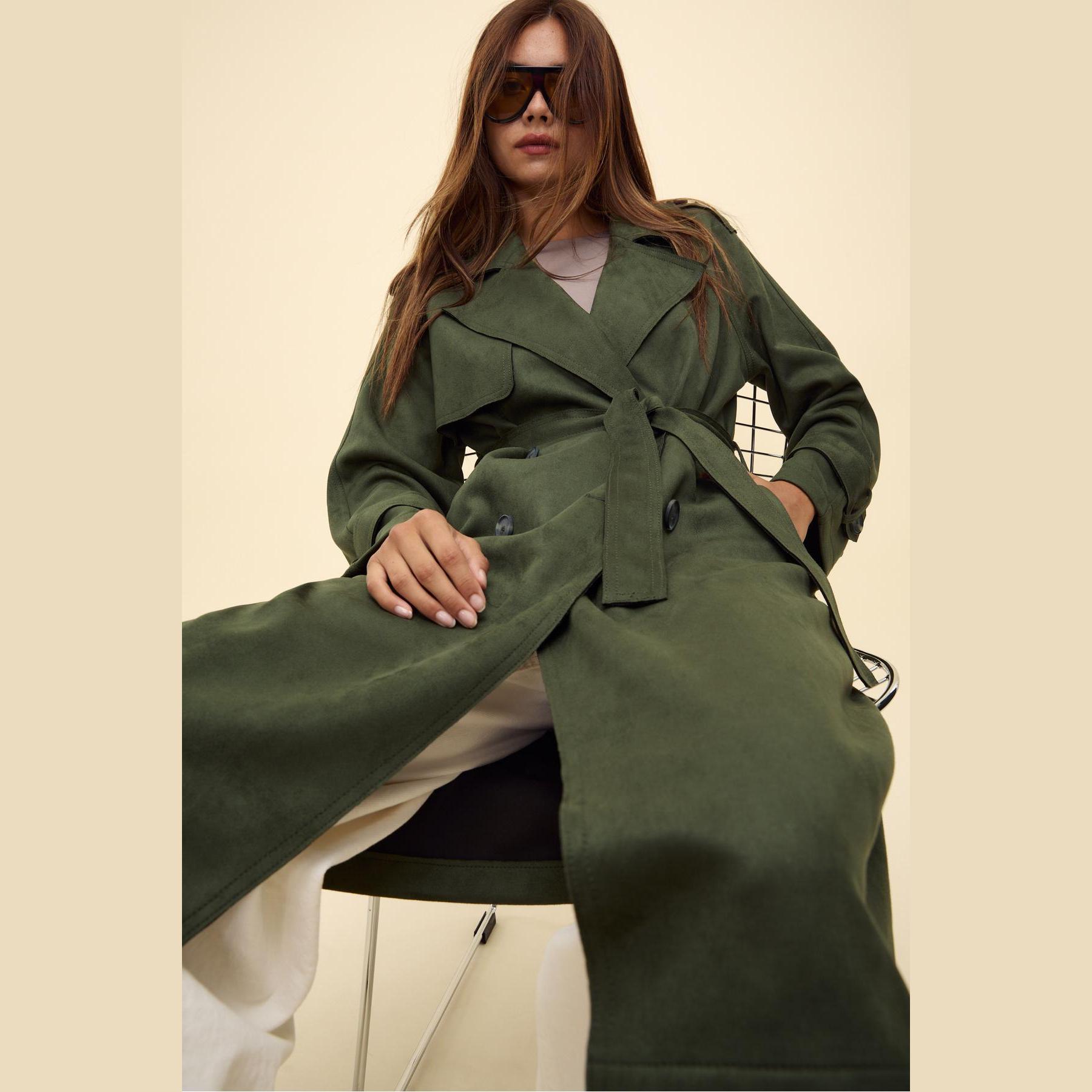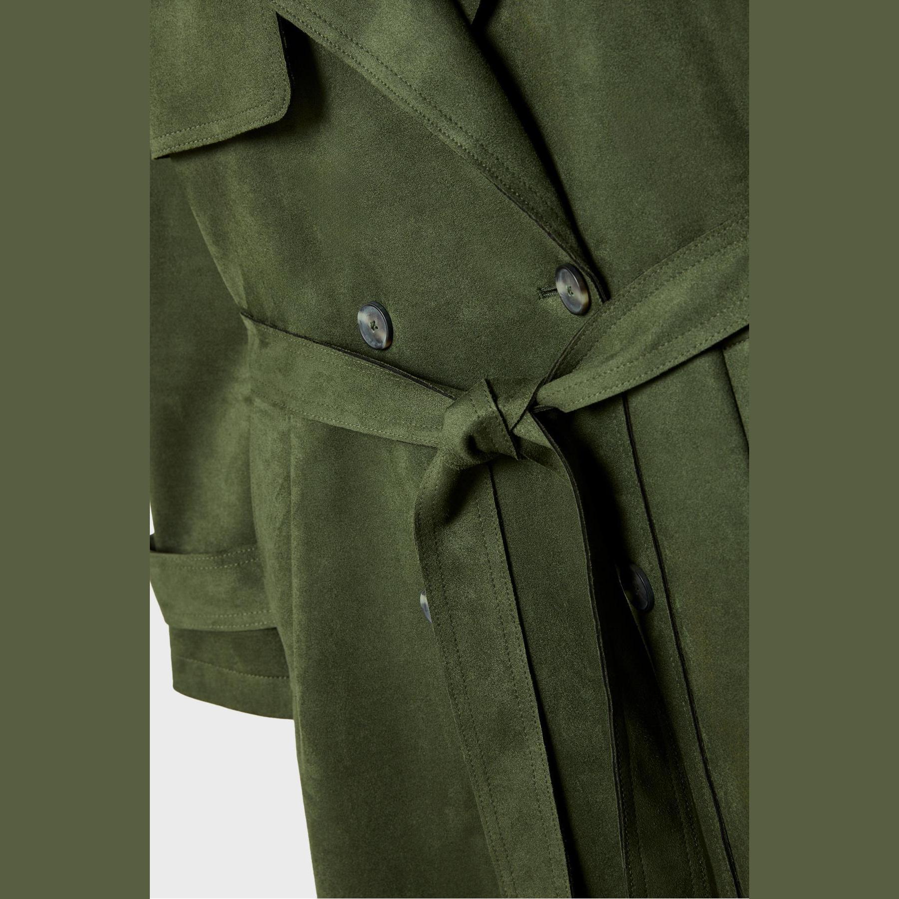 ترنش كوت طويل بملمس الجلد السويدي الصناعي – زيتي داكن من Stradivarius