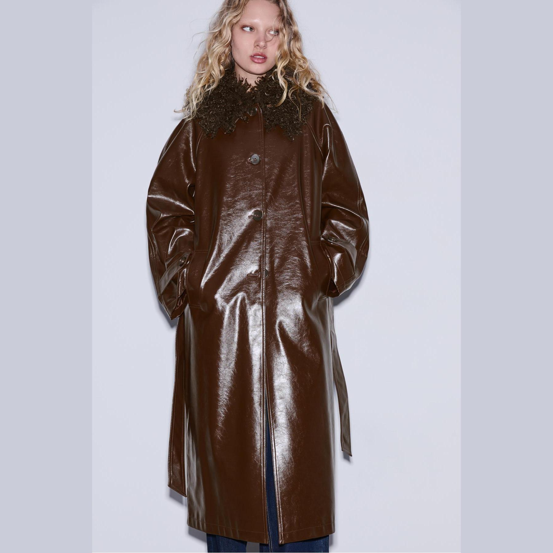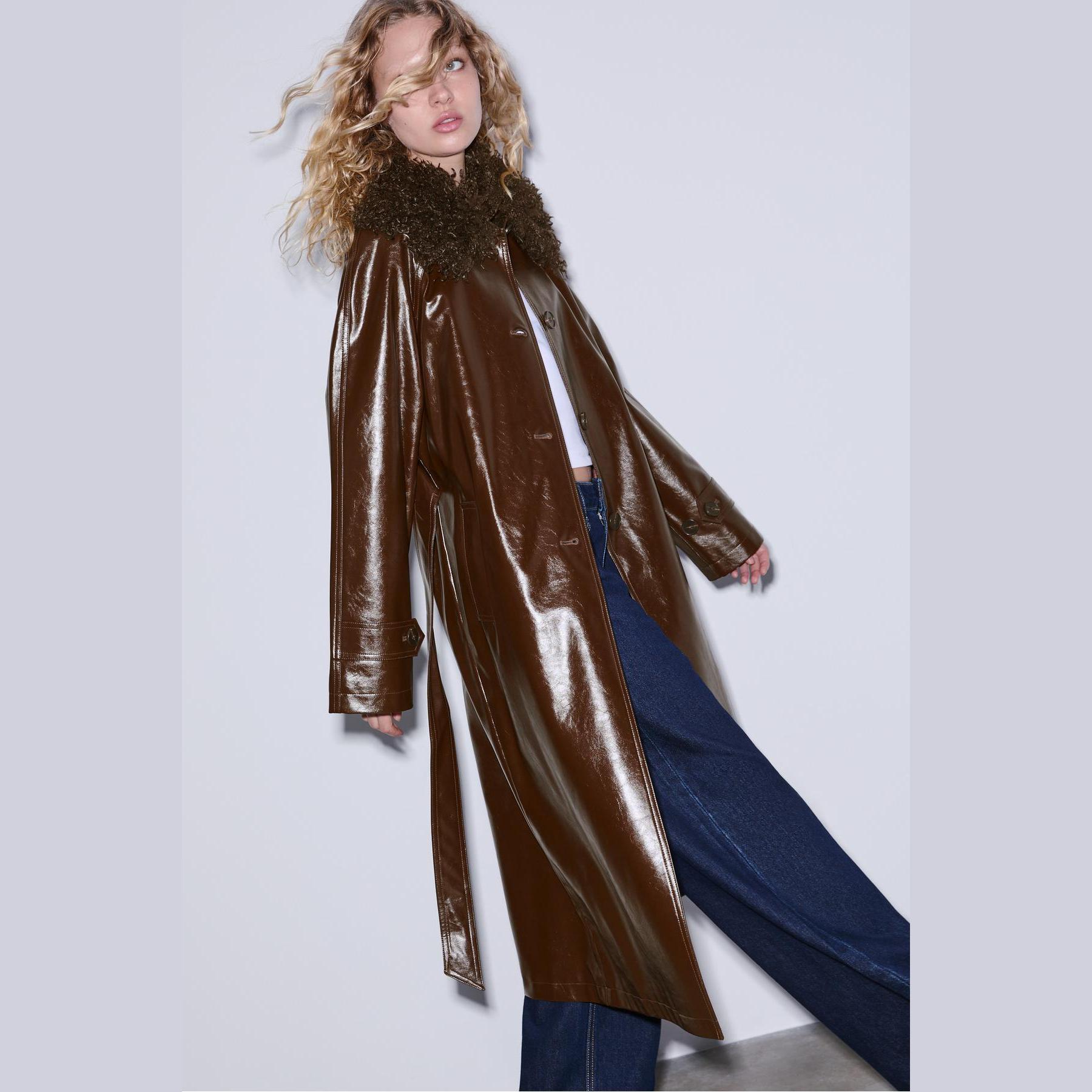 ترنش كوت أنيق من Stradivarius بلون بني، مصنوع من خامة Dokuma بتركيبة 62% بولي يوريثان، 33% فيسكوز، 5% بوليستر، يتميز بقصة Straight Fit، ياقة Dik Yaka عالية مزودة بتفاصيل فرو صناعي قابل للإزالة، أكمام طويلة، إغلاق أمامي بأسلوب Kruvaze بأزرار مزدوجة، مزود بحزام خصر بنفس القماش قابل للإزالة، جيوب جانبية بِييه، تصميم سادة مبطن بالكامل، ملمس ناعم يشبه الجلد الطبيعي، مثالي للتنسيق مع قطع كاجوال أو رسمية لإطلالة انتقالية أنيقة وعملية.