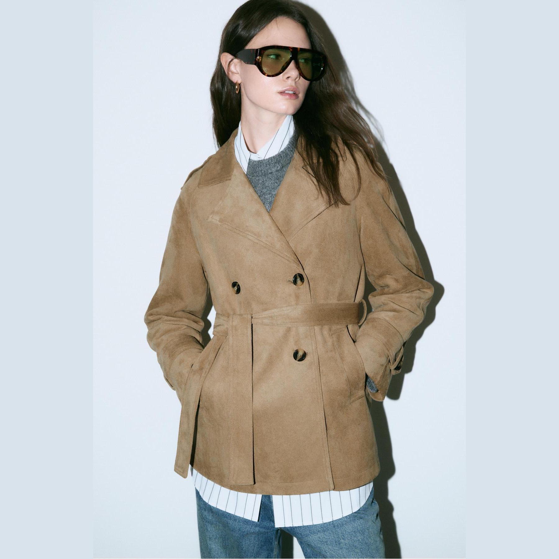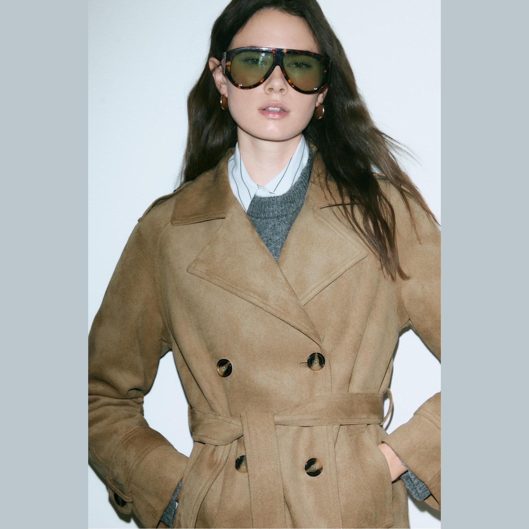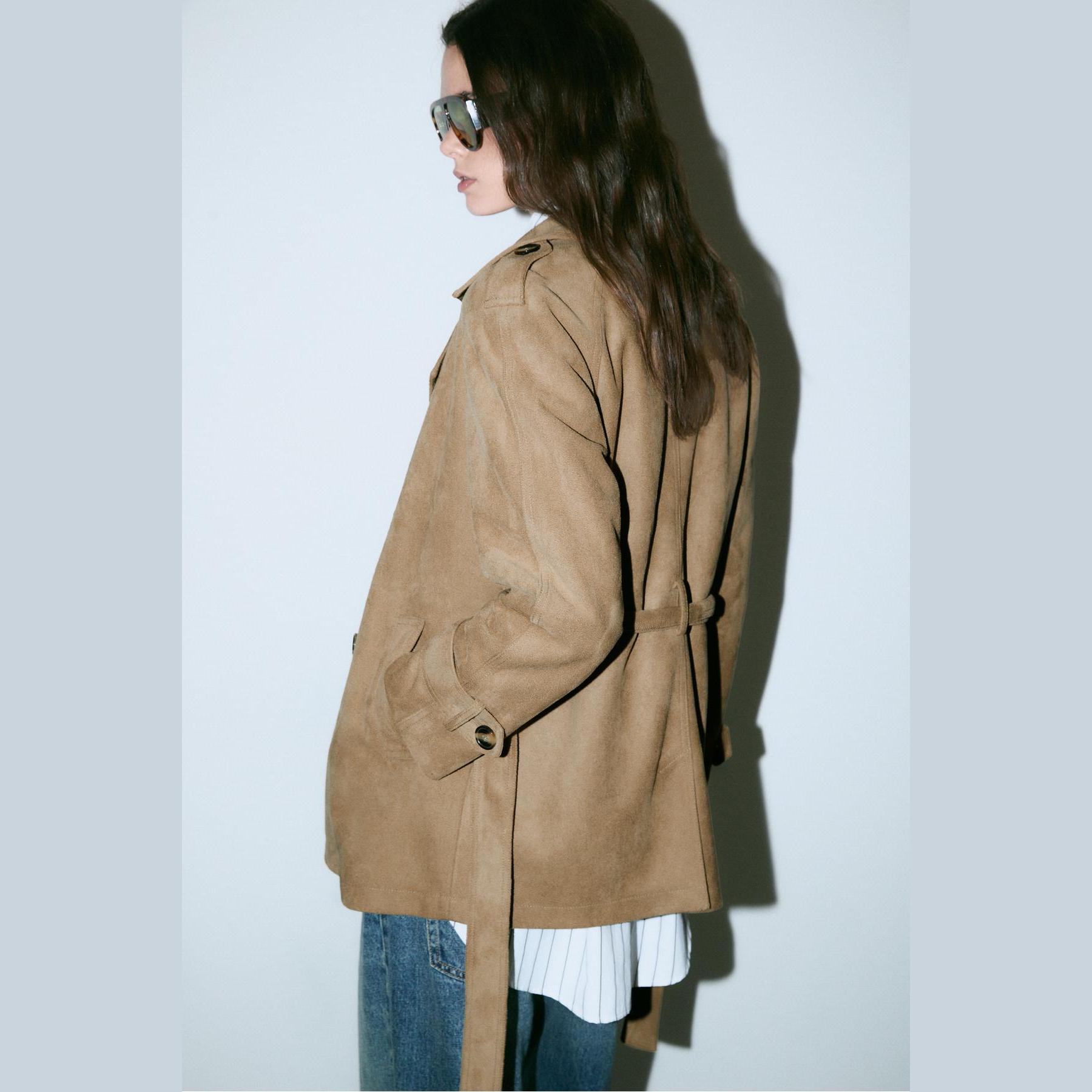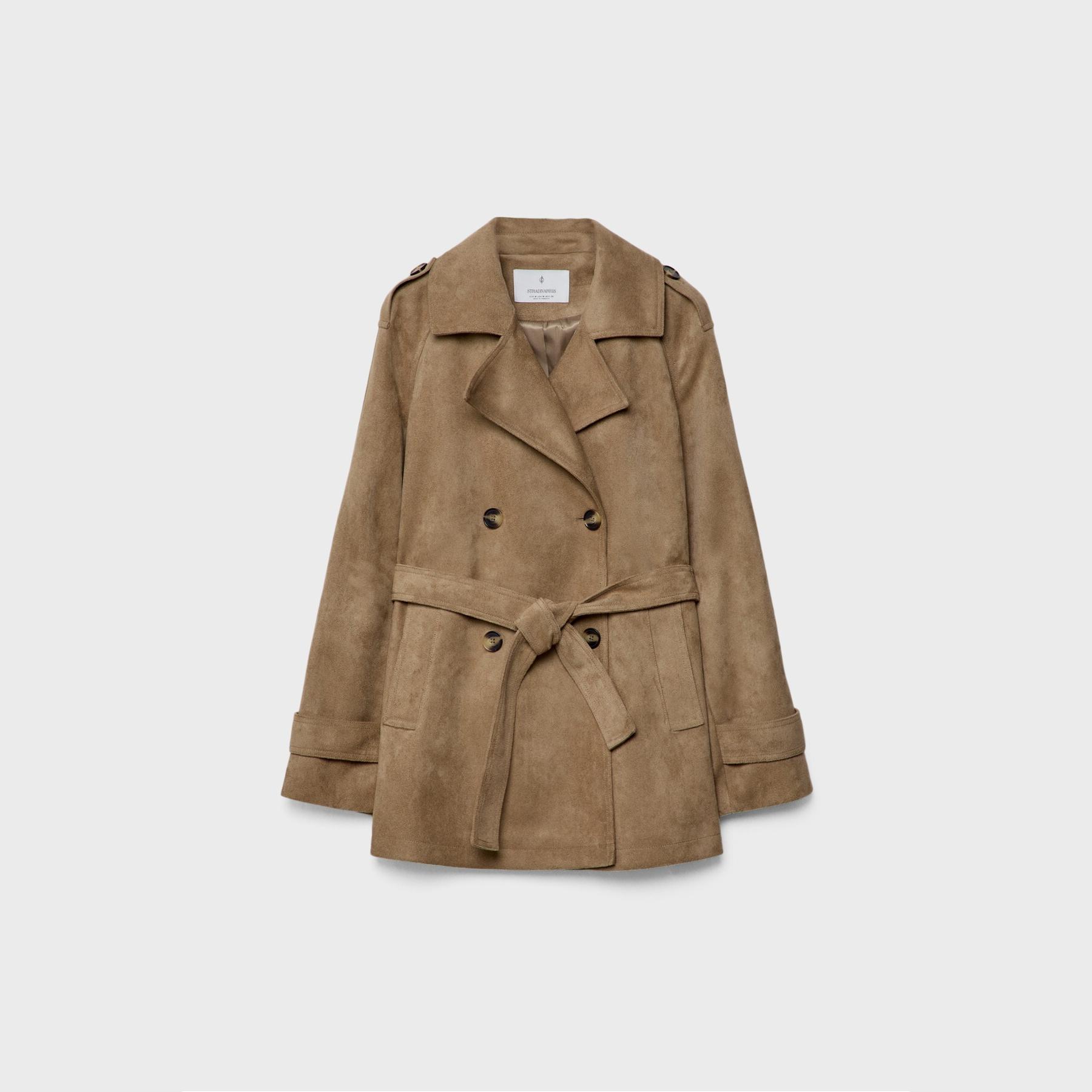 ترنش كوت أنيق من Stradivarius بلون كريمي، مصنوع من خامة Dokuma بتركيبة 100% بوليستر، يتميز بقصة Straight Fit، ياقة Ceket Yaka مزدوجة، أكمام طويلة بكُمّات قياسية، إغلاق أمامي بأسلوب Kruvaze بأزرار مزدوجة، مزود بحزام خصر بنفس القماش قابل للإزالة، جيوب أمامية مخفية، تفاصيل شريطية على الأكتاف والمُعصم، تصميم سادة بدون بطانة، ملمس ناعم يشبه الجلد السويدي، مثالي للتنسيق مع قطع كاجوال أو رسمية لإطلالة انتقالية أنيقة وعملية.