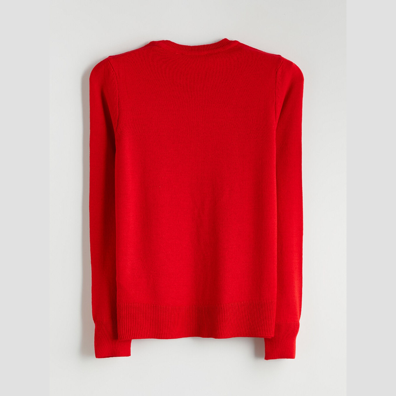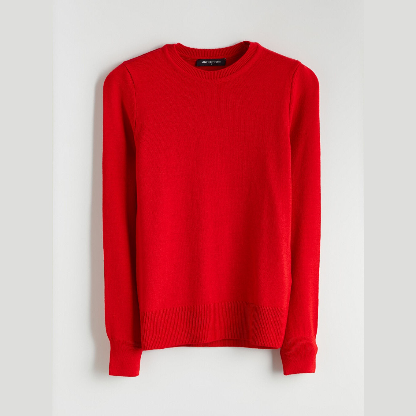 كنزة ناعمة من LC Waikiki Comfort بلون أحمر، مصممة بياقة دائرية (Bisiklet Yaka)، أكمام طويلة، قصة Regular Fit مريحة، خامة تريكو ناعمة مصنوعة بالكامل من ألياف الأكريليك بنسبة 100%، تصميم سادة بدون تفاصيل إضافية، مثالية للتنسيق مع قطع كاجوال أو رسمية لإطلالة خريفية أو شتوية أنيقة وعملية.