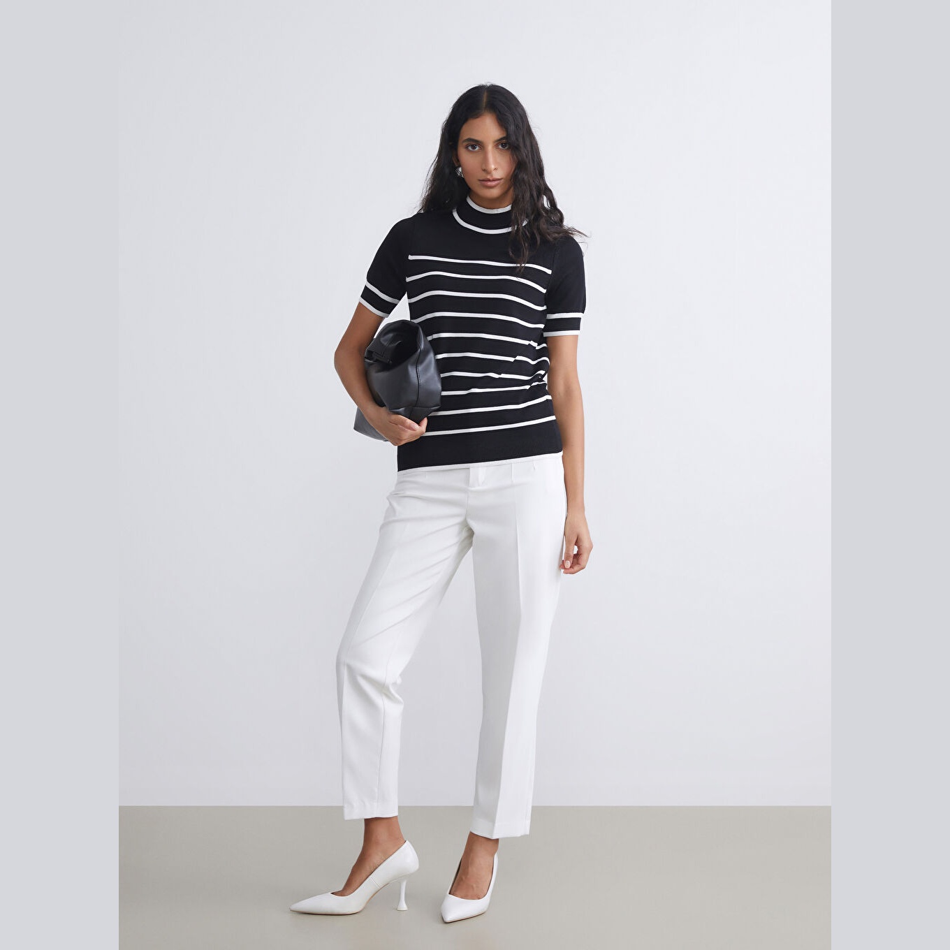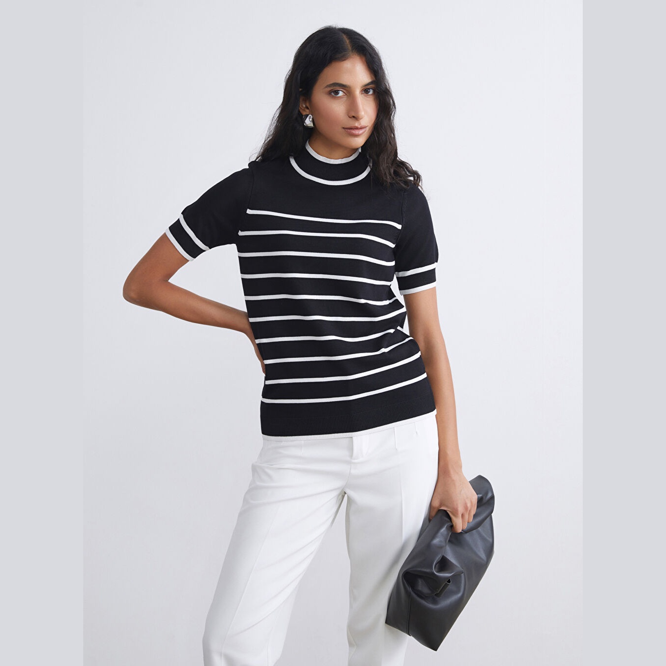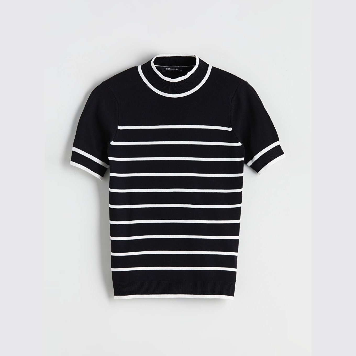 كنزة أنيقة من LCW Modest بلون بيج بنقشة خطوط، مصممة بياقة عالية (Dik Yaka)، أكمام قصيرة، قصة ضيقة (Slim Fit)، خامة تريكو خفيفة مصنوعة من مزيج فسكوز وبوليستر، تمنحك ملمسًا ناعمًا وانسيابية في الحركة. تصميم عصري يناسب الإطلالات اليومية أو العملية، مثالي للتنسيق مع بنطال واسع أو تنورة مستقيمة لإطلالة محتشمة وعصرية.