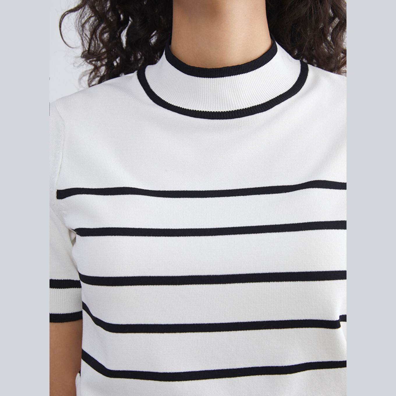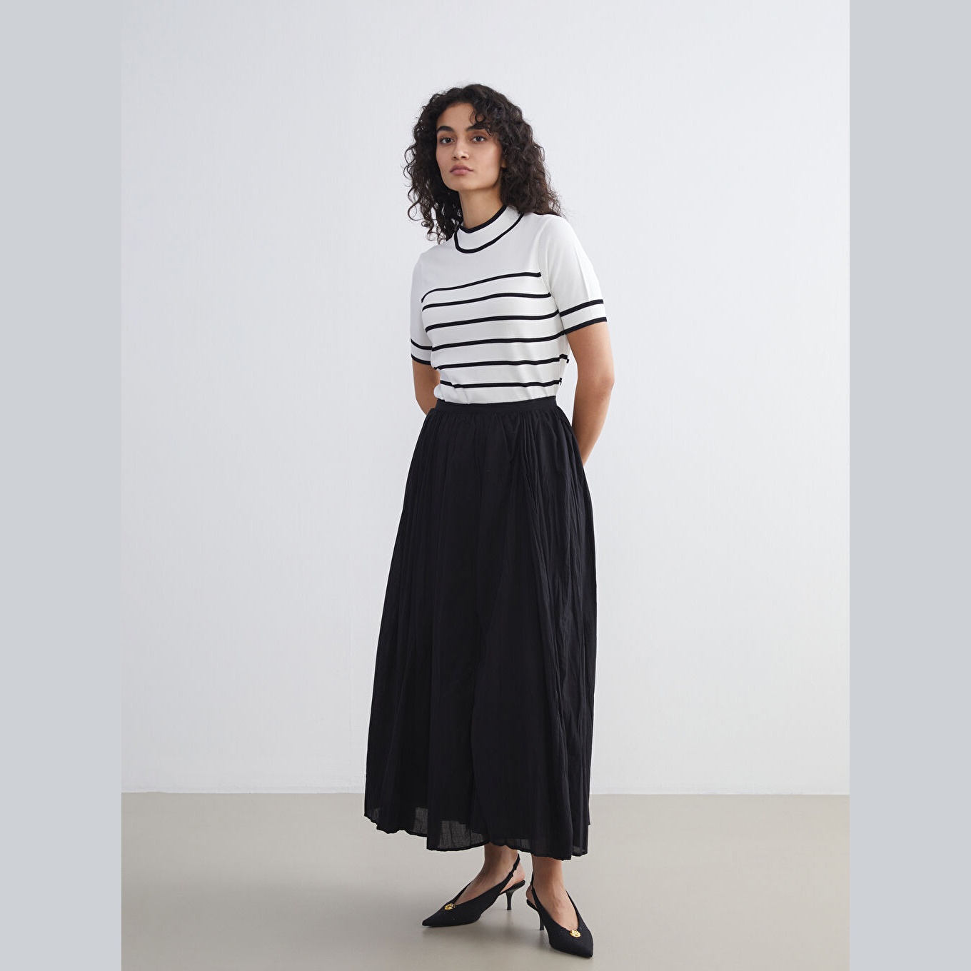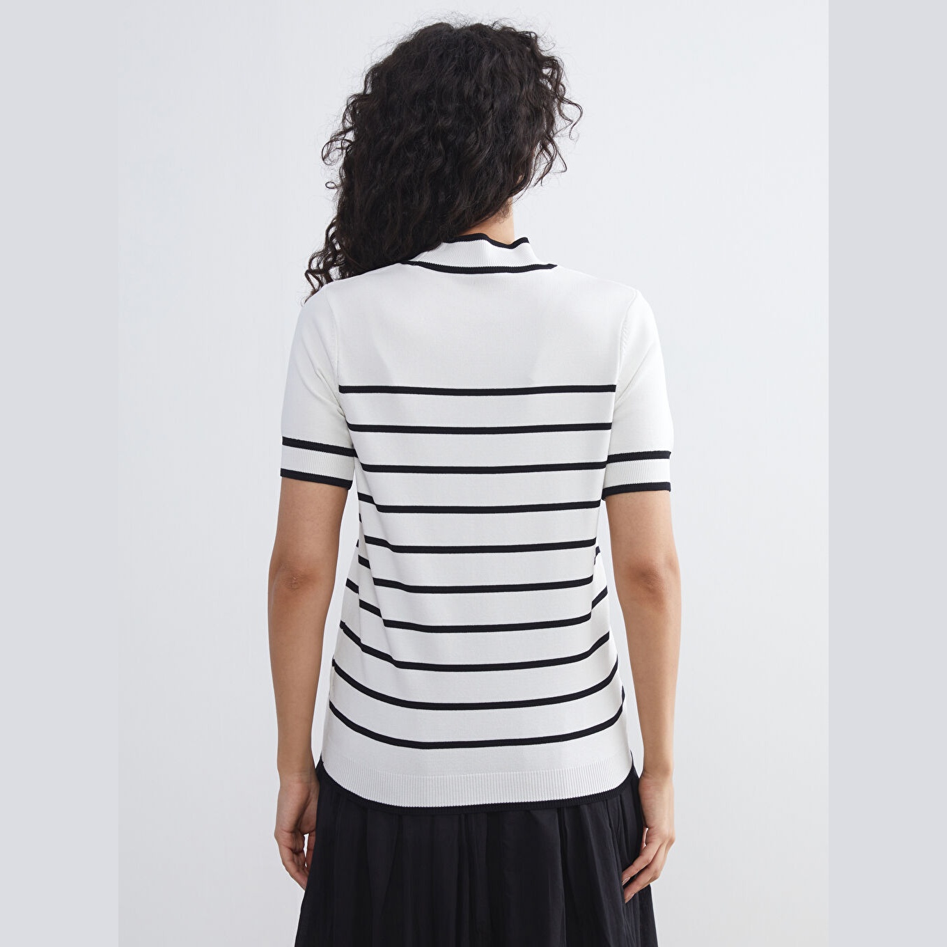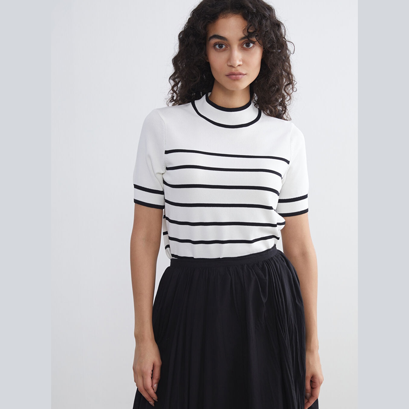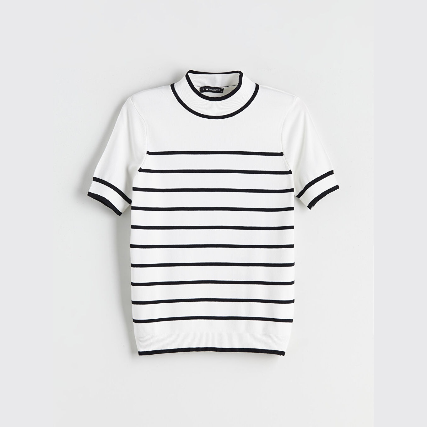 كنزة أنيقة من LCW Modest بلون أسود بنقشة خطوط، مصممة بياقة عالية (Dik Yaka)، أكمام قصيرة، قصة ضيقة (Slim Fit)، خامة تريكو خفيفة مصنوعة من مزيج فسكوز وبوليستر، تمنحك ملمسًا ناعمًا وانسيابية في الحركة. تصميم عصري يناسب الإطلالات اليومية أو العملية، مثالي للتنسيق مع بنطال واسع أو تنورة مستقيمة لإطلالة محتشمة وعصرية.